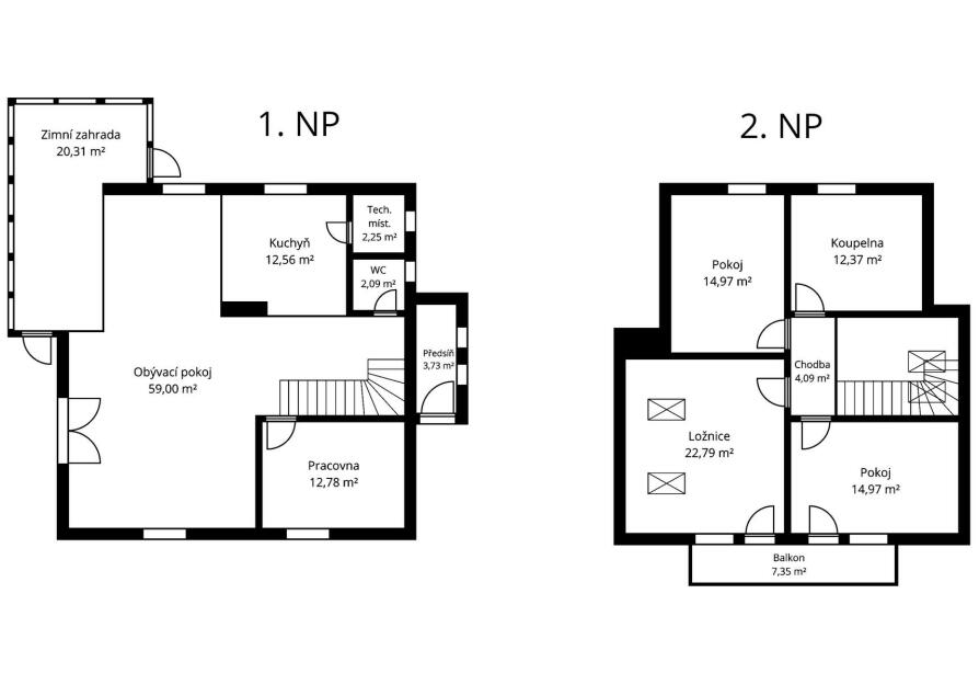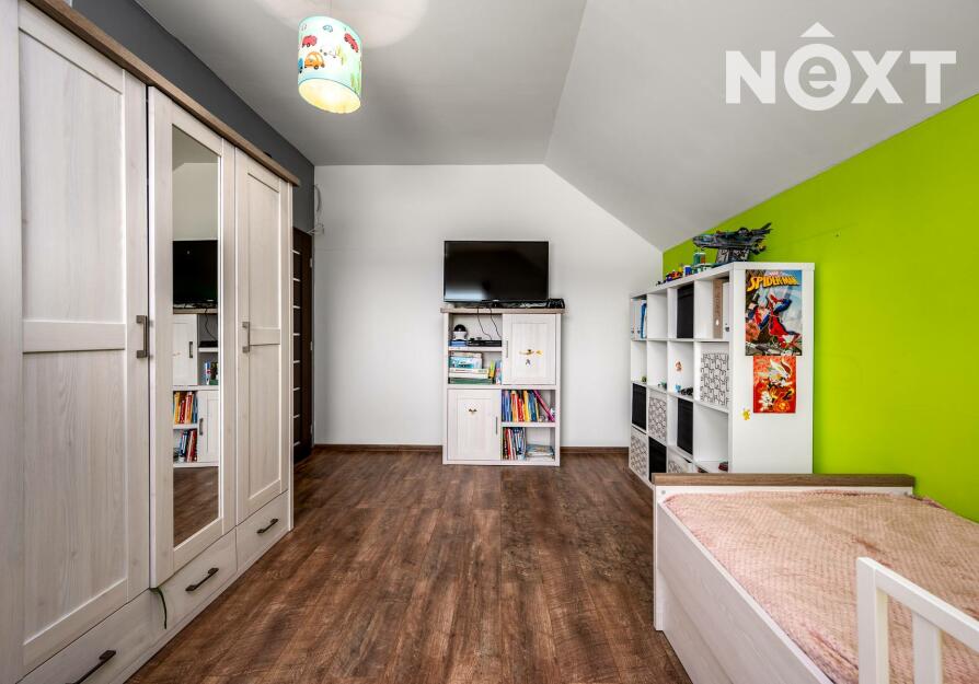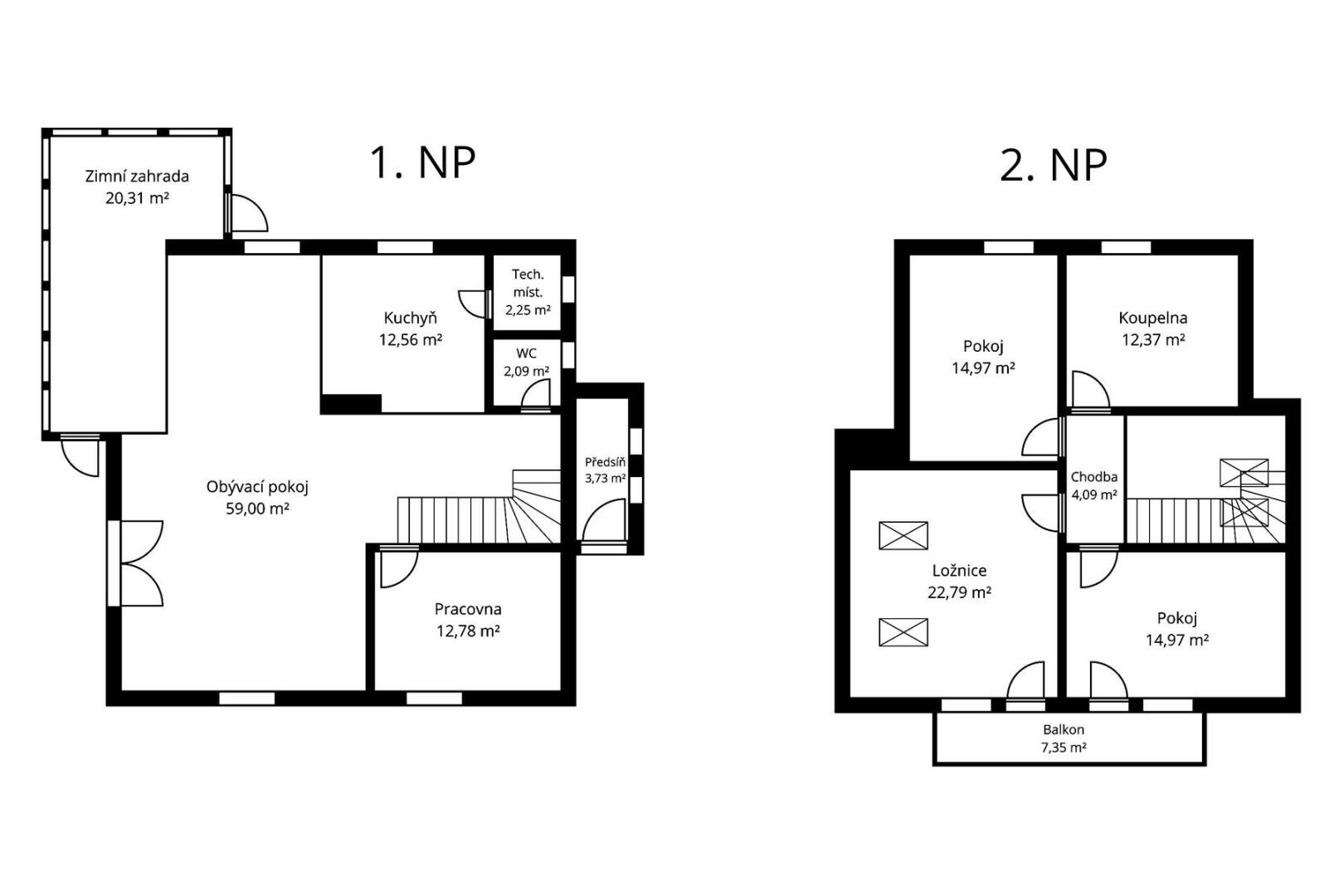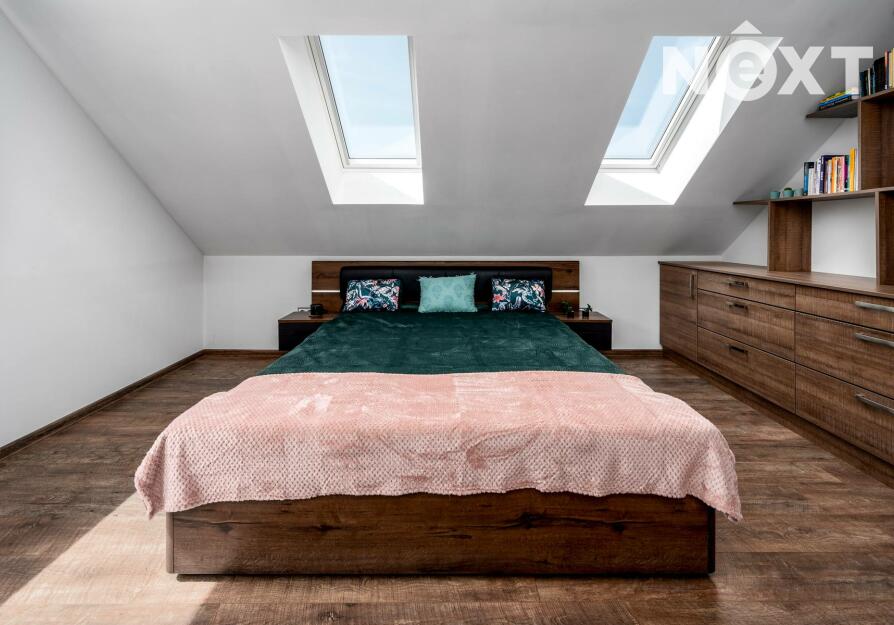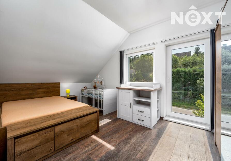 V patře se nachází tři ložnice, koupelna s vanou, sprchovým koutem a toaletou. Ze dvou pokojů je připraven výstup na balkon (nosná konstrukce je již hotová).