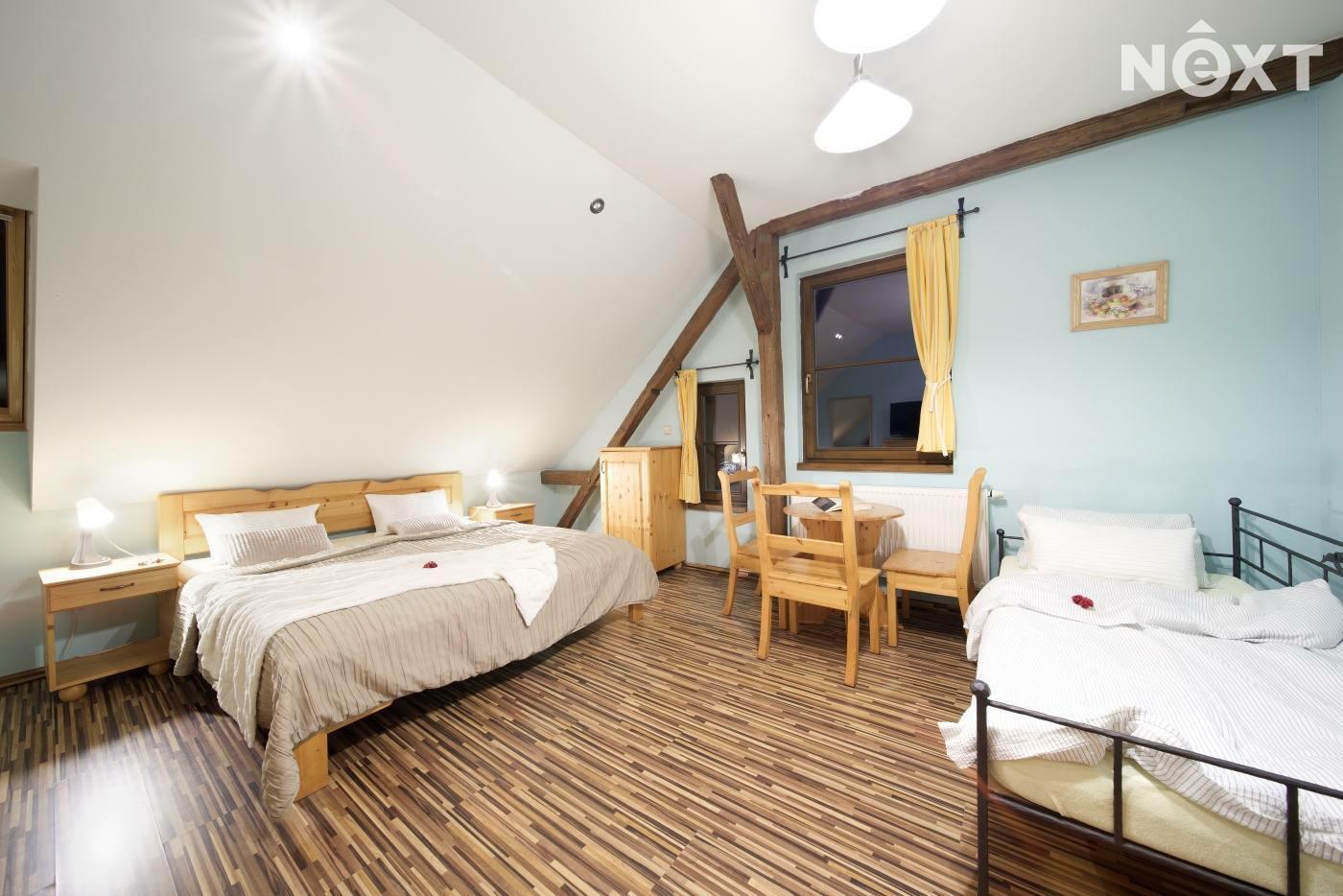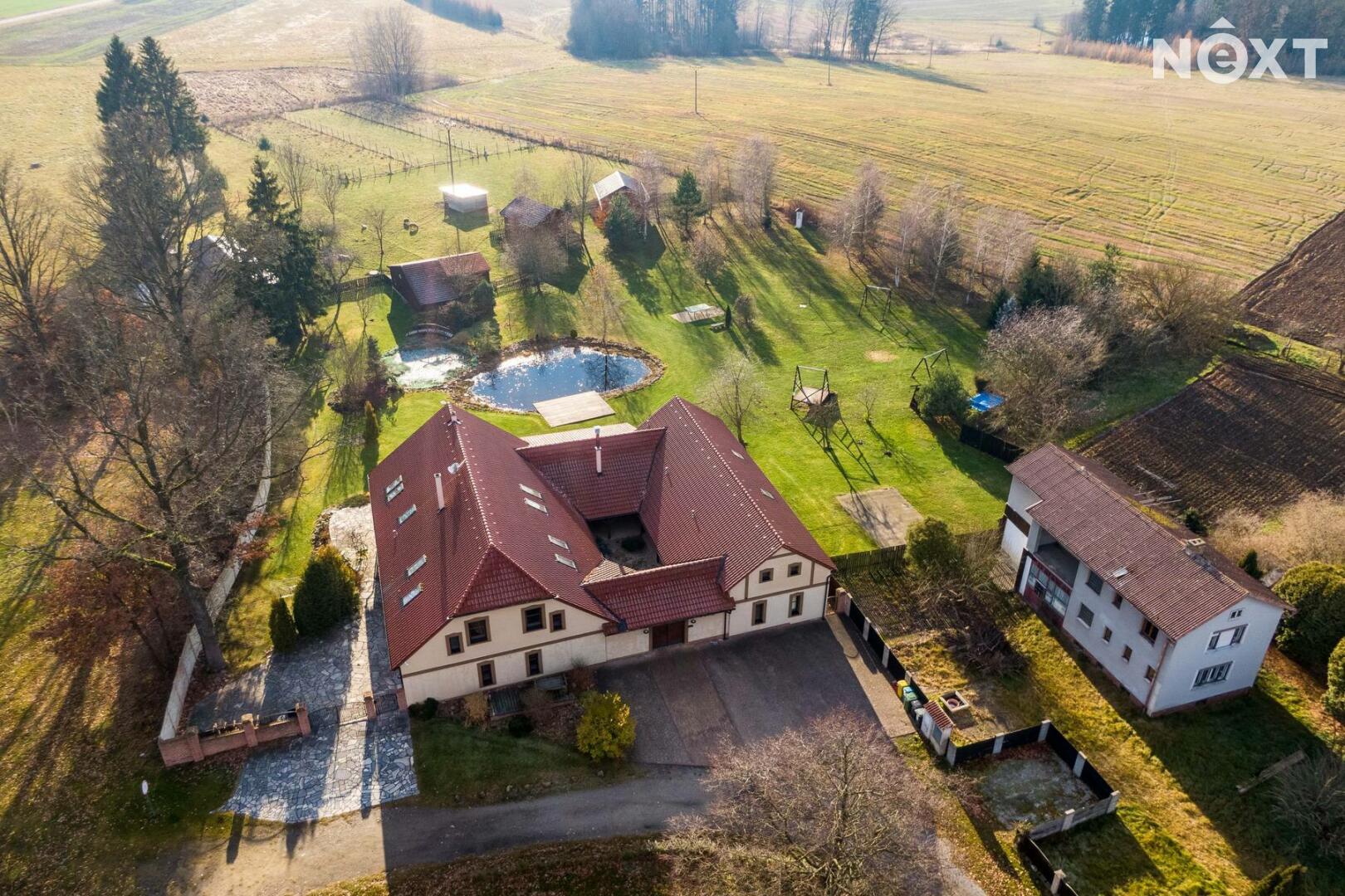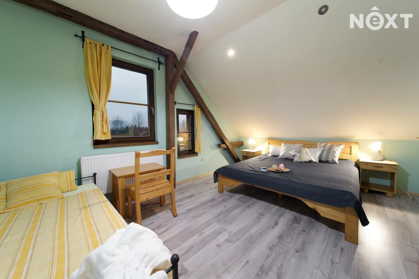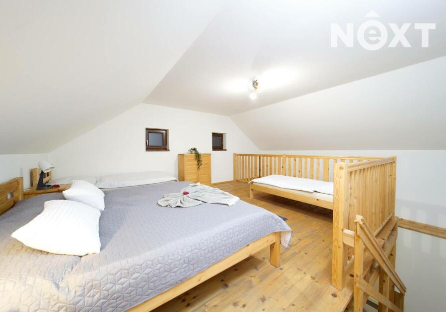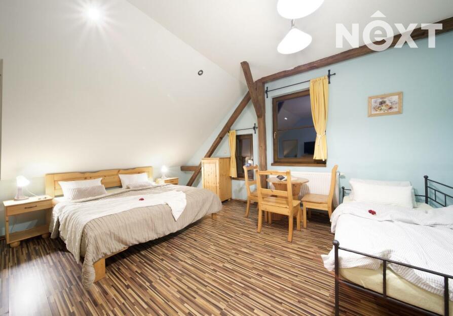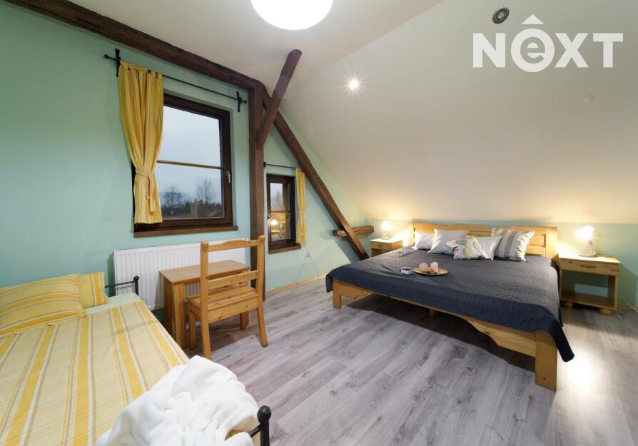 Exkluzivně nabízíme zprostředkování prodej rodinného penzionu v jižních Čechách v obci Zdešov. Celý komplex byl vybudován a je v provozu od roku 2010. V hlavní budově se nacházejí tři prostorné apartmány se sociálním zařízením s kapacitou 12 lůžek, v přízemí budovy je společenská místnost a kuchyně s krbem a kachlovými kamny. V přízemí je také technické zázemí penzionu a prostorná garáž. Ve vedlejší budově, kam je přístup přes otevřený vnitroblok se nacházejí další čtyři apartmány s vlastním sociálním zařízením a kuchyňským koutem o celkové kapacitě 16 lůžek. Obě budovy jsou propojeny stavbou, která uzavírá vnitroblok a kde se nachází letní kuchyň s krbem a zázemím se vstupem na jižně orientovanou zahradu. V zahradě se nacházejí dva bungalovy, každý o užitné ploše cca 45m2, dispozici 3+KK s vlastním sociálním zařízením, kuchyňským koutem a terasou s výhledem do zahrady. Každý srub má kapacitu 4 lůžka. Celkový počet lůžek může být až 42 včetně přistýlek. Celková užitná plocha objektu je 830m2. V zahradě se nachází koupací biotop, dětské hřiště s celou řadou atrakcí, pin pong, houpačky, lanovka a celá řada dalších. Na pozemcích jsou dále vybudovány výběhy pro ovce včetně stájí, voliéry pro ptáky, výběhy pro slepice a další zvířata. Vzhledem k rozloze pozemků je toto místo ideální i pro chov koní. Celý komplex je vybudován na pozemcích o celkové rozloze 56.448m2 a další polnosti o výměře 37.475m2 se nacházejí na úpatí Němcova kopce. Vytápění penzionu je řešeno kotlem na dřevo s akumulační nádrží, v kombinaci s elektrickým vytápěním. Je připravený projekt na vybudování dalších ubytovacích kapacit včetně snídaňové restaurace a zázemí. Kapacita dalšího ubytování je plánována na min. 20 lůžek. Areál je vhodný nejen pro trávení klidné dovolené, ale také pro pořádání svateb, rodinných oslav, firemních pobytů a školení. V okolí naleznete celou řadu kulturních i přírodních zajímavostí a památek. Toto místo je ideální pro sportovní i turistické aktivity. V dojezdové vzdálenosti do 30 minut je celá řada jihočeských skvostů, jako je město Telč, Pelhřimov, Třeboň, zámek Jinřichův Hradec, Kamenice nad Lipou a celá řada dalších. Zkrátka ideální výchozí pozice pro poznávání Jižních Čech. Pro komunikaci uvádějte evidenční číslo zakázky N109324.