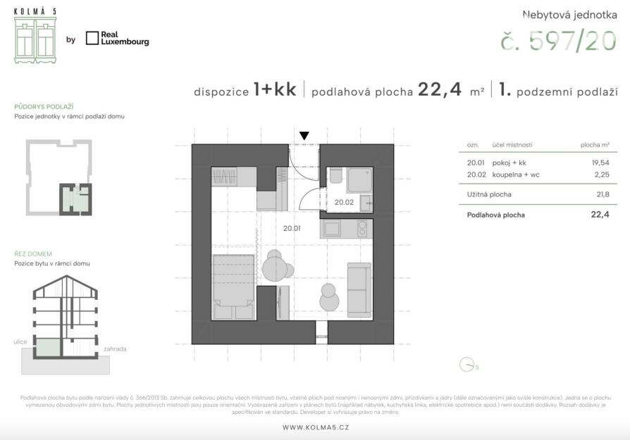 Tato konkrétní jednotka č.20 o dispozici 1kk a podlahové ploše 22,4 m2 se nachází v 1 podzemním podlaží s výhledem do ulice. Přesné rozložení si můžete prohlédnout na přiloženém půdorysu. Vytápění je řešeno elektrickými přímotopy a ohřev vody elektrickým bojlerem.