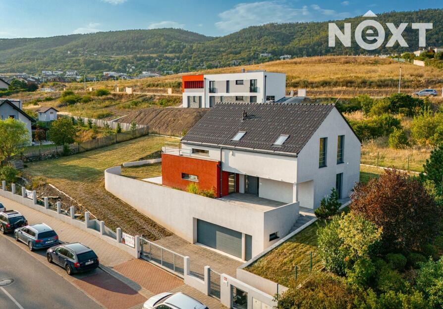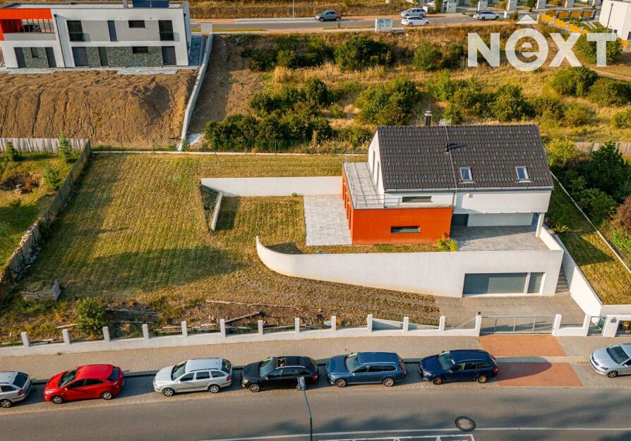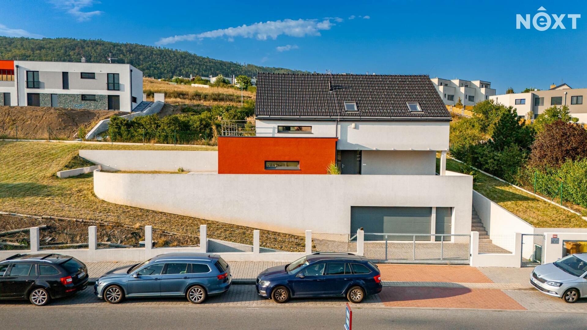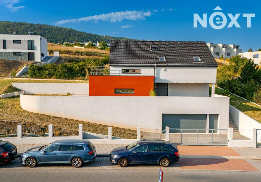 Dům má dispozici 5kk a velkorysou plochu 213 m². Ve dvou patrech najdete vše, co moderní rodina potřebuje – od vzdušného obýváku s kuchyní přes tři ložnice a pracovnu až po dvě koupelny.