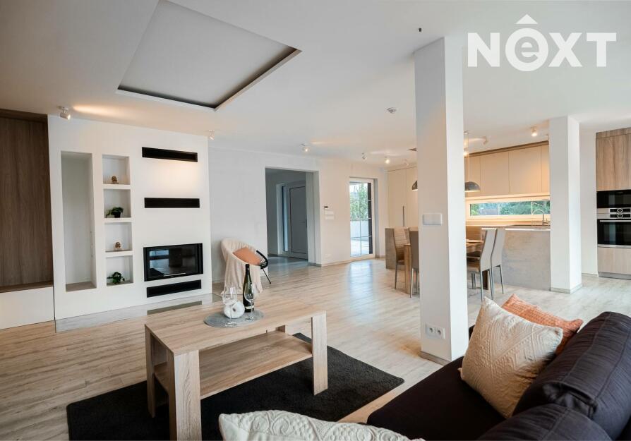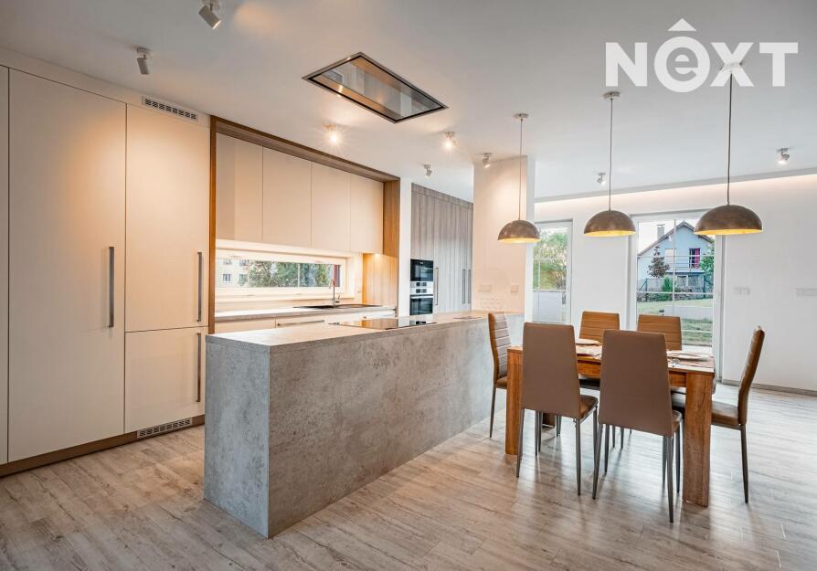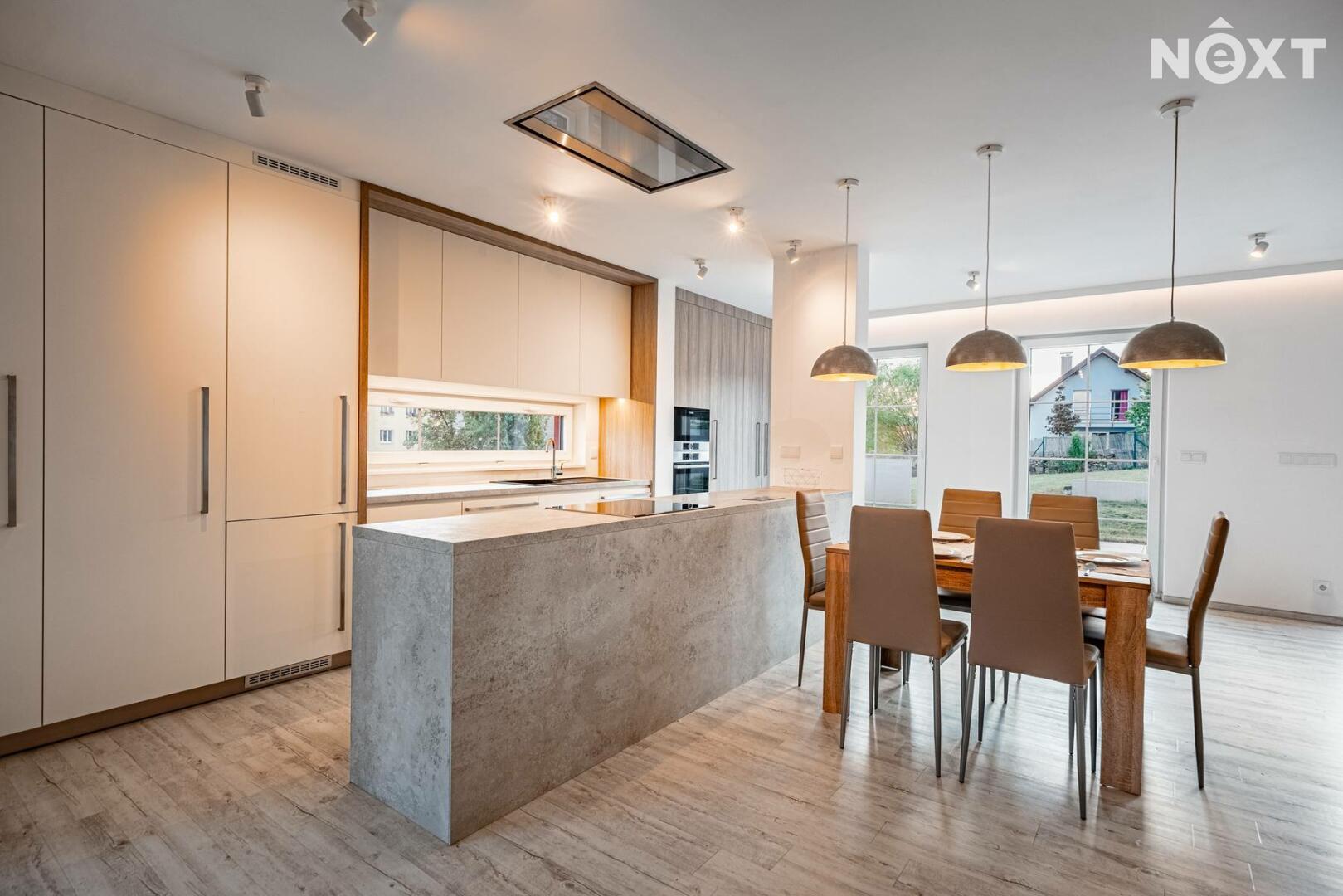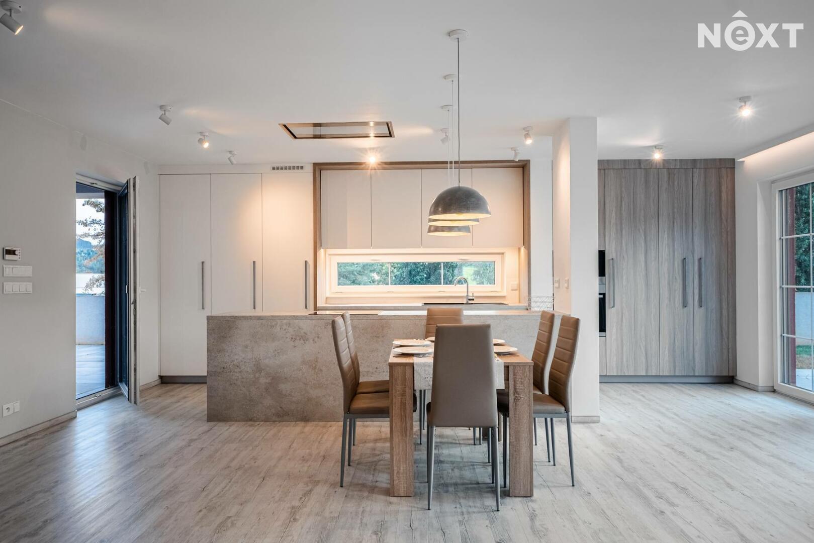 Obývací pokoj s jídelnou a luxusní kuchyní na míru vás nadchne. Velká francouzská okna ho zalévají přirozeným světlem a propojují s venkovní terasou – stačí otevřít a hranice mezi domem a zahradou zmizí. A za chladných večerů vám atmosféru doladí praskající krb.