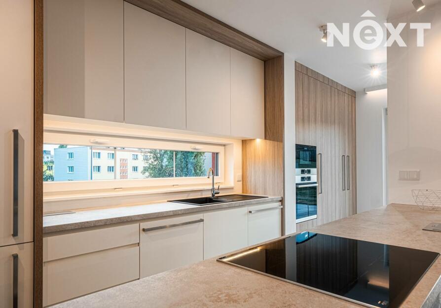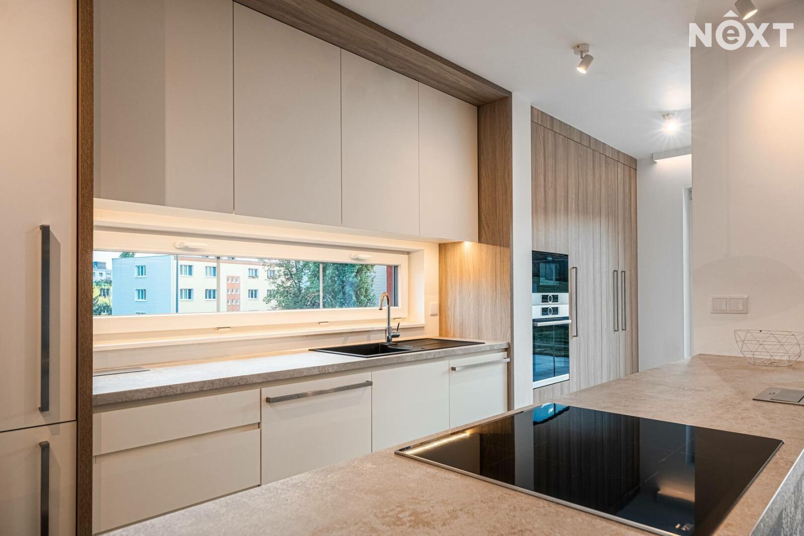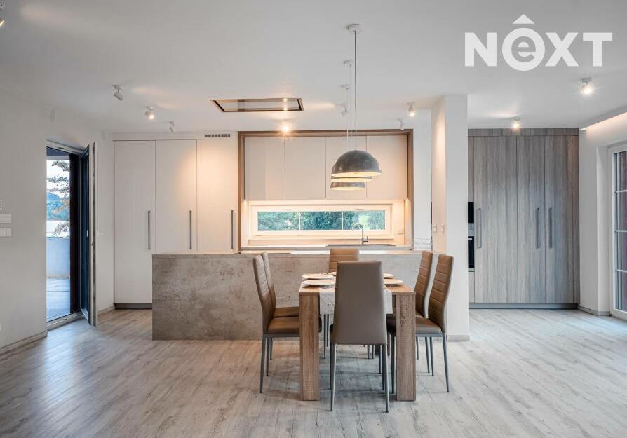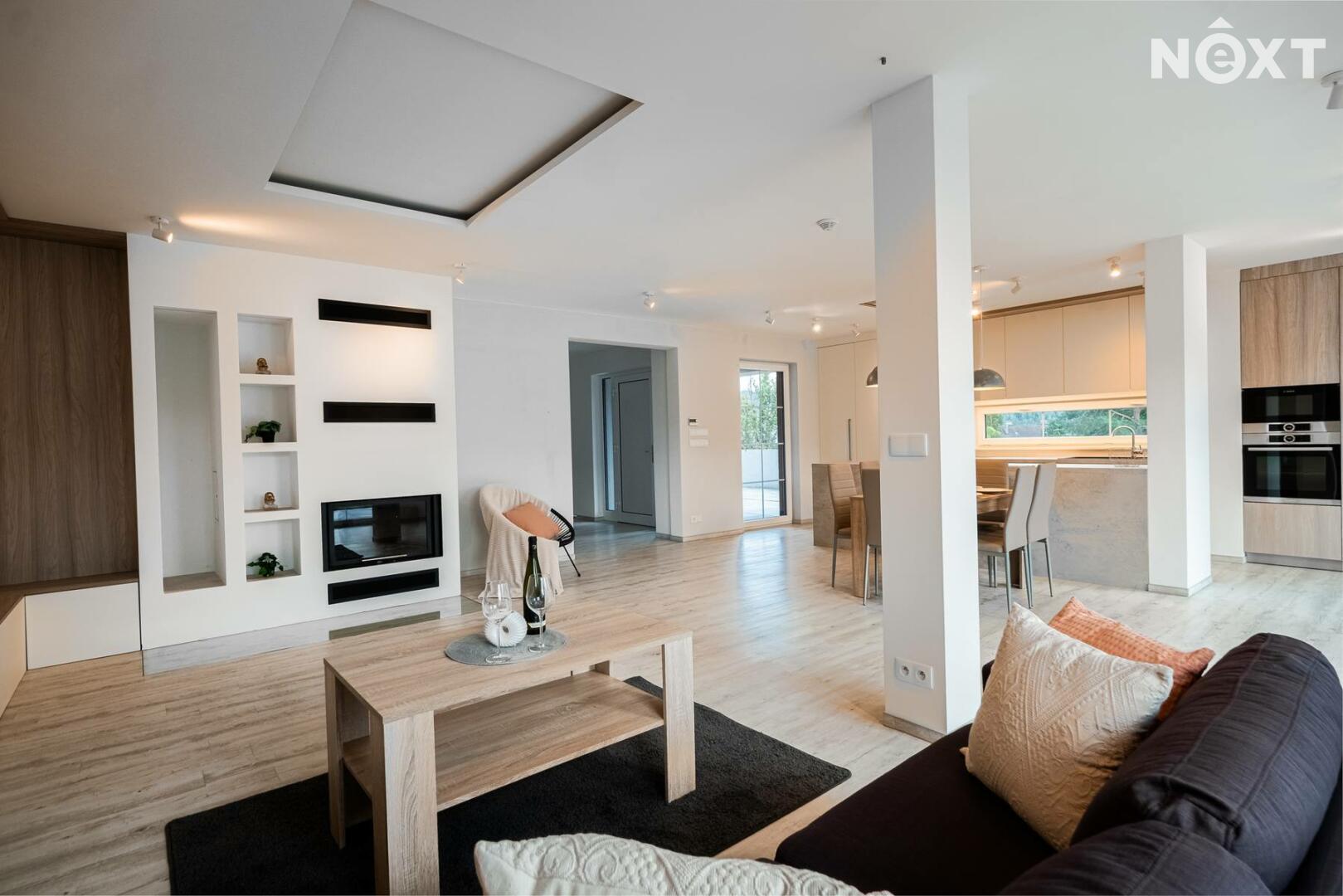 Obývací pokoj s jídelnou a luxusní kuchyní na míru vás nadchne. Velká francouzská okna ho zalévají přirozeným světlem a propojují s venkovní terasou – stačí otevřít a hranice mezi domem a zahradou zmizí. A za chladných večerů vám atmosféru doladí praskající krb.