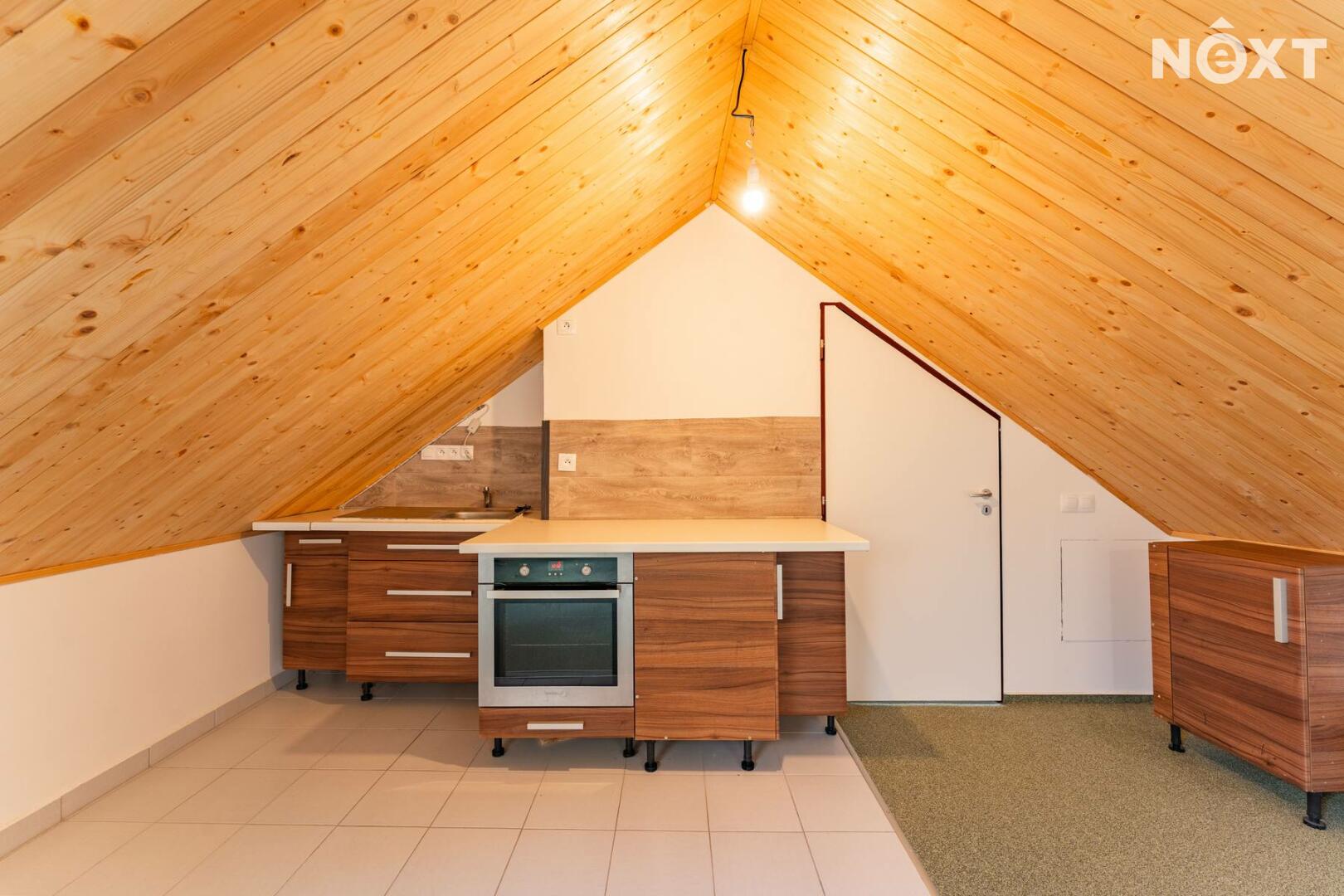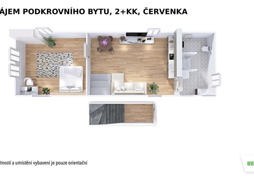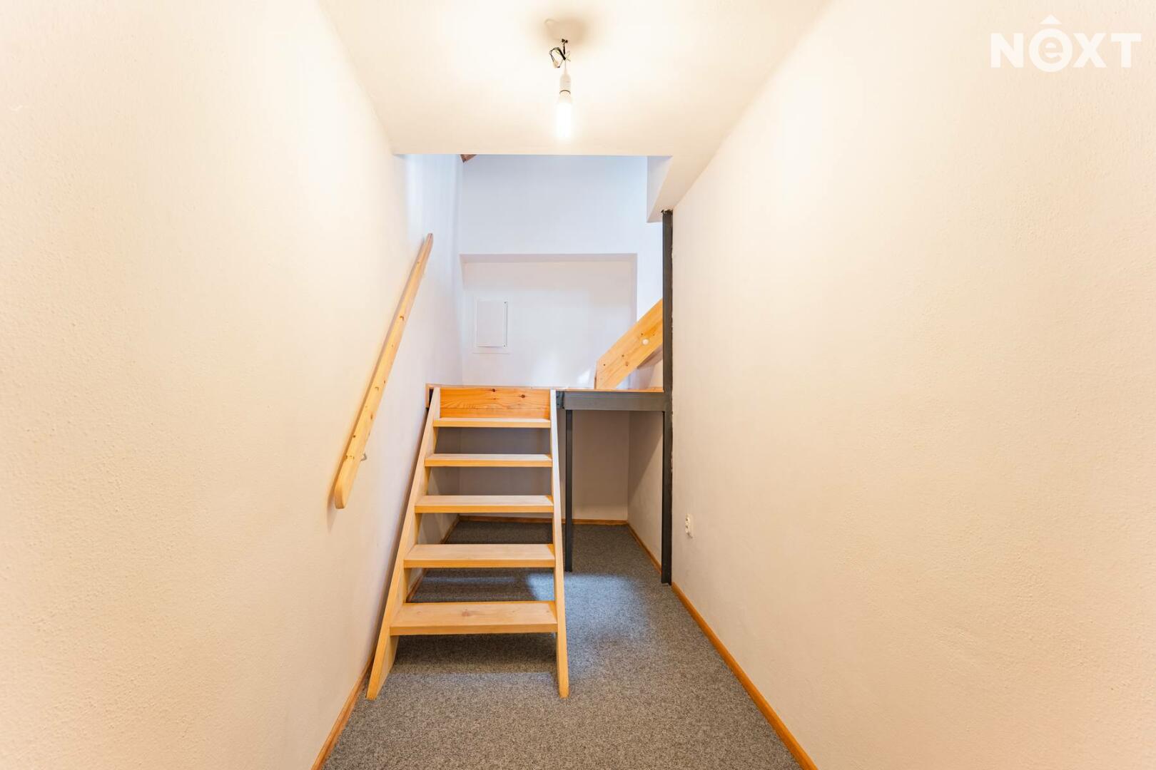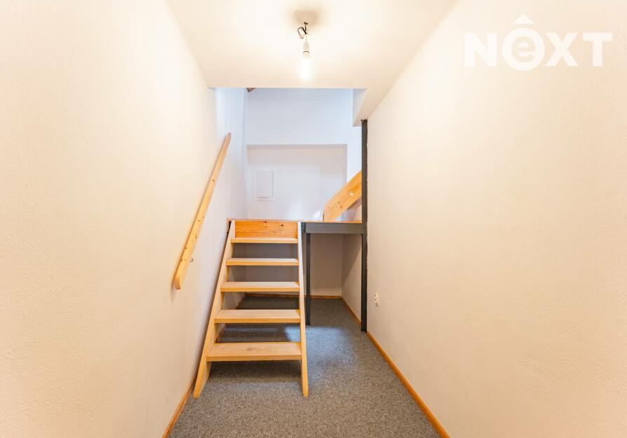 Po vstupu do bytu se ocitnete v chodbě, odkud vede elegantní dřevěné schodiště do hlavní obytné části. Ta nabízí vzdušný prostor s kuchyní propojenou s obývacím pokojem, ze kterého se vstupuje do prostorné koupelny s toaletou a samostatné ložnice. Byt je ideální volbou pro jednotlivce nebo pár, kteří hledají útulné a funkční bydlení s příjemnou atmosférou.