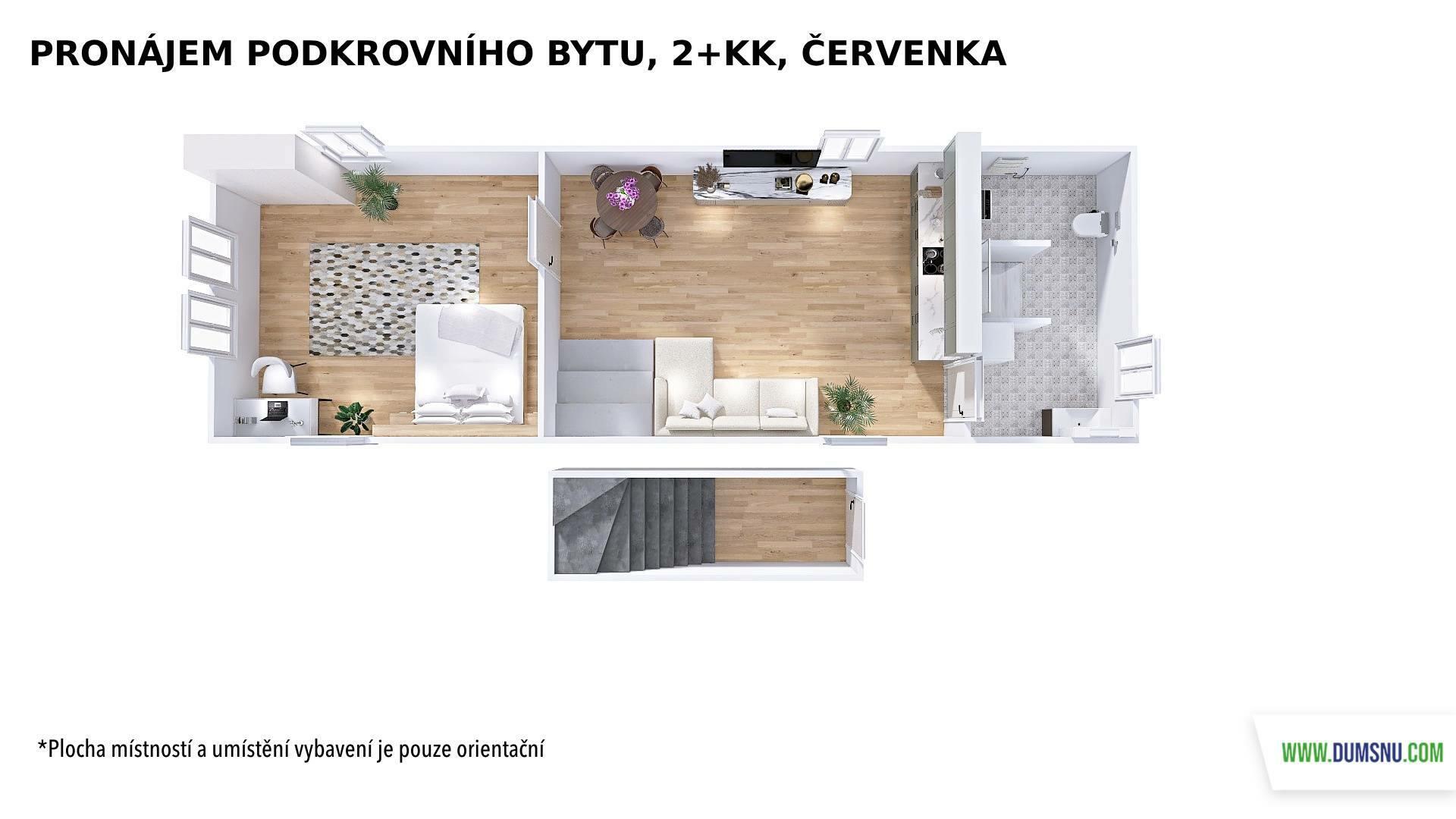 Nabízíme k pronájmu prostorný, zrekonstruovaný podkrovní byt o dispozici 2+kk a výměře cca 74 m². Nachází se ve 2. nadzemním podlaží rodinného domu v klidné části obce Červenka, na ulici Svatoplukova.