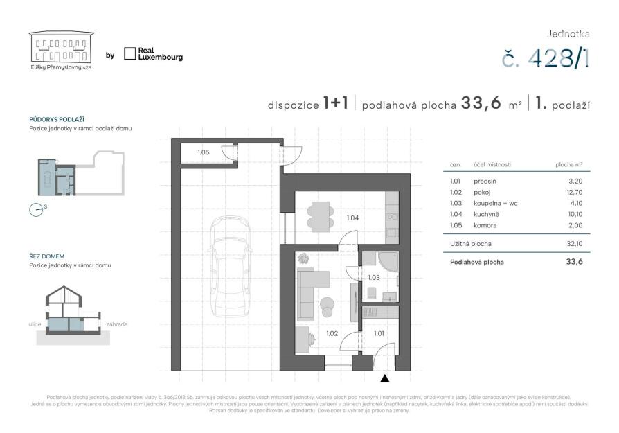 Moderní 1+1 (32 m²) s parkovacím stáním a zděnou komorou.