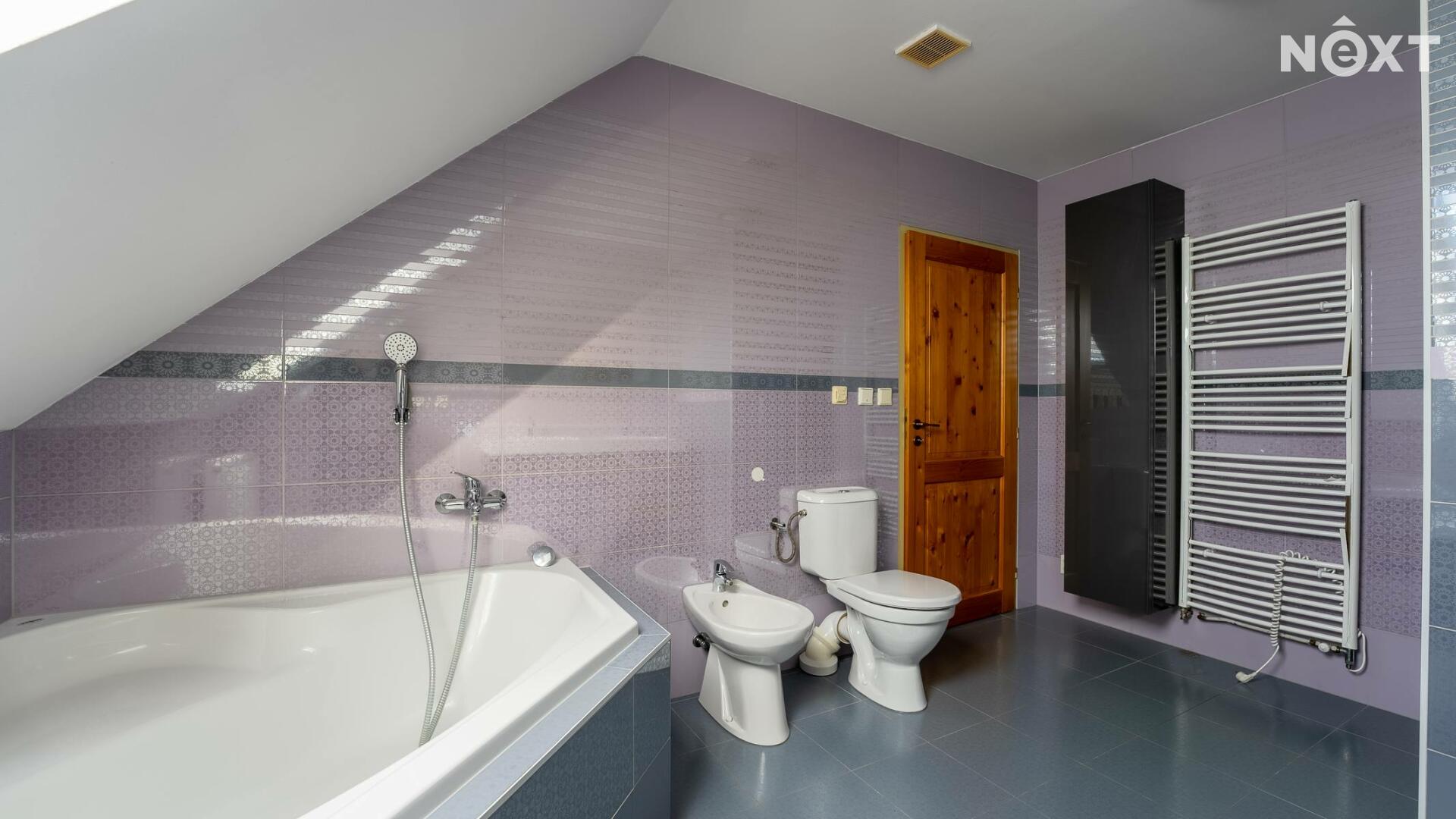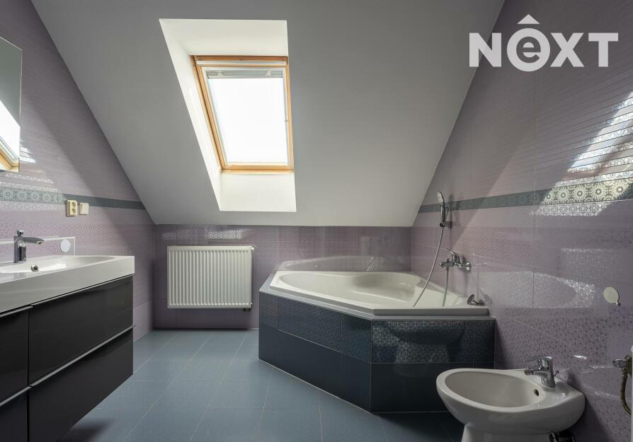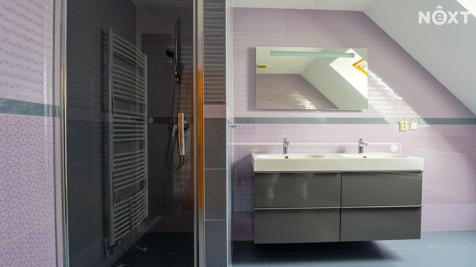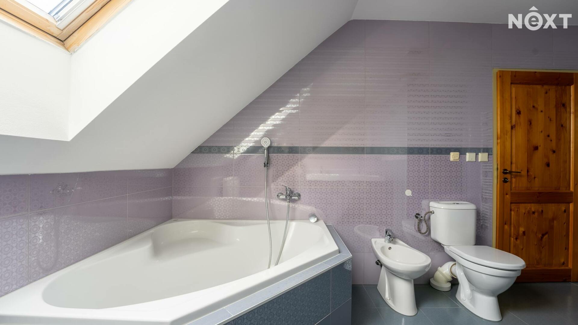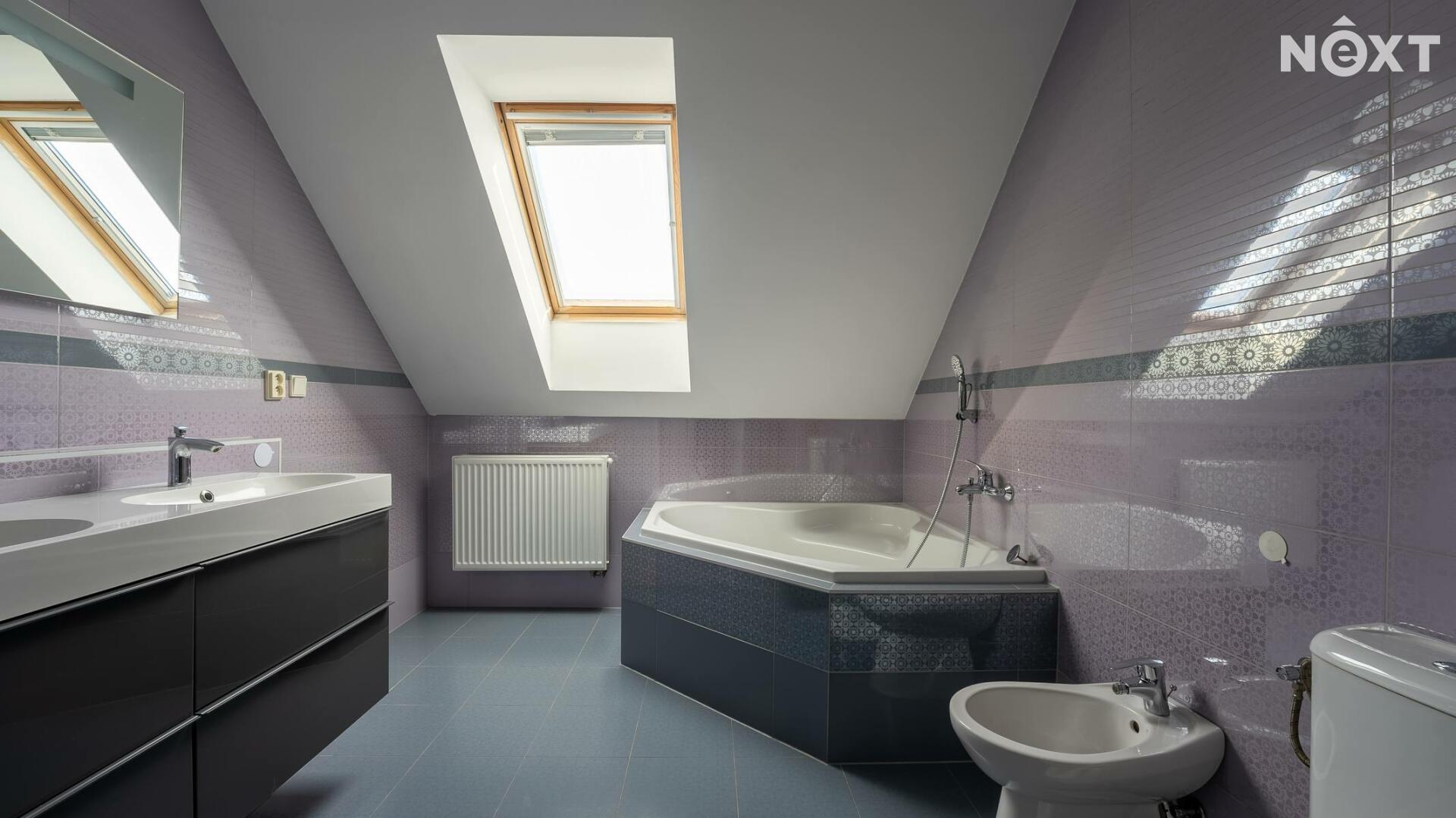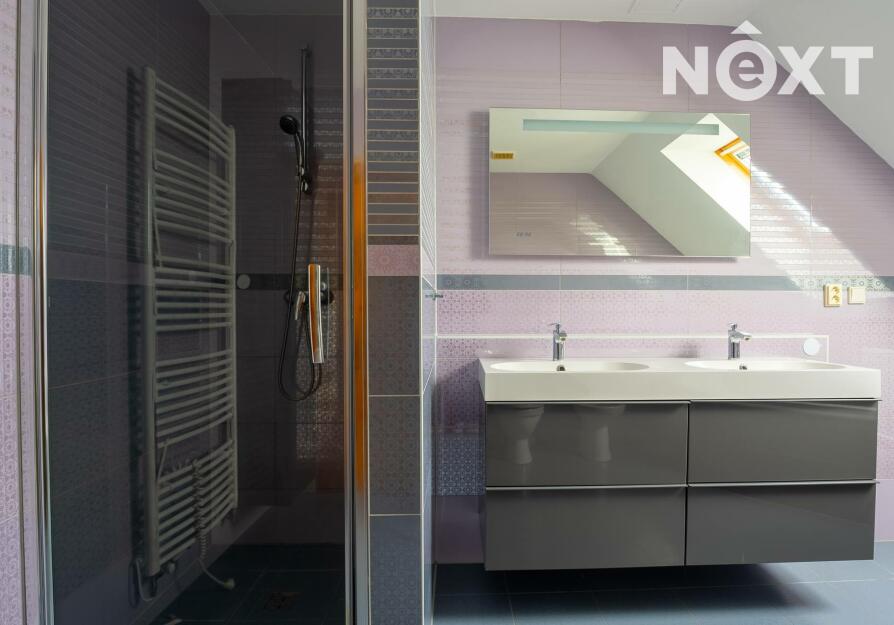 V patře domu nalezneme ložnici se vstupem na balkon, pracovnu, dětský pokoj, technickou místnost a v neposlední řadě prostornou, nadčasovou koupelnu se sprchovým koutem, rohovou vanou, toaletou a bidetem. V koupelně i technické místnosti je užita kvalitní dlažba i obklady, které byly na přání majitele přivezeny přímo z Itálie.