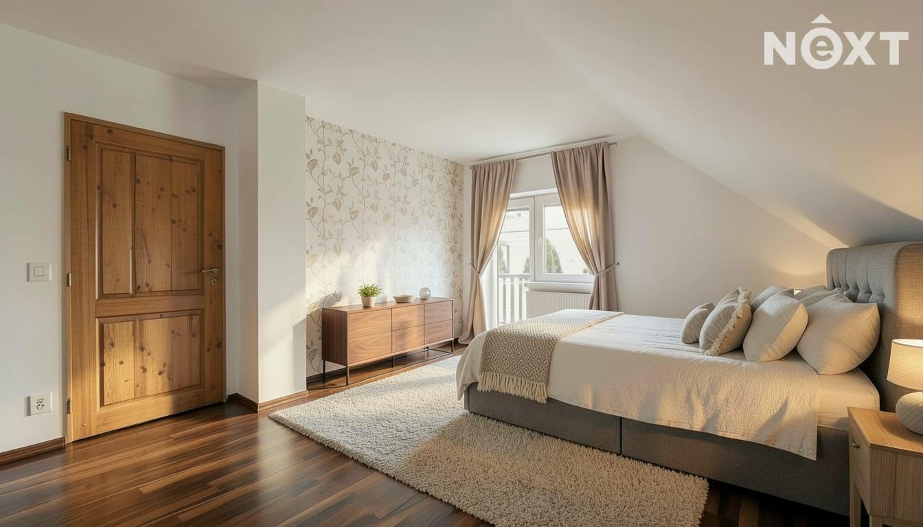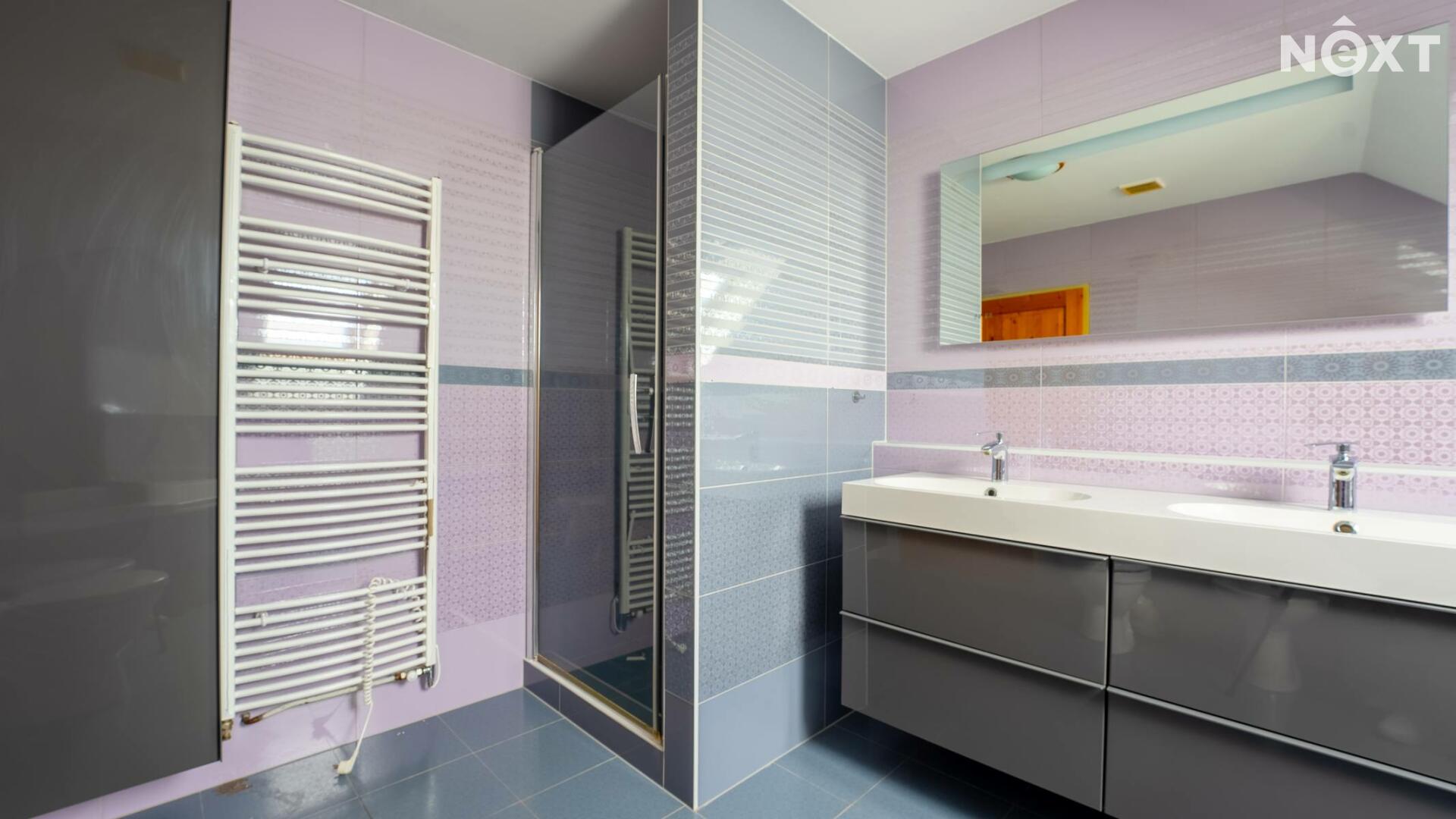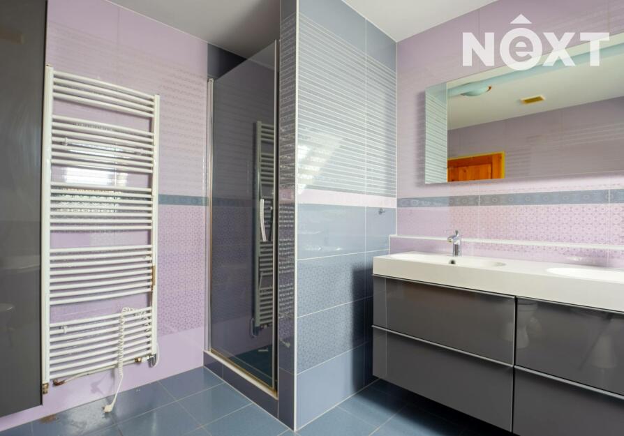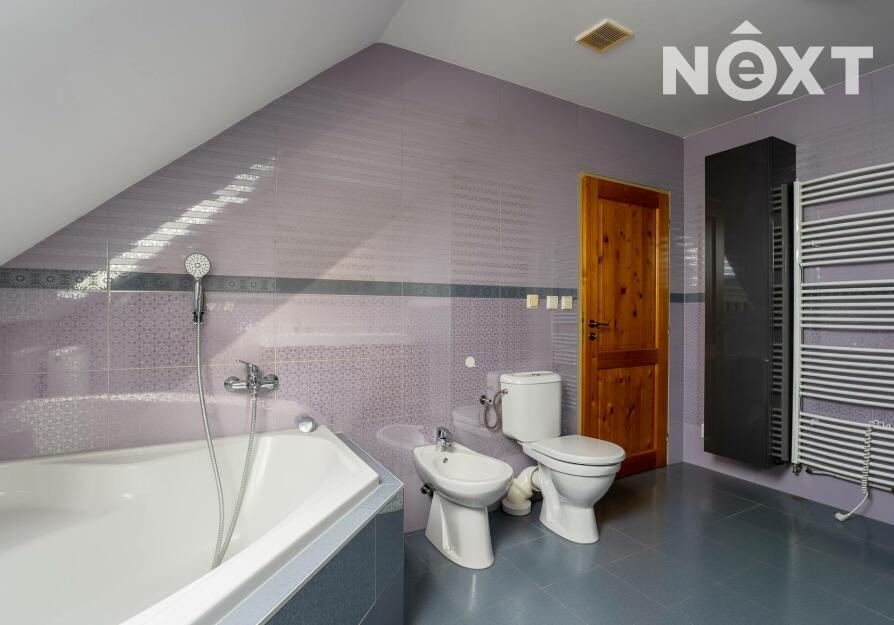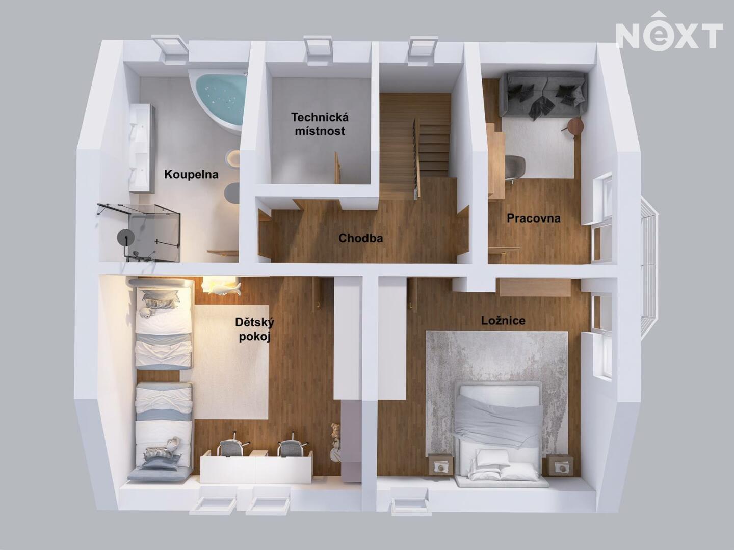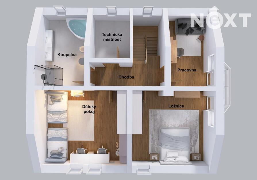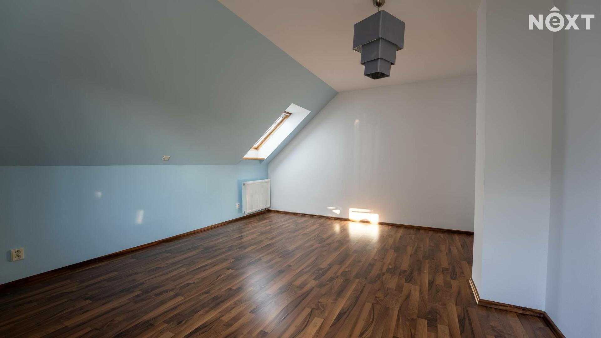 V patře domu nalezneme ložnici se vstupem na balkon, pracovnu, dětský pokoj, technickou místnost a v neposlední řadě prostornou, nadčasovou koupelnu se sprchovým koutem, rohovou vanou, toaletou a bidetem. V koupelně i technické místnosti je užita kvalitní dlažba i obklady, které byly na přání majitele přivezeny přímo z Itálie.