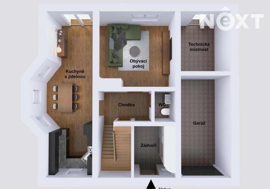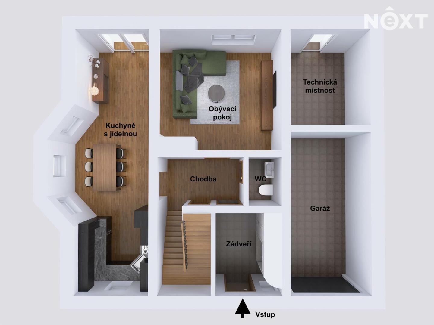 V přízemí domu nalezneme prostornou vstupní halu s předsíní, obývací pokoj s krbovými kamny a vstupem na terasu, plně vybavenou kuchyňskou část s jídelním koutem, spíž a samostatnou toaletu.