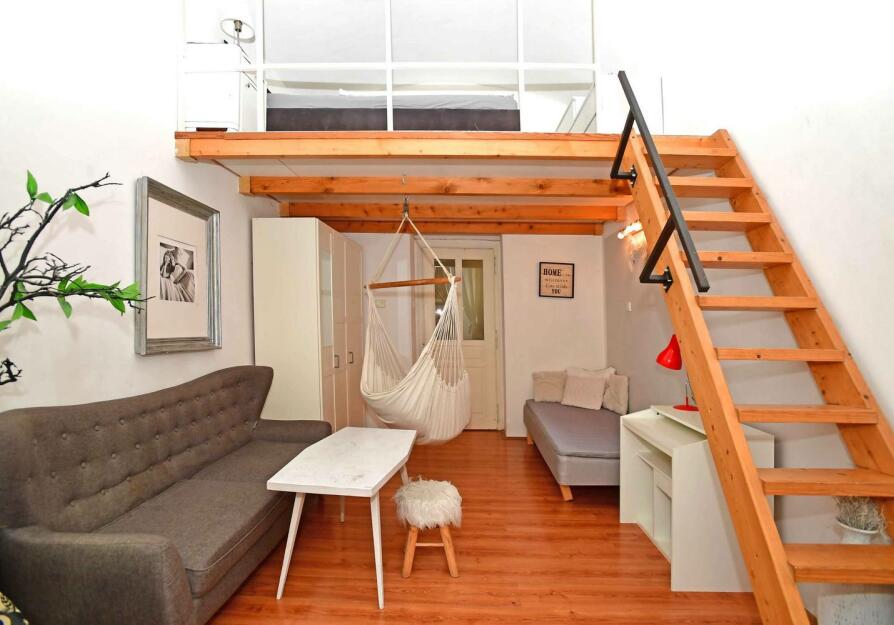 Byt je řešen velmi originálně — v obou samostatných (neprůchozích) pokojích jsou vybudovaná patra na spaní, díky čemuž může spodní část sloužit jako obývací pokoj či pracovna a horní jako ložnice. Díky tomu nabízí každý pokoj dostatek soukromí i prostoru, takže je ideální jak pro menší rodinu, tak pro spolubydlení.