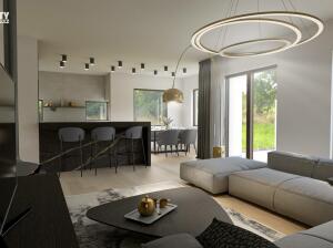 V 1.NP se nachází velký obývací prostor s kuchyňským koutem, spíží, koupelnou a samostatným WC. V další místnosti za krbem se nachází místnost vhodná pro posezení, relaxaci nebo i jako zimní zahrada. Ve 2.NP jsou tři samostatné pokoje, koupelna s vanou a samostatné WC.