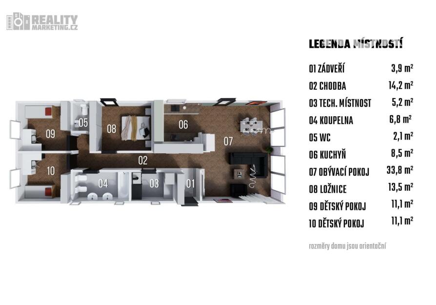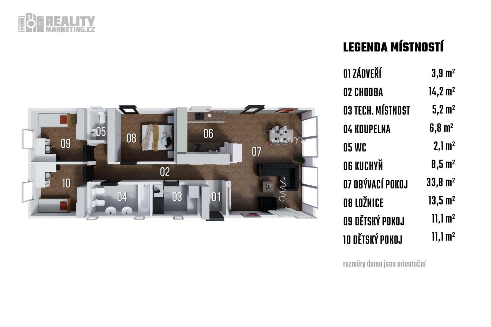 V exkluzivní nabídce máme pro vás moderní zděný bungalov o dispozici 4+kk v malebné obci Rybníky, ideálním místě pro klidné rodinné bydlení obklopené přírodou. Užitná plocha domu činí 110 m² a je situován na samostatném, rovinatém pozemku o výměře 758 m², který poskytuje naprostý klid, soukromí a krásné výhledy do okolní zeleně. Dispozičně je dům řešen jako 4+kk a nabízí tři samostatné neprůchozí pokoje a velkorysý obývací prostor o ploše 33,8 m², jenž je plynule propojen s kuchyňským koutem a odkud vedou francouzské dveře přímo na krytou terasu o velikosti 22,5 m² s výhledem do přírody – ideální místo pro ranní kávu nebo večerní posezení. Cena je uvedena za kompletně dokončený dům (bez kuchyňské linky), včetně fasády, podlah, interiérových dveří, sanity a podlahového vytápění napojeného na tepelné čerpadlo. Financování výstavby probíhá formou zálohových plateb, přičemž první platba je určena na koupi zasíťovaného pozemku a následně následuje pět postupných plateb, které se hradí za jednotlivé fáze dokončenosti stavby. Obec Rybníky leží jen kousek od historického Moravského Krumlova, v malebné krajině nedaleko řek Rokytné a Jihlavy, v blízkosti zříceniny hradu Templštejn, oblíbeného cíle výletníků a milovníků historie. Lokalita se pyšní výbornou dostupností do Ivančic (15 minut) i do Brna (45 minut) a zároveň nabízí veškerou občanskou vybavenost – školu, školku, obchod, sportoviště, cyklostezky, turistické trasy i vinařský kraj, který dodává celé oblasti jedinečný charakter. Pro více informací kontaktujte realitního makléře. Pro komunikaci uvádějte evidenční číslo zakázky N114088.
