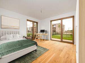 pokoj, kuchyň, dvě ložnice, koupelnu, samostatné WC a spíž na společné chodbě. K bytu náleží dva balkony, velký sklep a