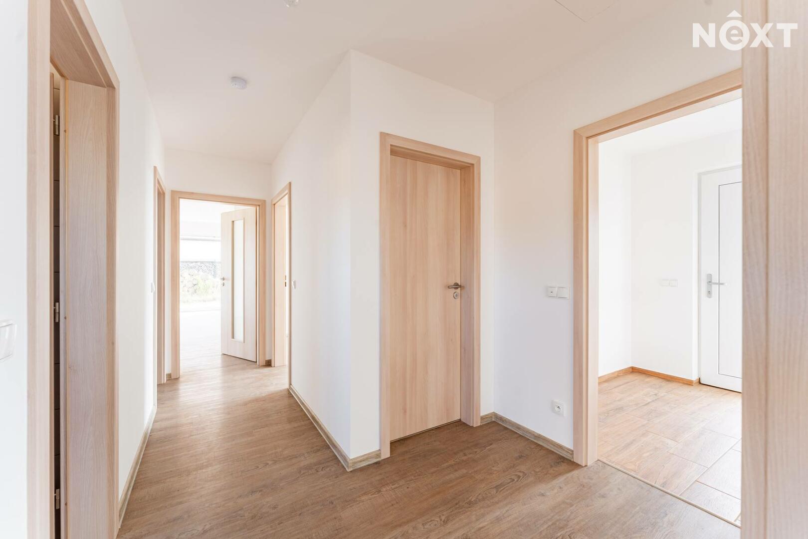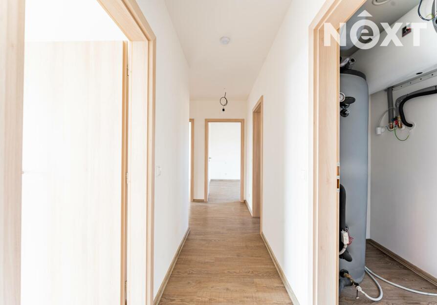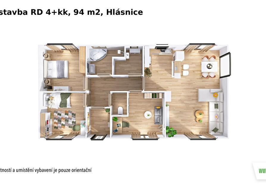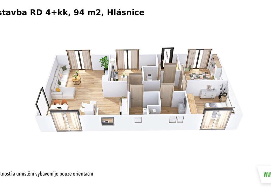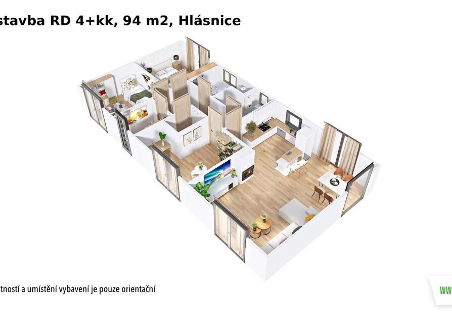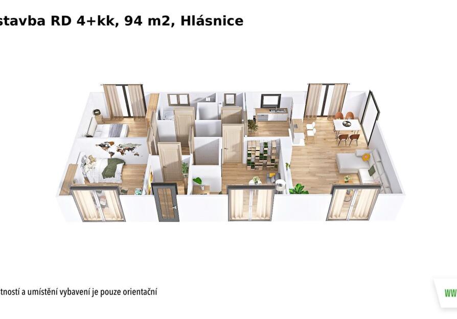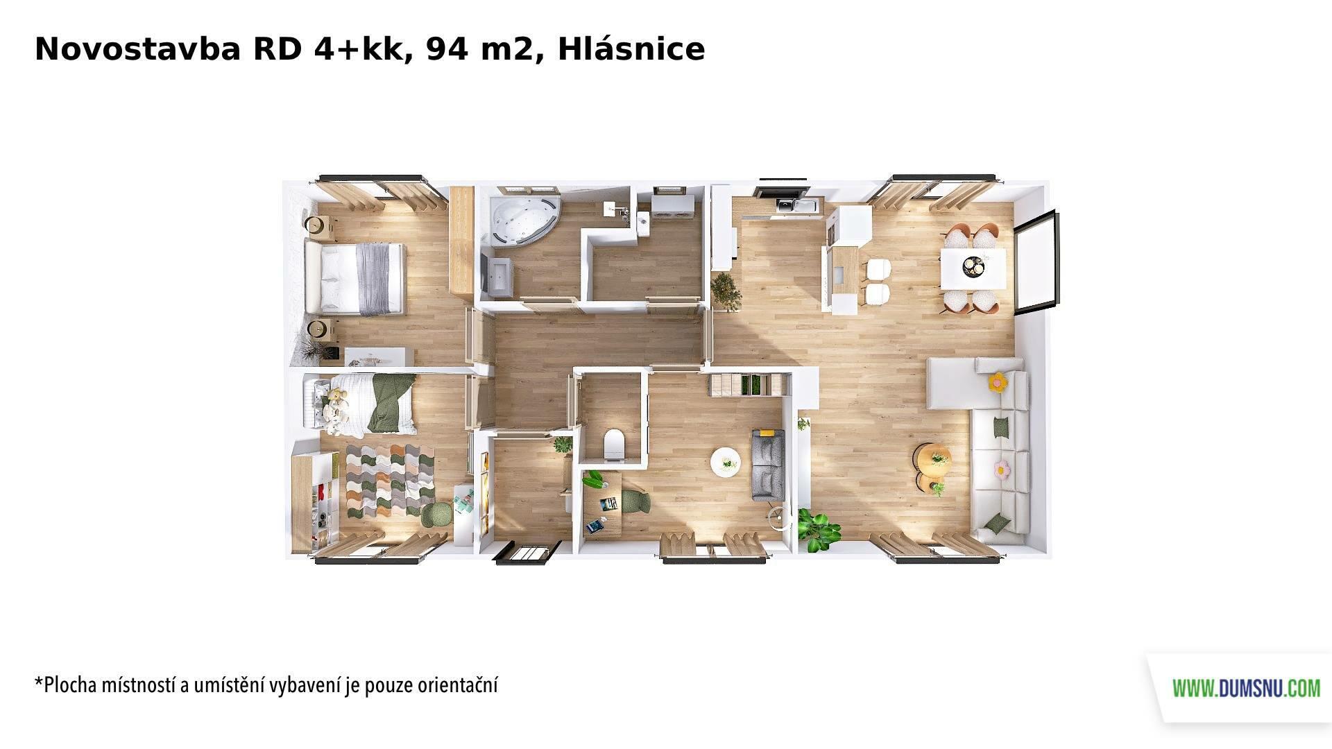 Samotný dům má dispozici 4+kk a užitnou plochu 94 m2. Z obývacího pokoje s kuchyní, který tvoří srdce