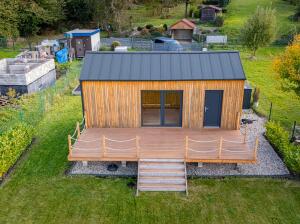 Zahrada je udržovaná a osázená okrasnými i užitkovými rostlinami, najdete zde prostor pro posezení, grilování i pěstování vlastní zeleniny. Příjemným bonusem je terasa s výhledem do okolní krajiny.