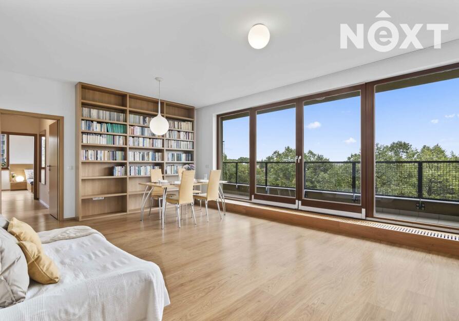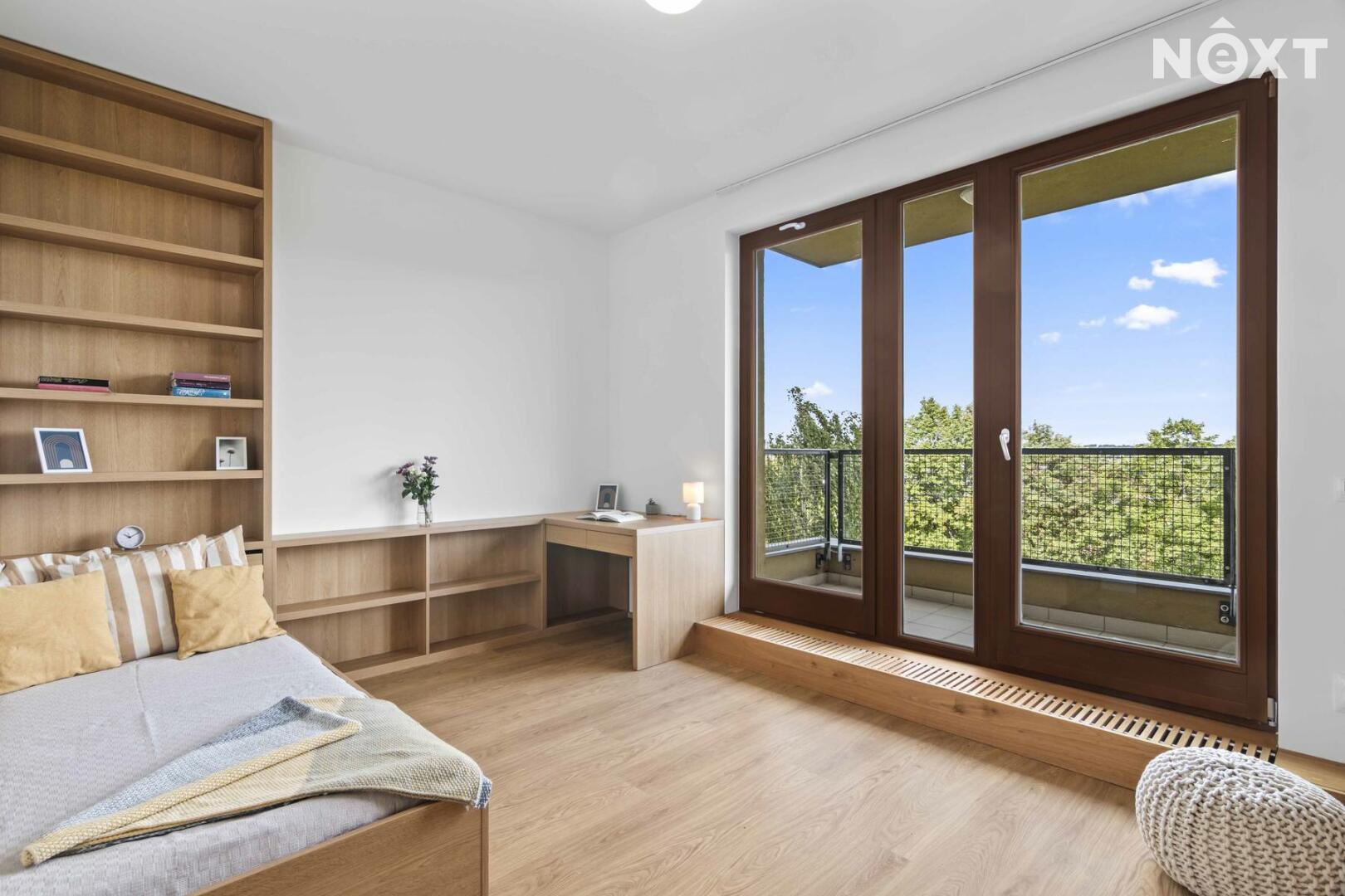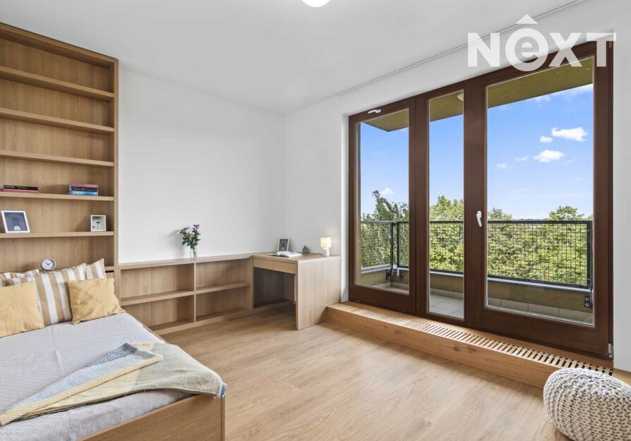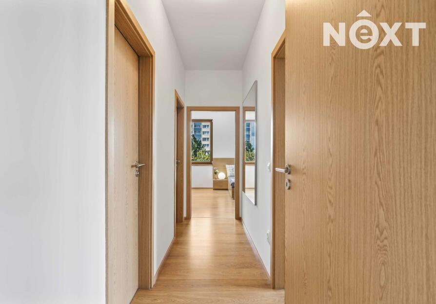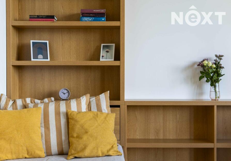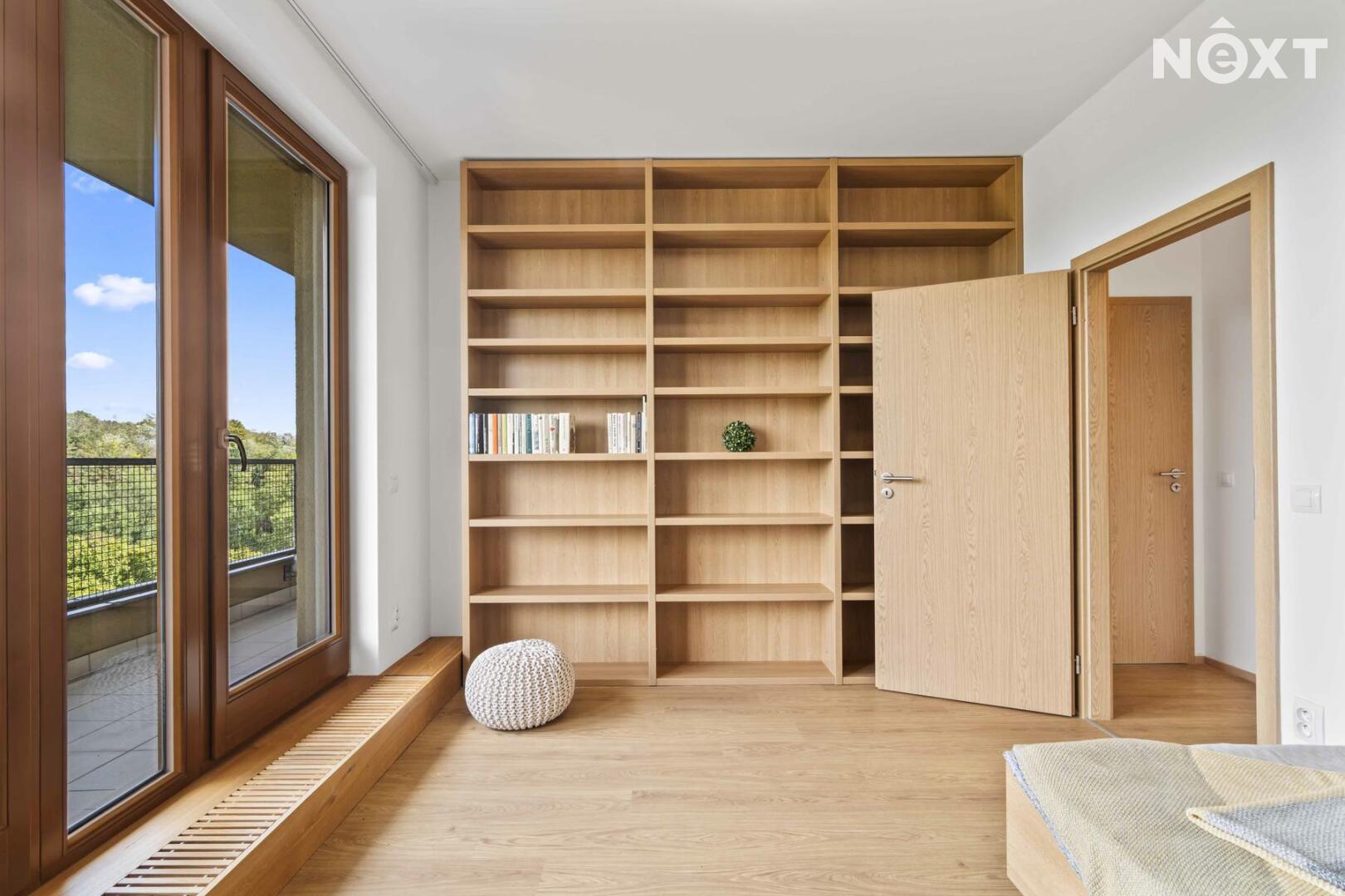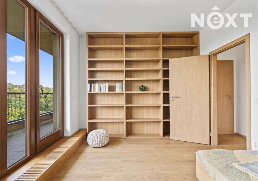 Obývací pokoj s francouzskými okny navazuje na kuchyň a jídelní kout. Díky přímému vstupu na prostorný balkon je to místo, kde si užijete ranní kávu i večerní klid s výhledem do zeleně. Dvě neprůchozí ložnice poskytují soukromí každému členovi rodiny. Praktické řešení doplňuje samostatná toaleta, šatna i vestavěné knihovny na míru, které dodávají interiéru útulnost a funkčnost.