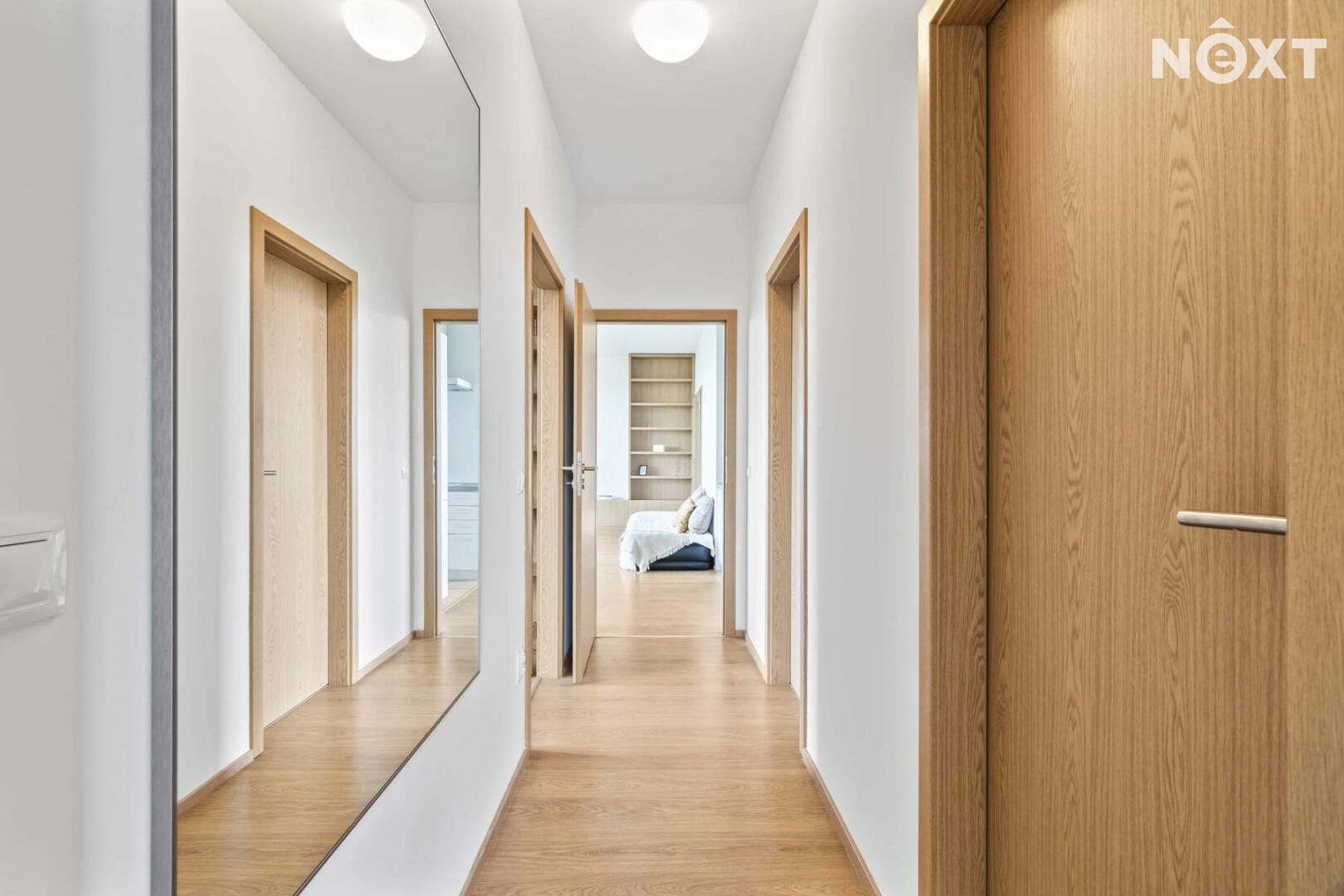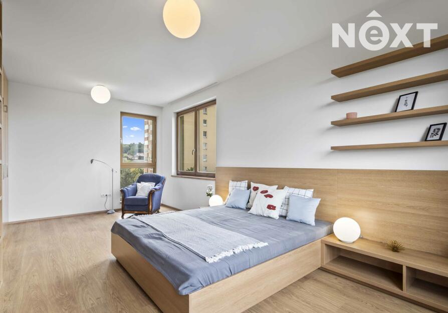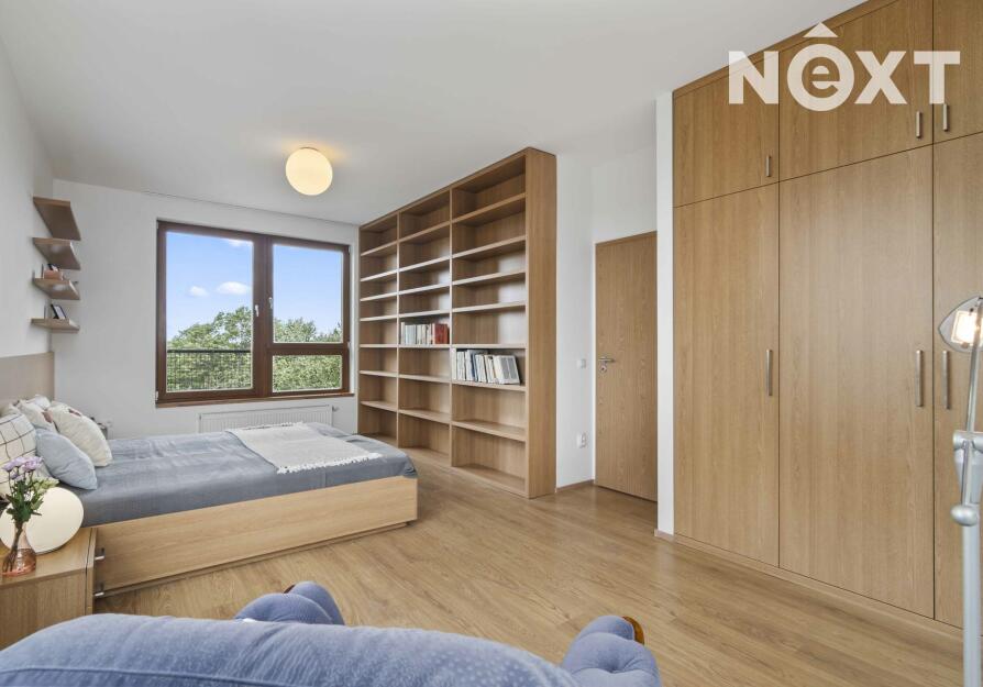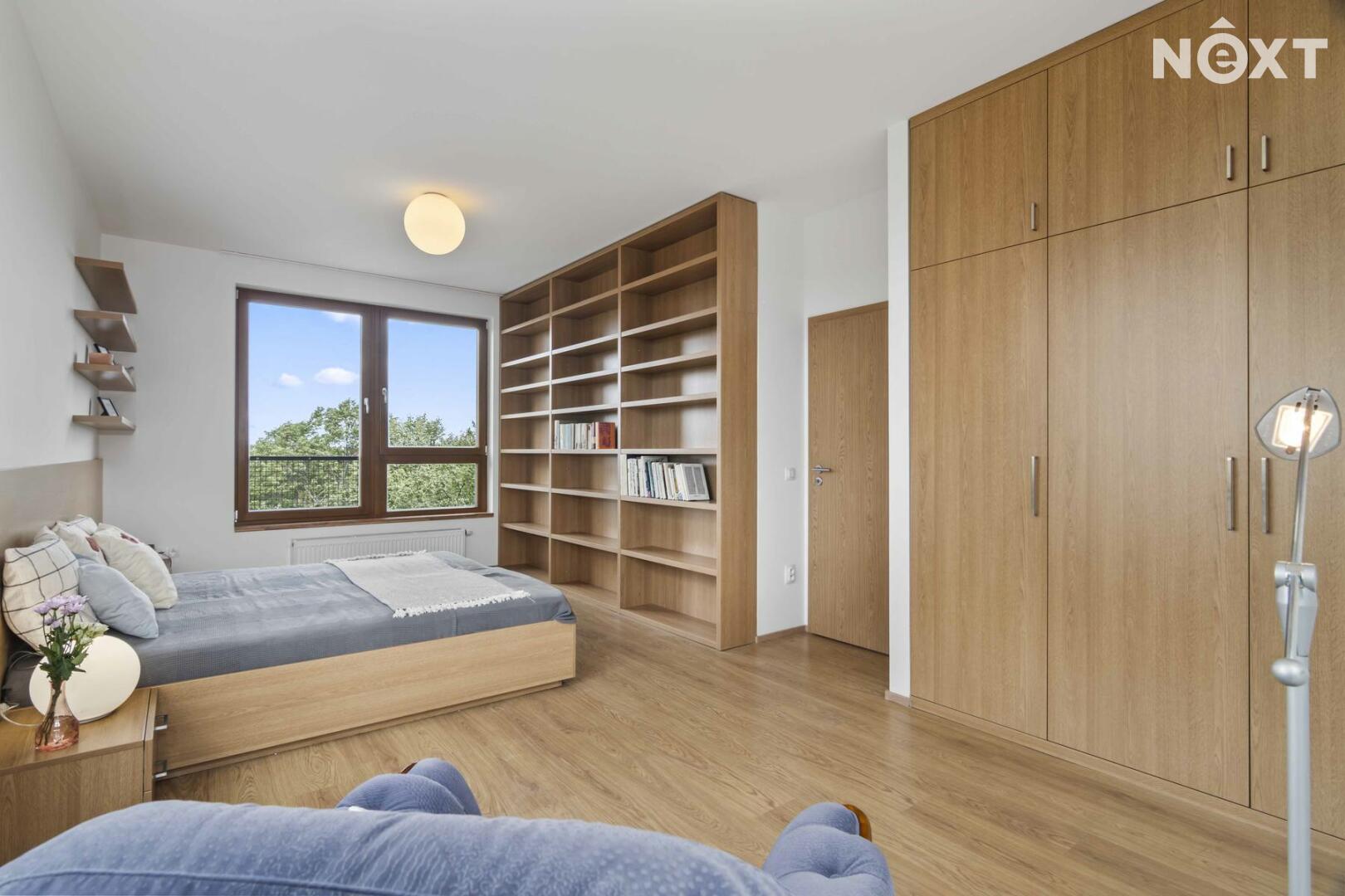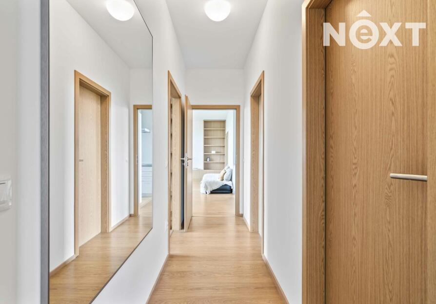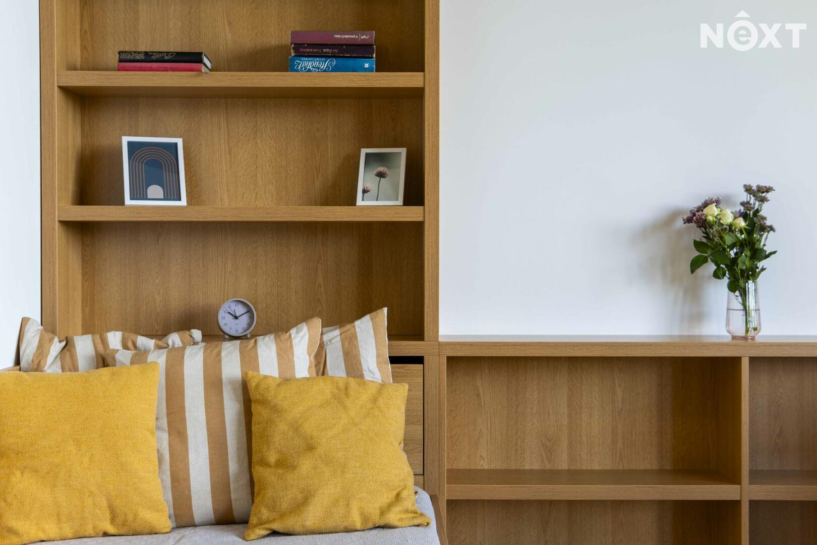 Obývací pokoj s francouzskými okny navazuje na kuchyň a jídelní kout. Díky přímému vstupu na prostorný balkon je to místo, kde si užijete ranní kávu i večerní klid s výhledem do zeleně. Dvě neprůchozí ložnice poskytují soukromí každému členovi rodiny. Praktické řešení doplňuje samostatná toaleta, šatna i vestavěné knihovny na míru, které dodávají interiéru útulnost a funkčnost.