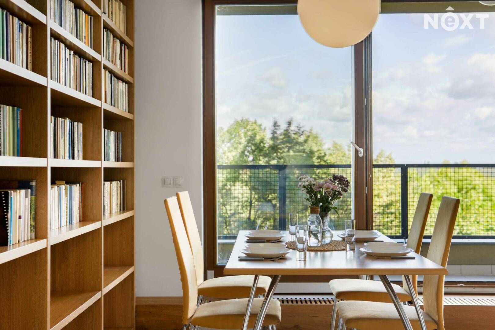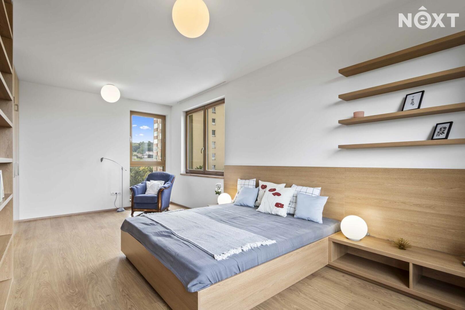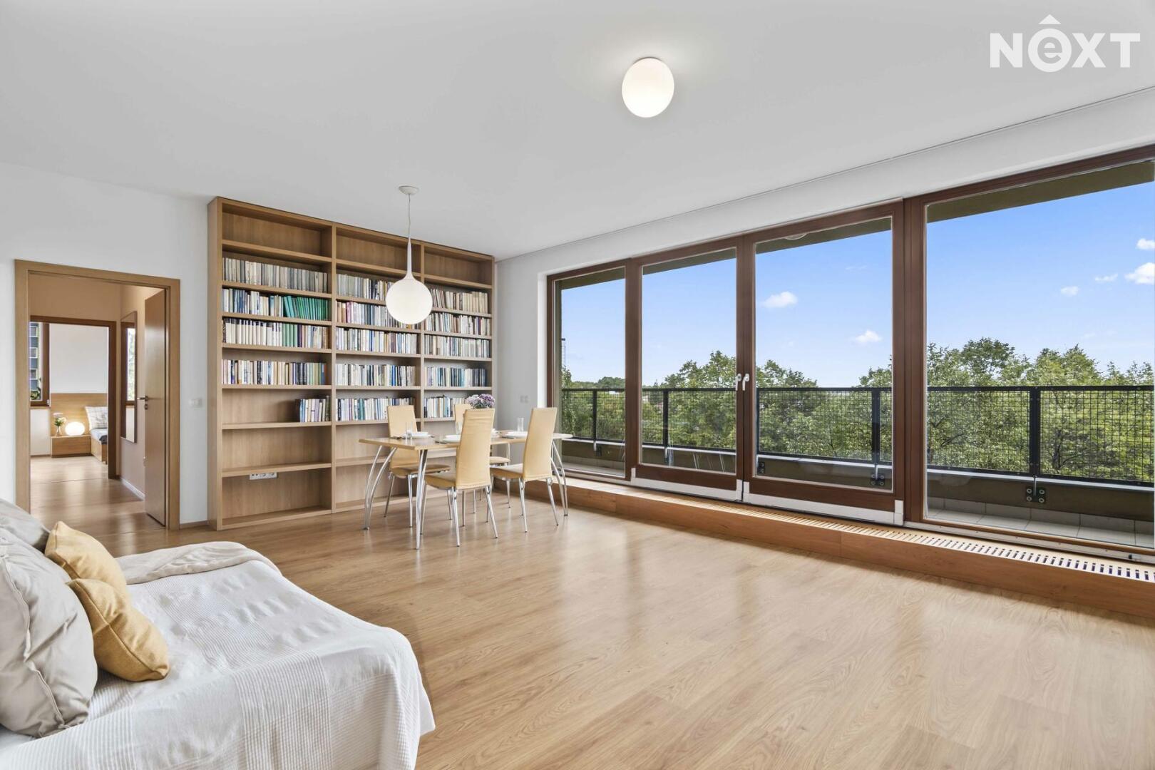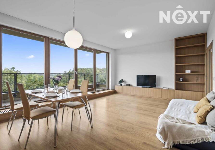 Obývací pokoj s francouzskými okny navazuje na kuchyň a jídelní kout. Díky přímému vstupu na prostorný balkon je to místo, kde si užijete ranní kávu i večerní klid s výhledem do zeleně. Dvě neprůchozí ložnice poskytují soukromí každému členovi rodiny. Praktické řešení doplňuje samostatná toaleta, šatna i vestavěné knihovny na míru, které dodávají interiéru útulnost a funkčnost.