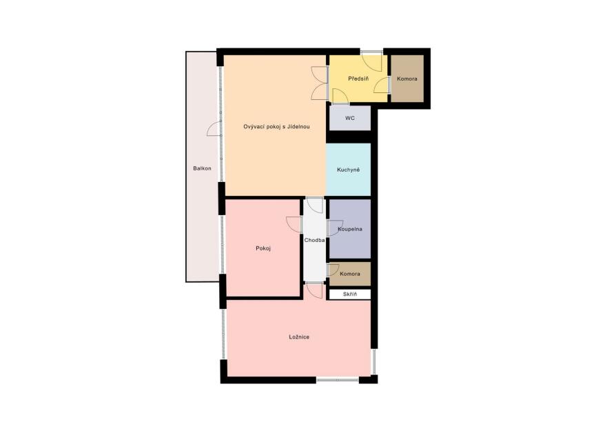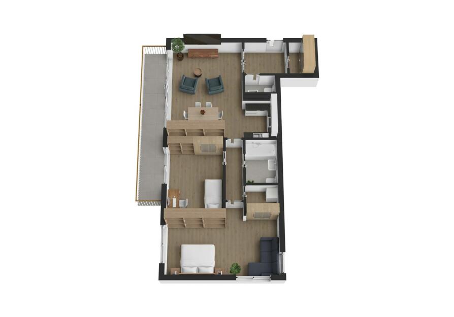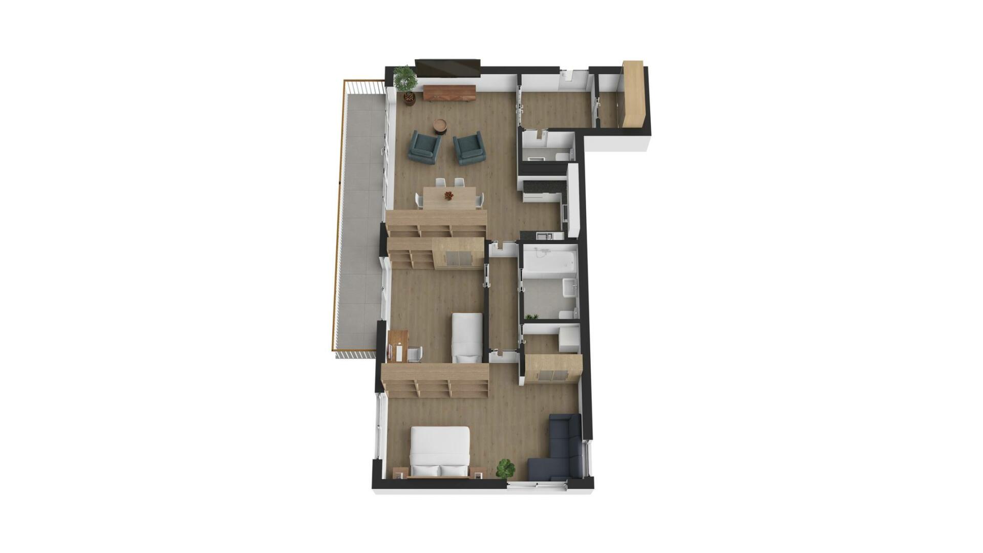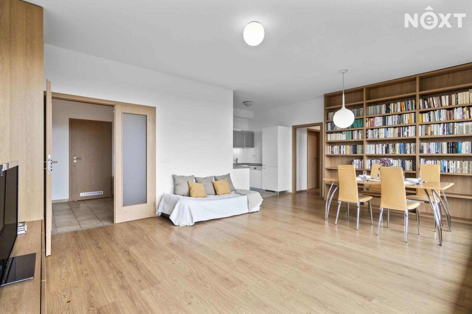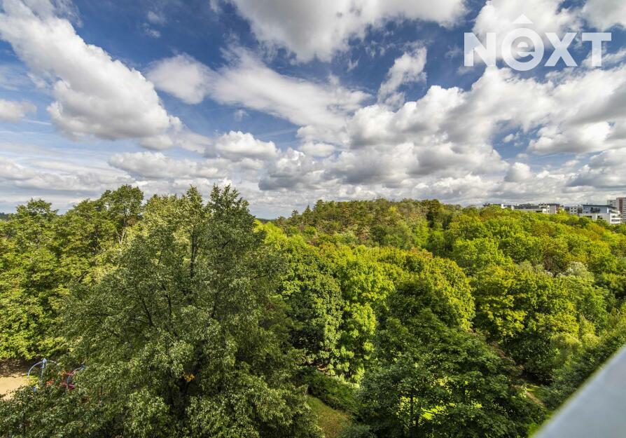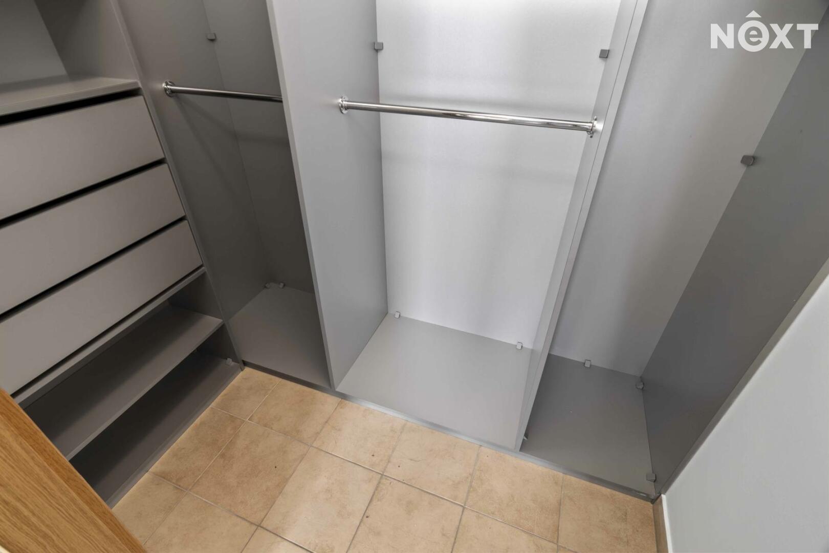 Obývací pokoj s francouzskými okny navazuje na kuchyň a jídelní kout. Díky přímému vstupu na prostorný balkon je to místo, kde si užijete ranní kávu i večerní klid s výhledem do zeleně. Dvě neprůchozí ložnice poskytují soukromí každému členovi rodiny. Praktické řešení doplňuje samostatná toaleta, šatna i vestavěné knihovny na míru, které dodávají interiéru útulnost a funkčnost.
