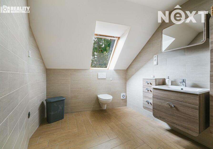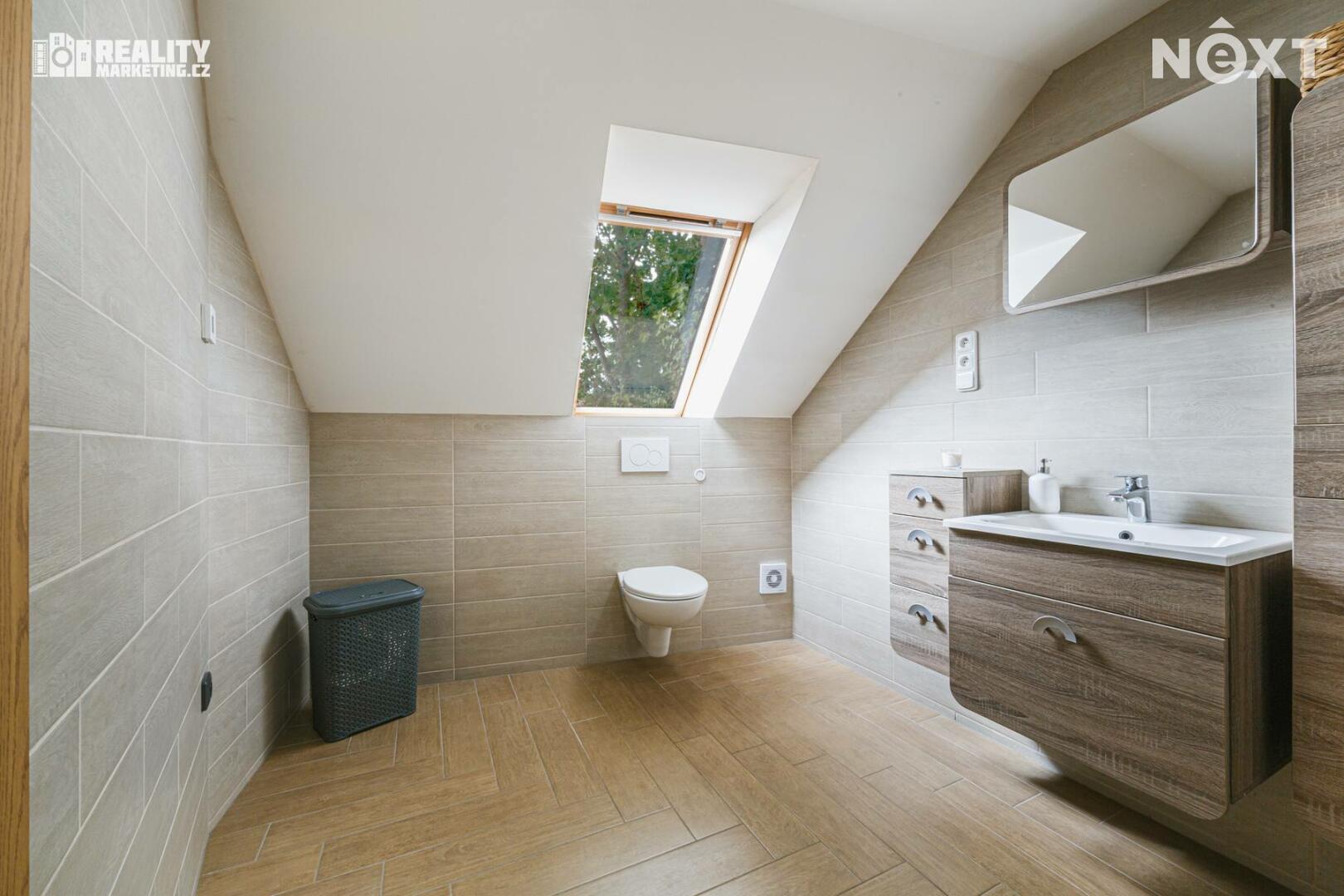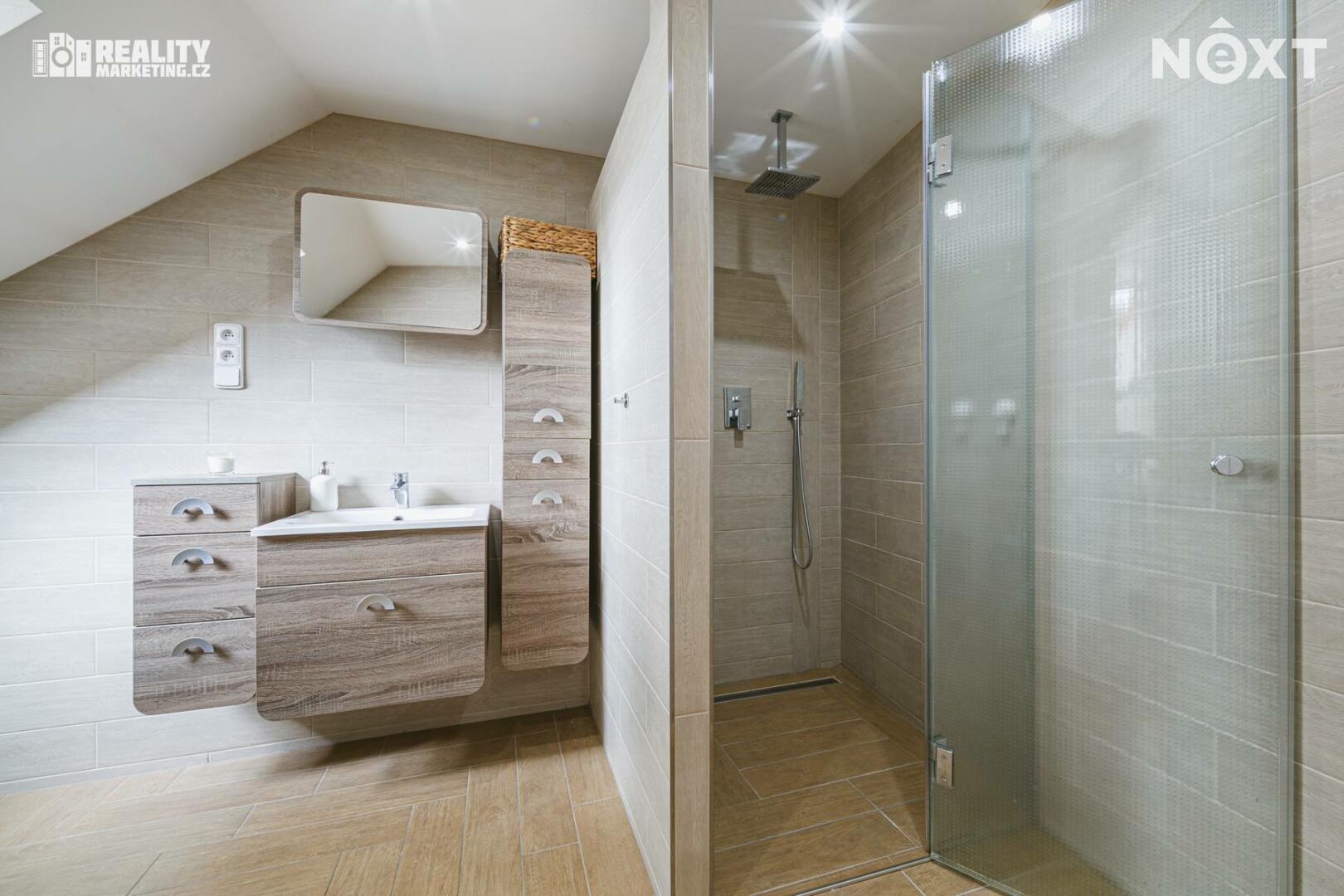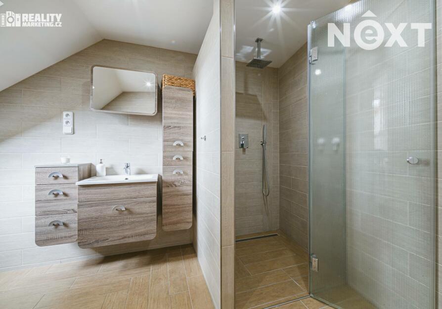 V 1. patře jsou k dispozici 2 obytné pokoje a koupelna vybavena sprchovým koutem a WC.