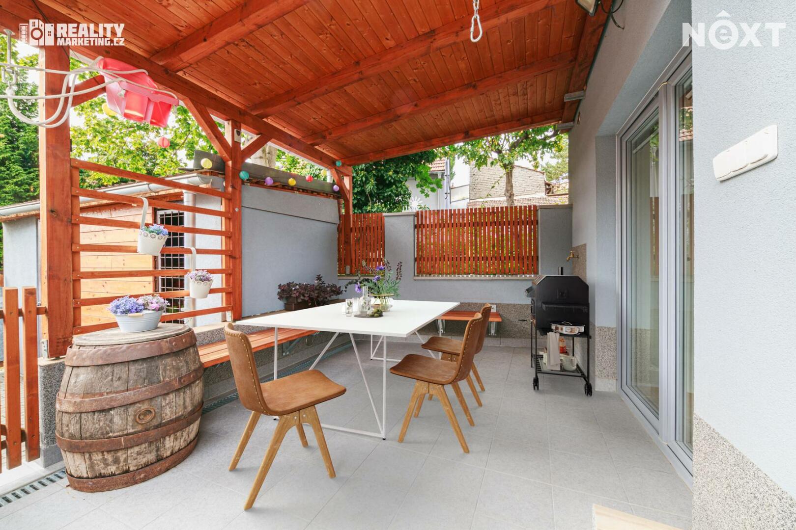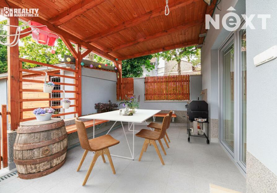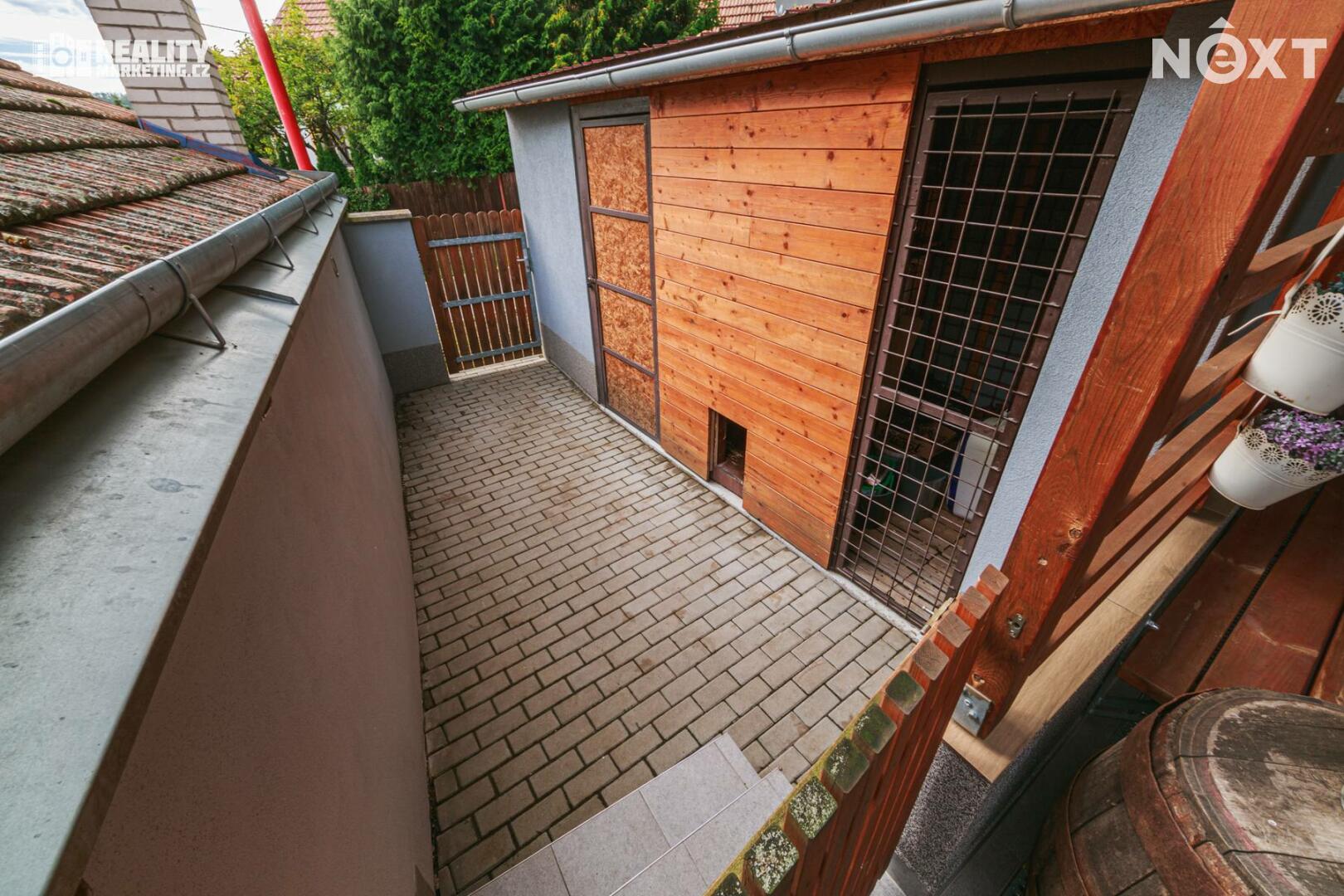 Z příslušenství k domu můžeme zmínit terasu vhodnou k relaxaci či posezení s přáteli, sklep o velikosti 6,8 m2, dřevník a šopu či menší dílnu. Na pozemek je přístup i ze zadní části.