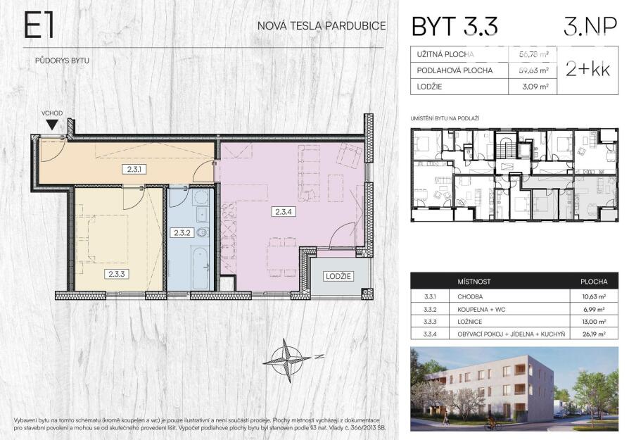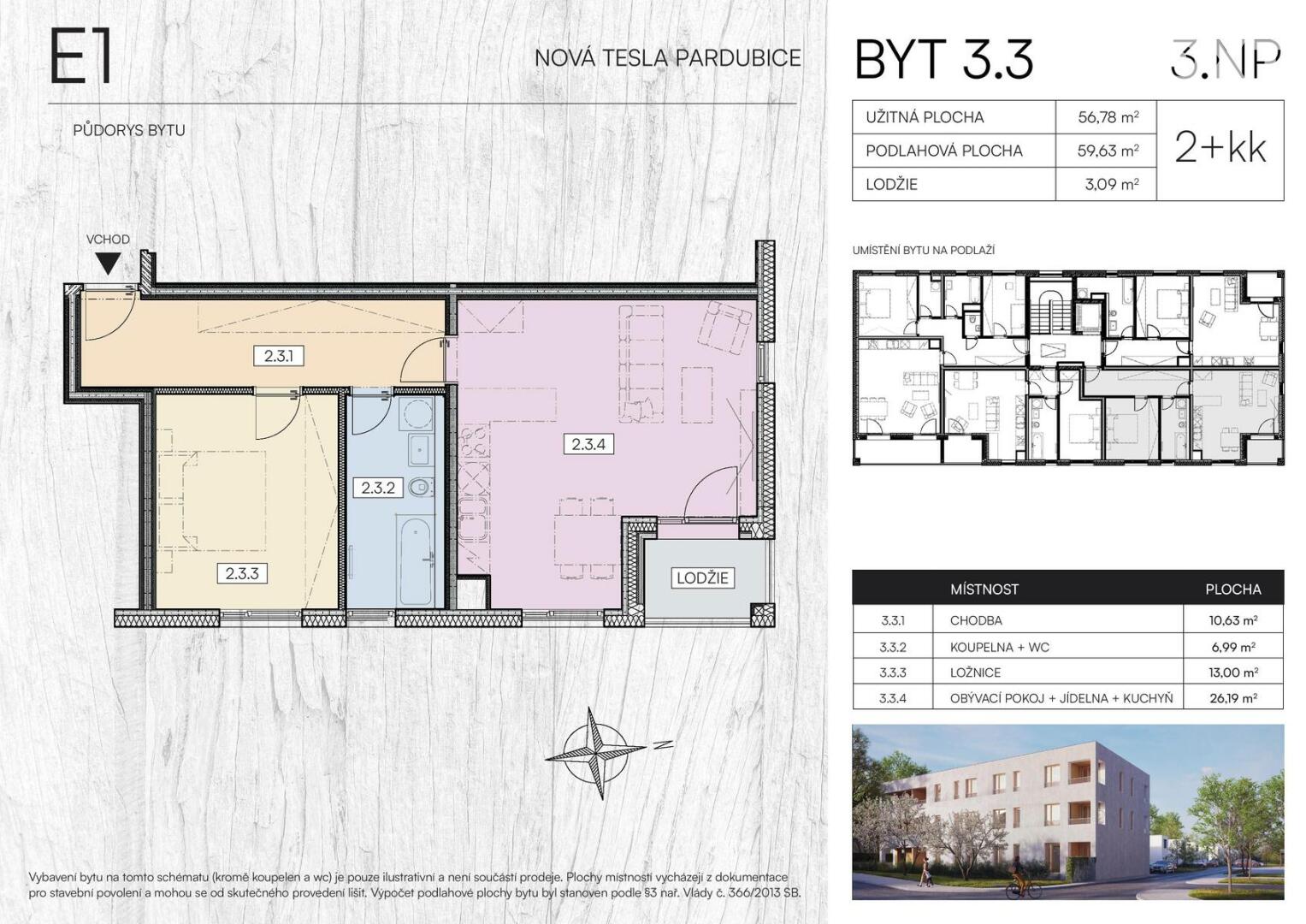 Nabízím k prodeji moderní byt 2+kk o celkové ploše 60 m² včetně lodžie, který se nachází ve třetím nadzemním podlaží nového bytového domu v atraktivním areálu Nová Tesla v Pardubicích. Byt je dispozičně velmi dobře řešený – prostorný obývací pokoj s kuchyňským koutem a jídelní částí poskytuje dostatek místa pro každodenní život, ložnice nabízí klidné zázemí a samozřejmostí je koupelna s toaletou a vstupní chodba. K bytu náleží lodžie o velikosti přes 3 m², ideální pro odpočinek na čerstvém vzduchu.