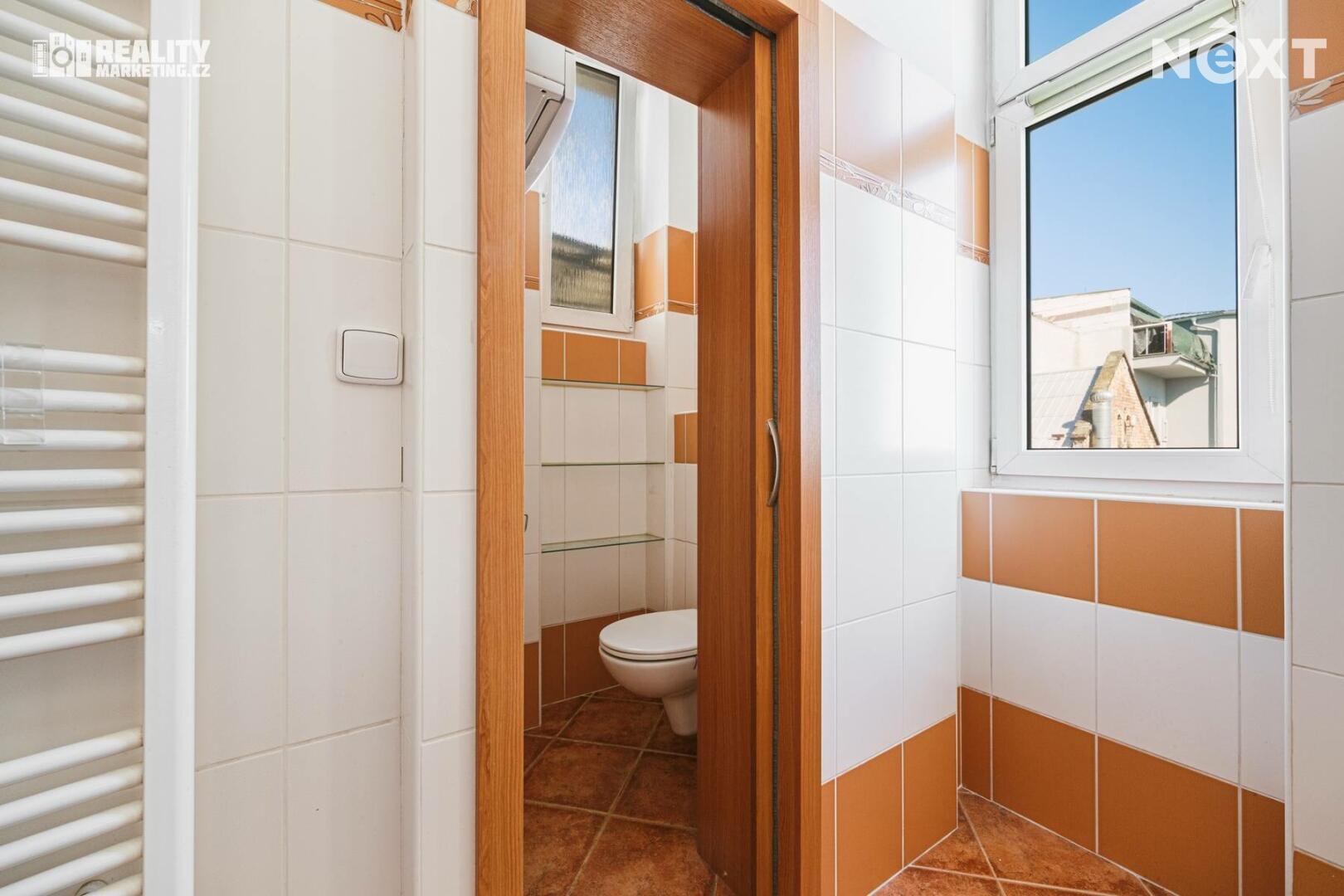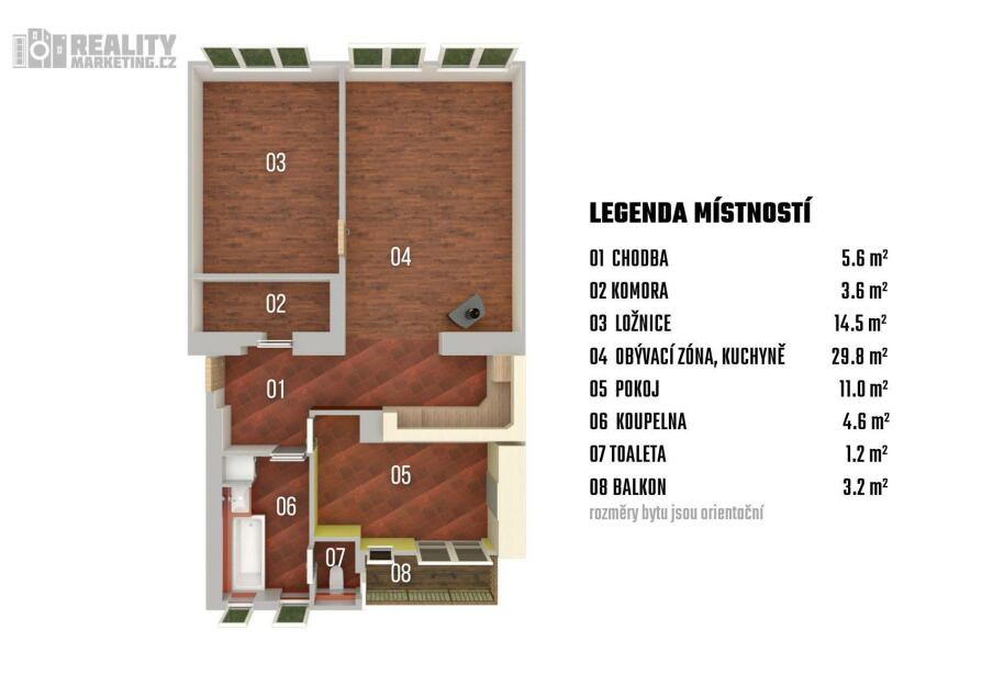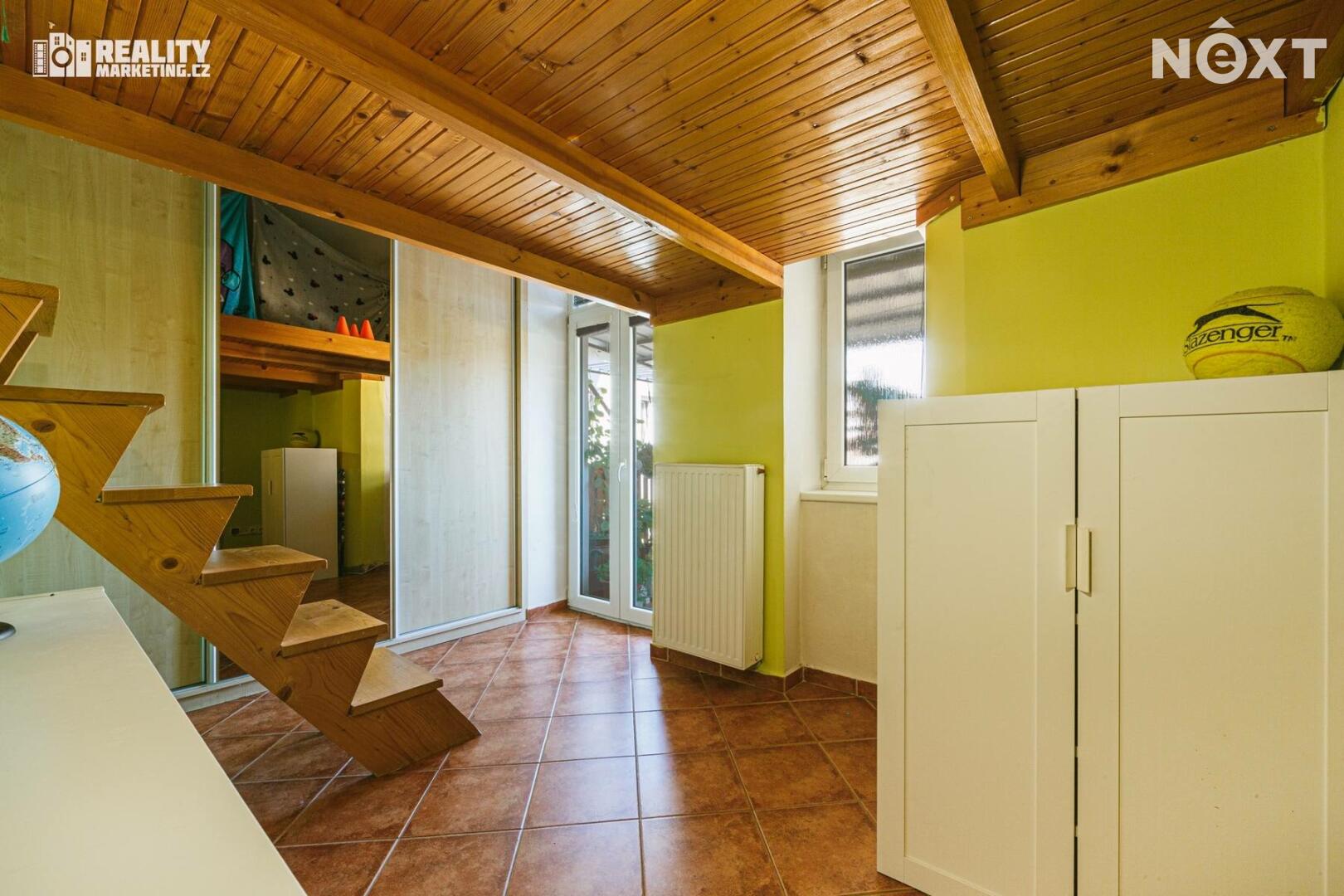 Byt dále nabízí praktickou prostornou komoru. Povrchy podlah tvoří kombinace dlažby a plovoucí laminátové podlahy.