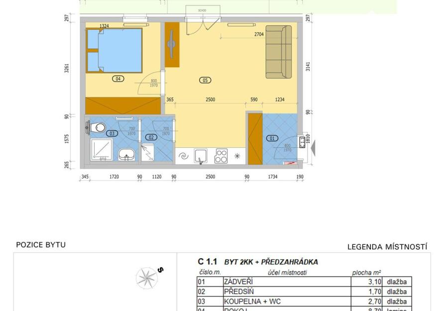 Z obývacího pokoje je vstup na předzahrádku, která je situovaná na západní straně domu do zeleně parkové úpravy. K bytu dále náleží sklepní kóje a venkovní parkovací stání před domem.
