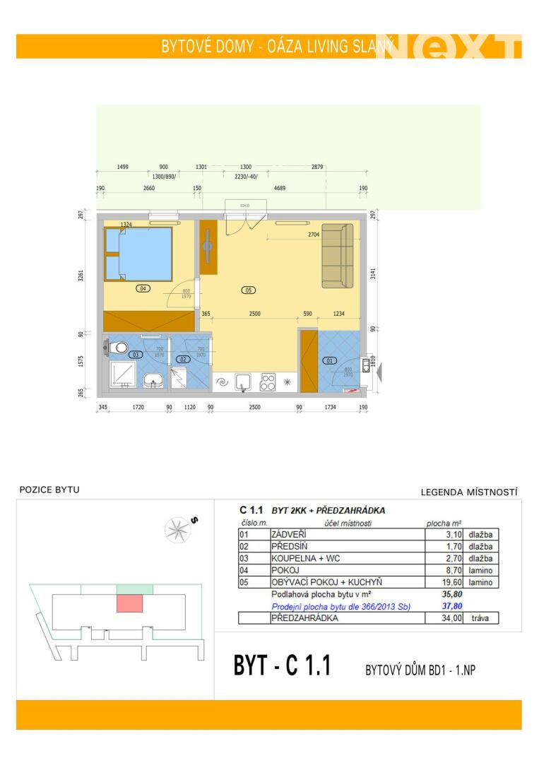 Exkluzivně vám představuji nabídku pronájmu bytu o dispozici 2+KK, který se nachází v novostavbě nízkoenergetického bytového domu. Byt o celkové užitné ploše 39,80 m2 s předzahrádkou o ploše 34 m2 se nachází v prvním nadzemním podlaží bytového domu. Okna bytu jsou orientována na západ. Dispozičně je byt řešen vstupní předsíní, odkud je vstup do obývacího pokoje s kuchyňským koutem. Kuchyňská linka je plně vybavena myčkou, kombinovaným sporákem a odsavačem par. K dispozici je také mikrovlnná trouba, varná konvice a samostatně stojící kombinovaná lednice.