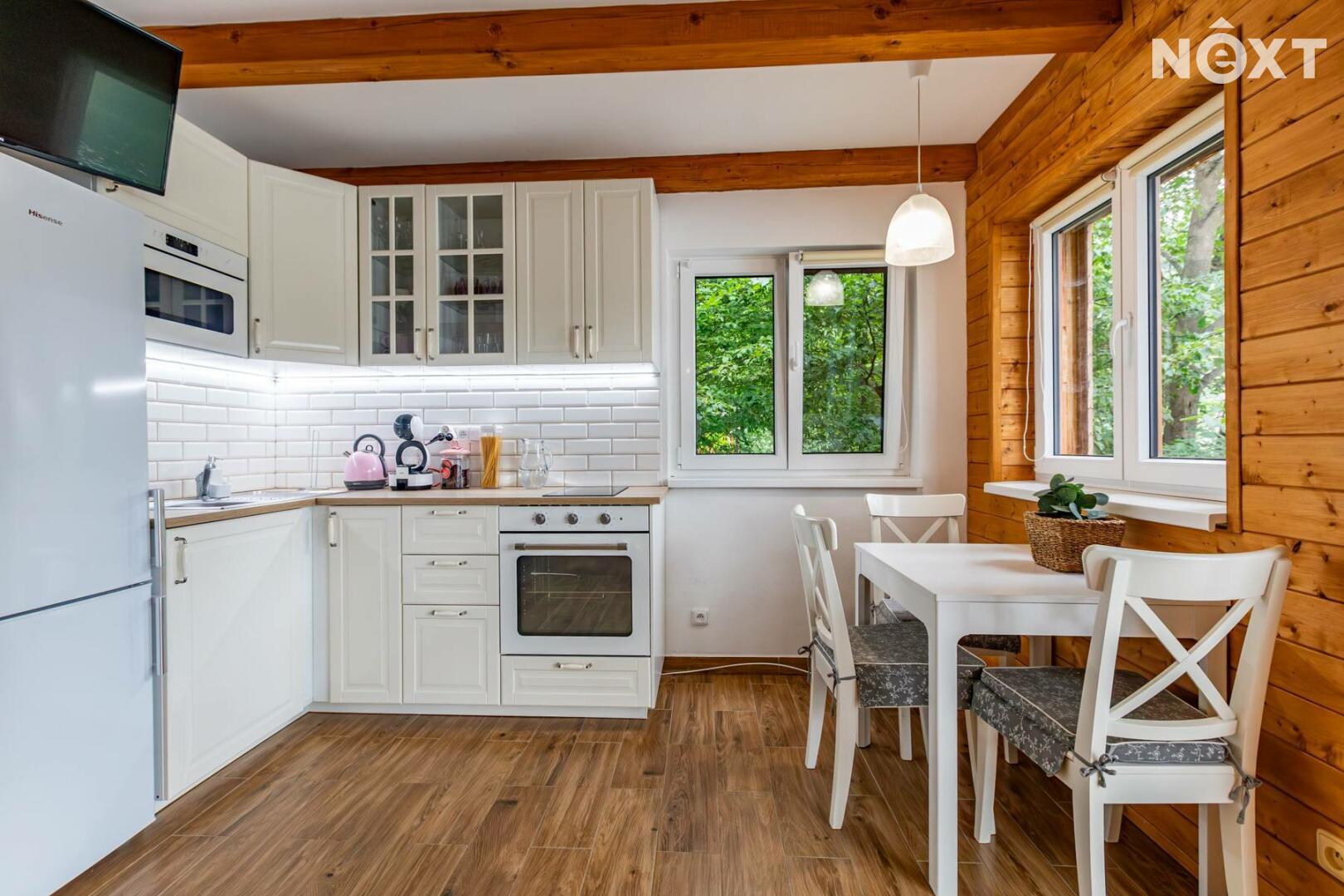1. patro – útulný obývací pokoj propojený s kuchyní, koupelna a WC