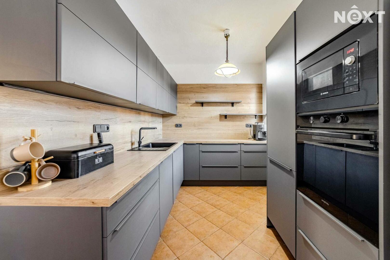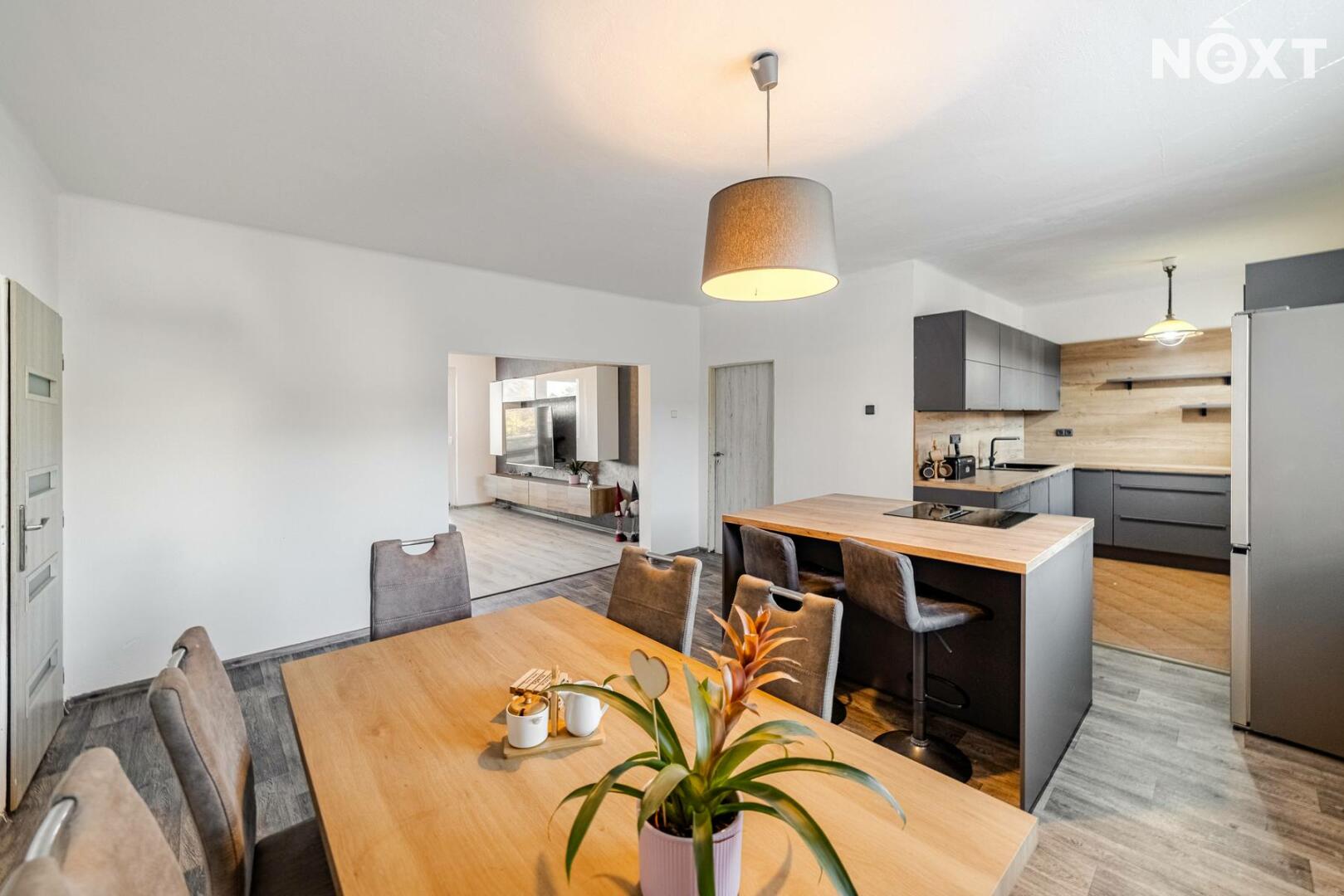 Horní bytová jednotka je stylová a moderní. Najdete tu kuchyň s ostrůvkem a velkou jídelnu (cca 30 m²), kde se pohodlně sejde celá rodina. Dále obývací pokoj, dvě ložnice, koupelnu, komoru a chodbu.