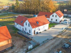 Už při vstupu vás přivítá dlouhá chodba, ze které se dostanete do obou jednotek i sklepa. V 1.NP vkročíme do menší chodby a odtud do světlého obývacího pokoje s kuchyňským koutem, tří samostatných ložnic, koupelny, odděleného WC a útulné zimní zahrady, ideální pro ranní kávu i večerní klid. Z přízemí vede schodiště do patra i do sklepa.