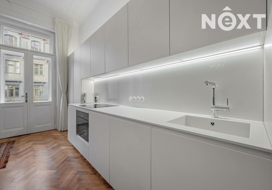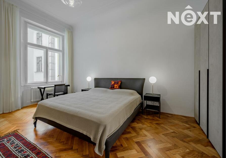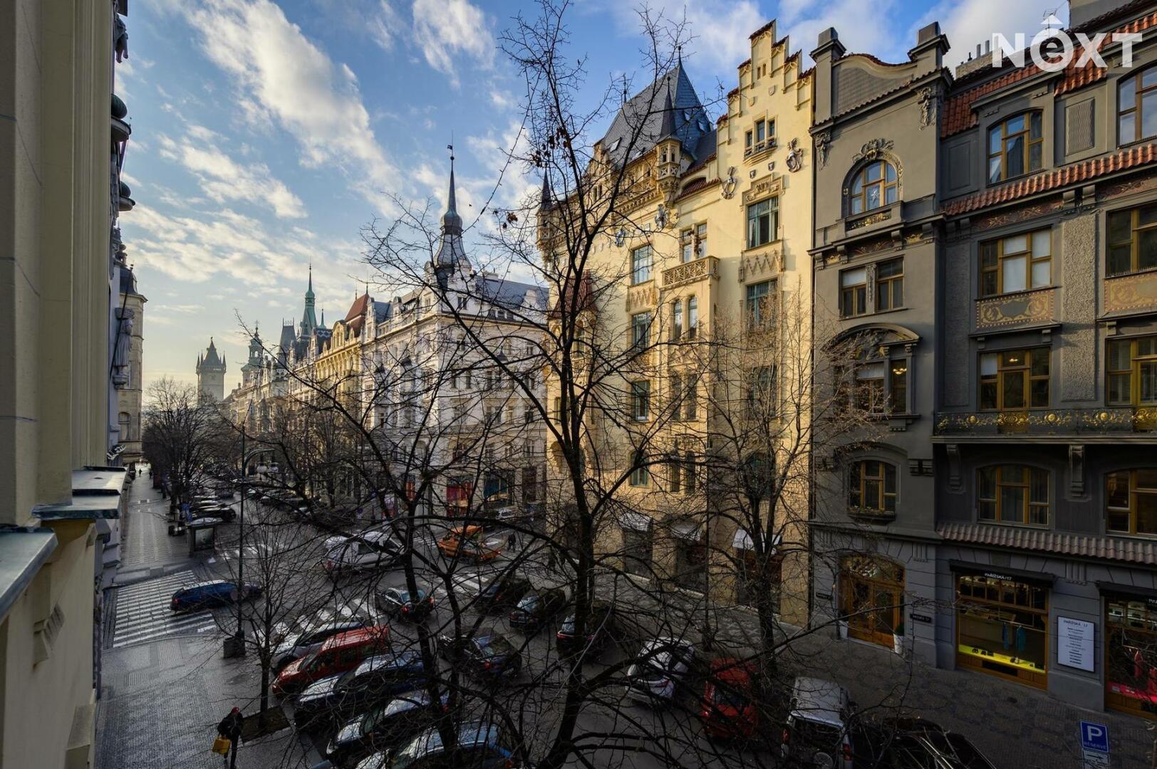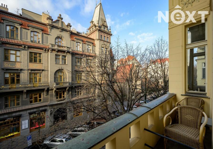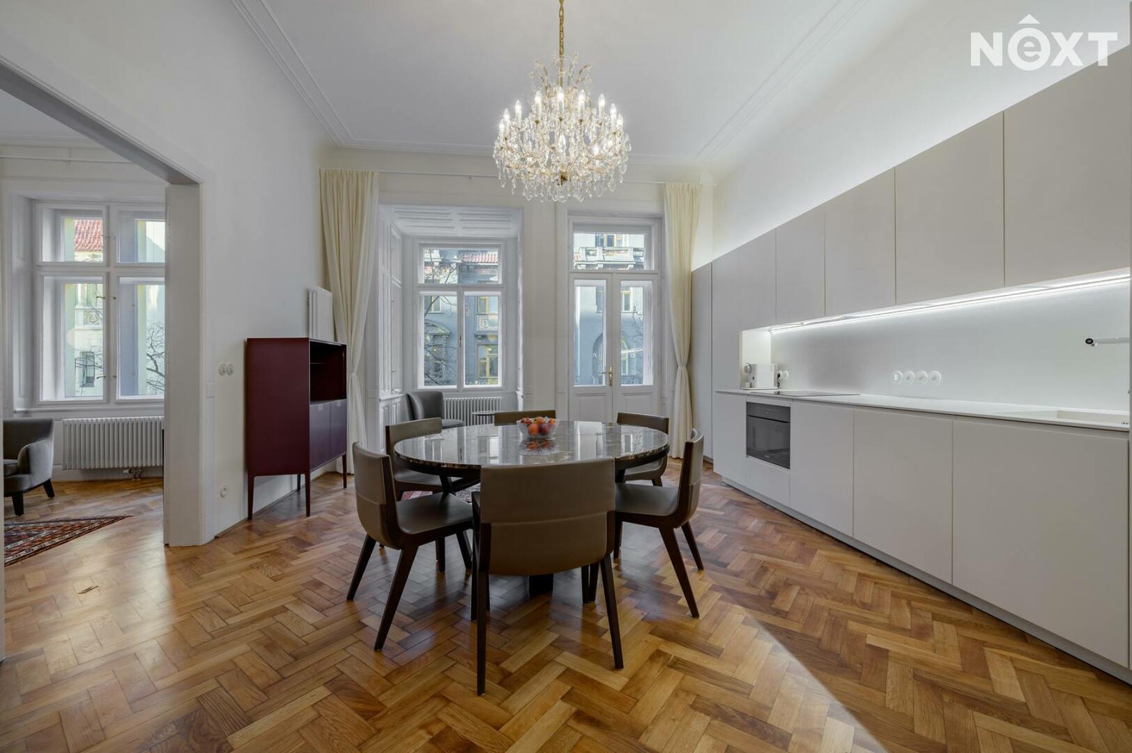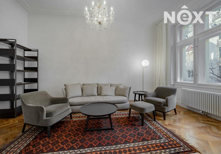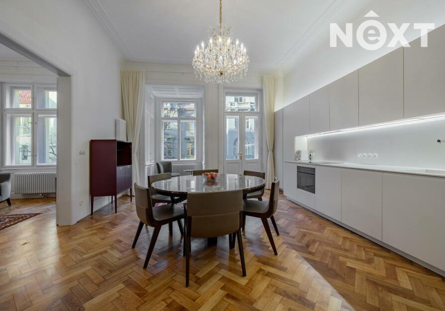 It consists of an entrance hall, lounge with a dining room and kitchenette with access to the balcony and alcove facing Pařížská Street with a beautiful views, 2 separate bedrooms facing the quiet courtyard, each with its bathroom and one of the bedrooms has a balcony, toilet for guests and chamber with a washing machine and dryer. The apartment offers a total of 3 toilets and 2 bathrooms (bathroom with a bidet, toilet and shower, bathroom with a tub and toilet). Fully equipped kitchen with a dining room. Parquet floors, stucco ceilings, crystal chandeliers. Furnished with a custom furniture and Maxalto mobile furniture. A niche with a view of Pařížská Street and the Old Town Square. The apartment has a spacious cellar. Available immediately. Internet connection. Pro komunikaci uvádějte evidenční číslo zakázky N114321.