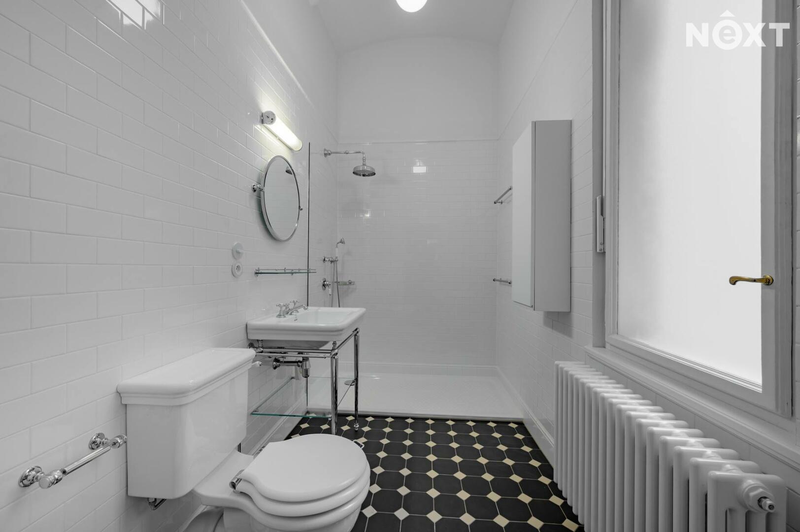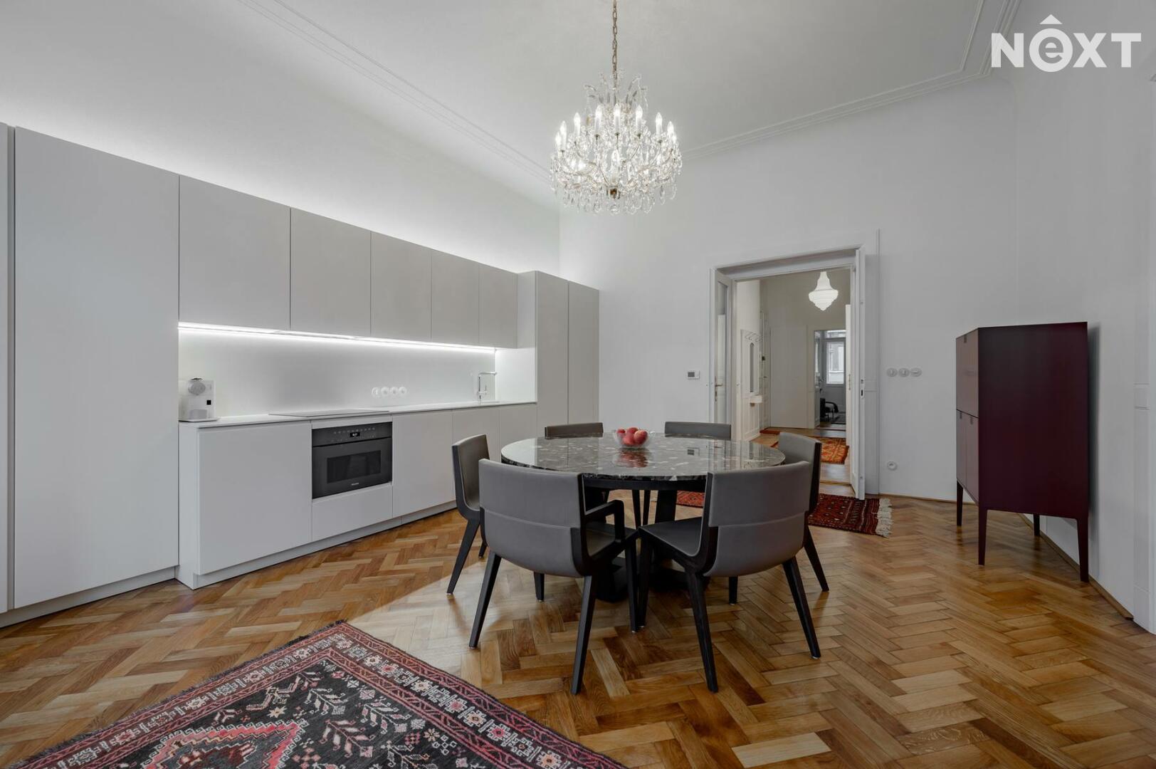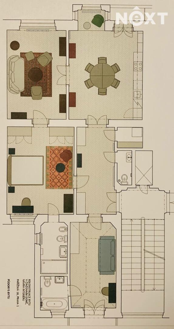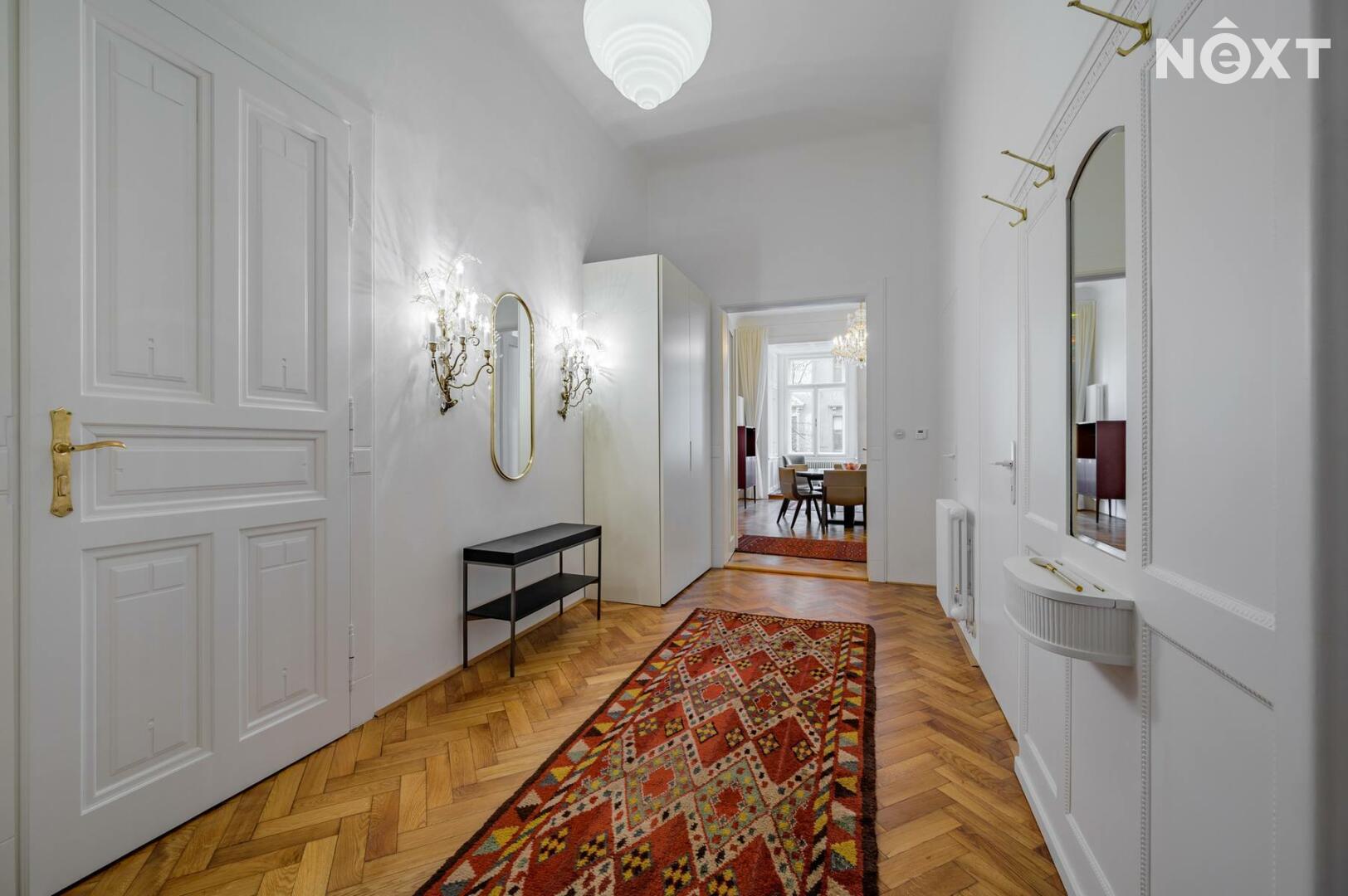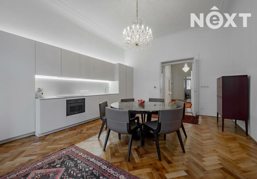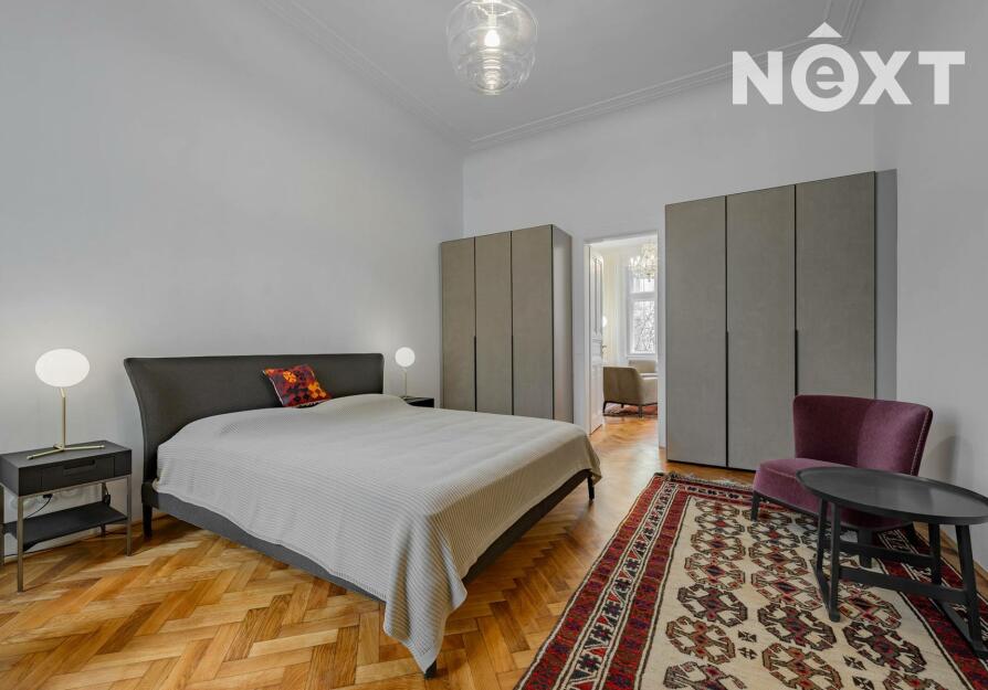 It consists of an entrance hall, lounge with a dining room and kitchenette with access to the balcony and alcove facing Pařížská Street with a beautiful views, 2 separate bedrooms facing the quiet courtyard, each with its bathroom and one of the bedrooms has a balcony, toilet for guests and chamber with a washing machine and dryer. The apartment offers a total of 3 toilets and 2 bathrooms (bathroom with a bidet, toilet and shower, bathroom with a tub and toilet). Fully equipped kitchen with a dining room. Parquet floors, stucco ceilings, crystal chandeliers. Furnished with a custom furniture and Maxalto mobile furniture. A niche with a view of Pařížská Street and the Old Town Square. The apartment has a spacious cellar. Available immediately. Internet connection. Pro komunikaci uvádějte evidenční číslo zakázky N114321.