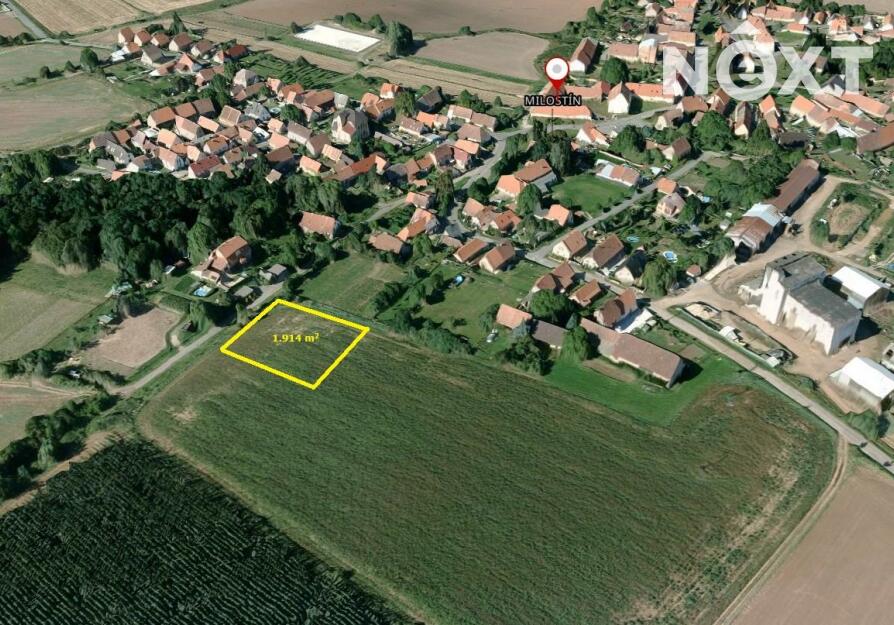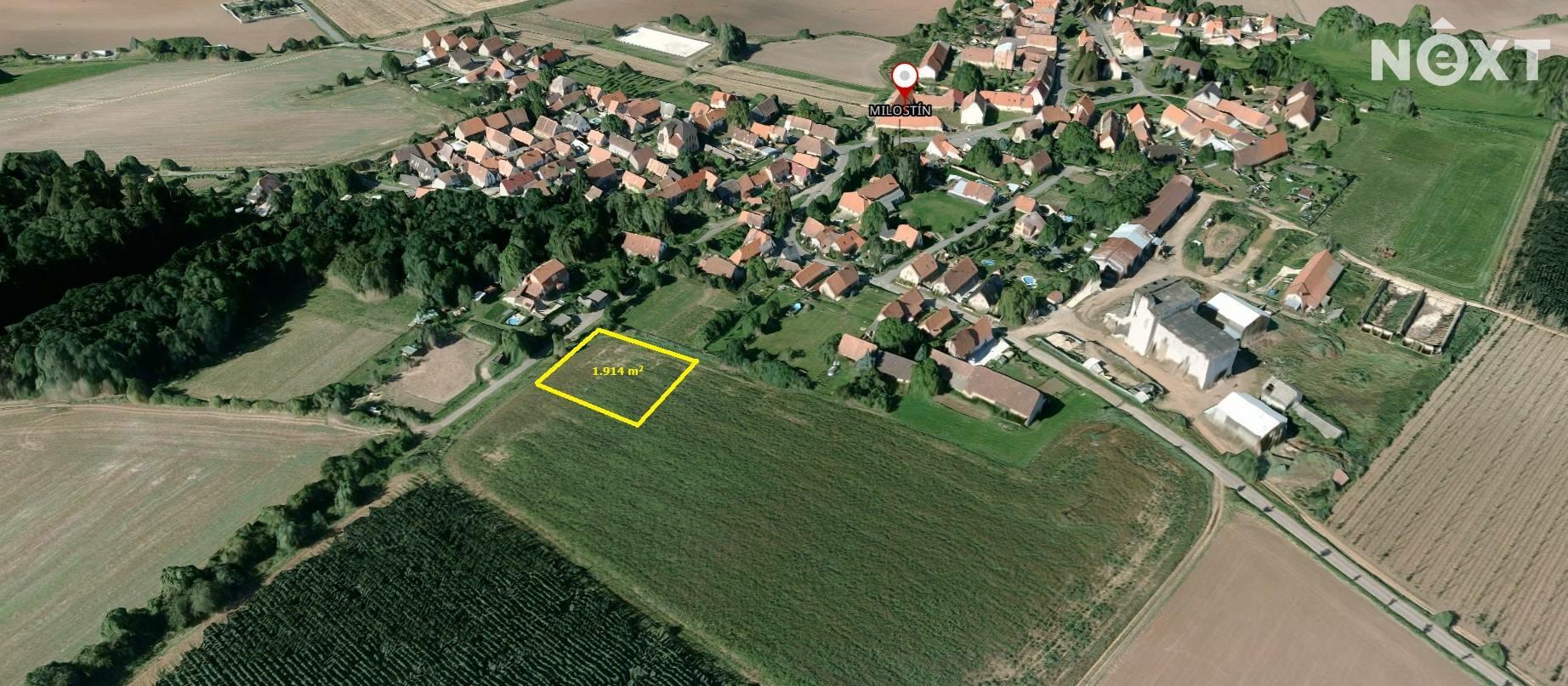 Nabízím k prodeji stavební pozemek o výměře 1.914 m² v obci Milostín, okres Rakovník, vzdálené jen 70 km od Prahy.
