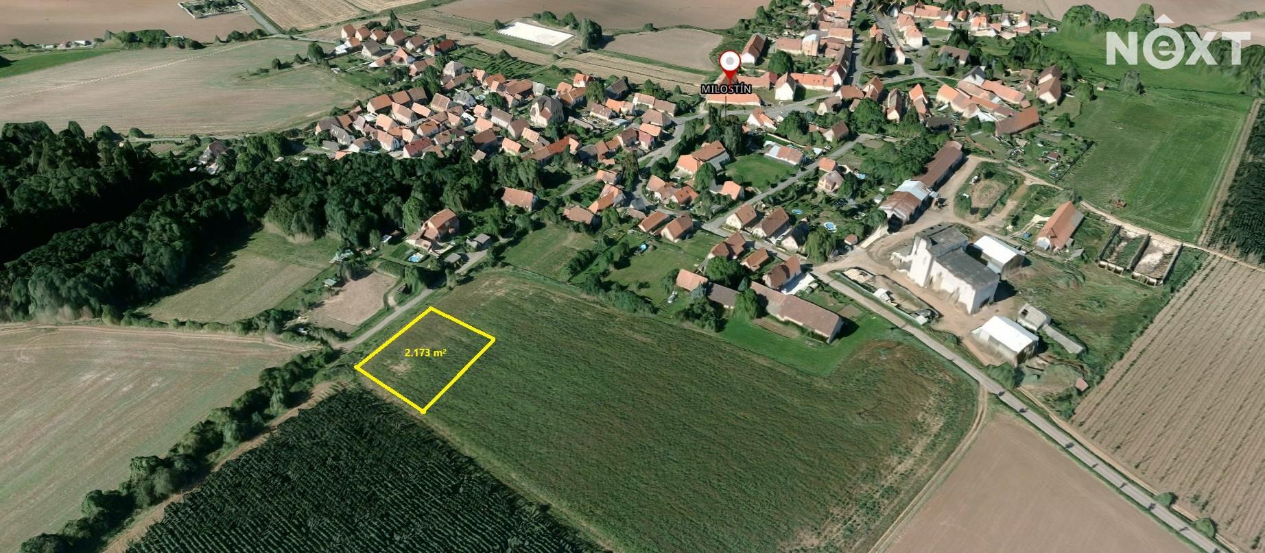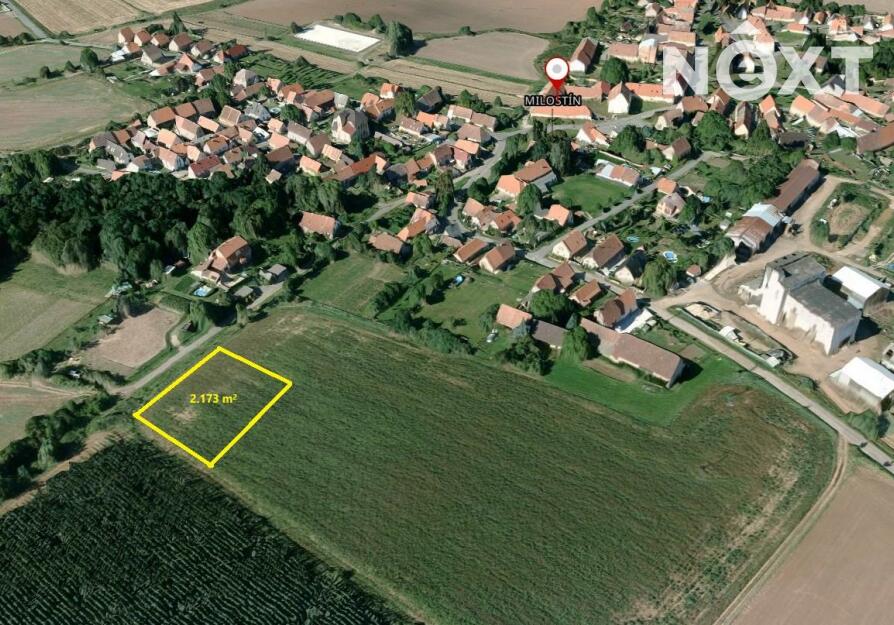 K prodeji nabízím stavební pozemek o ploše 2.173 m² v obci Milostín, okres Rakovník, vzdálené přibližně 70 km od Prahy.