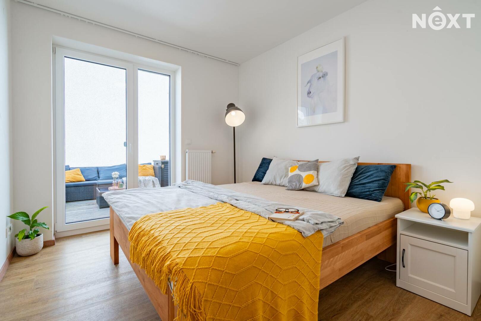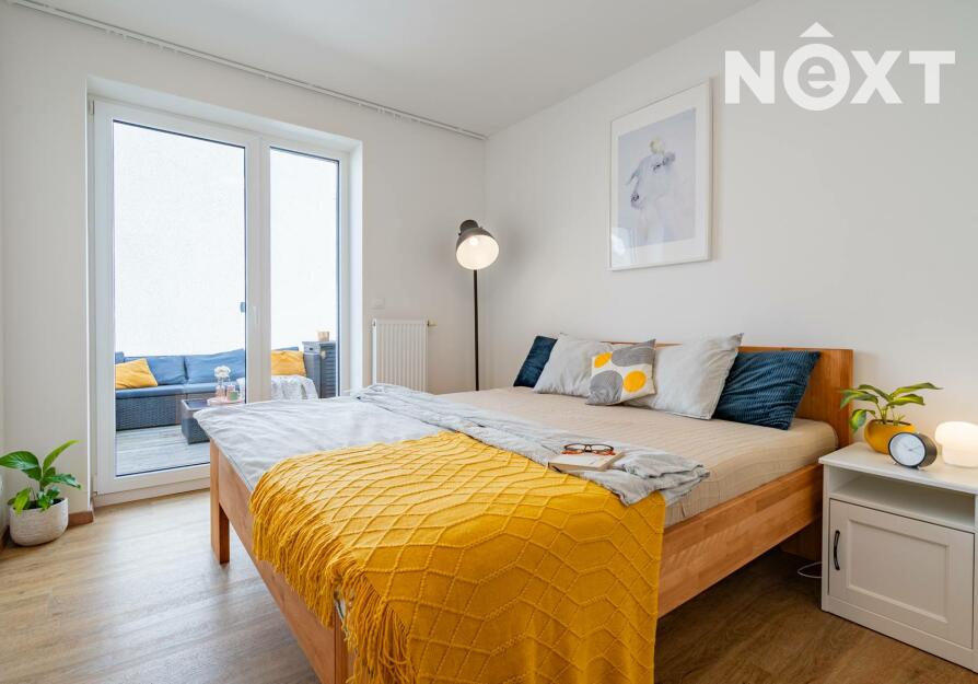 Z obývacího pokoje i ložnice je přímý vstup na terasu, která bytu dodává jedinečný charakter. Okna jsou navíc vybavena předokenními žaluziemi, které zajišťují soukromí i tepelný komfort.