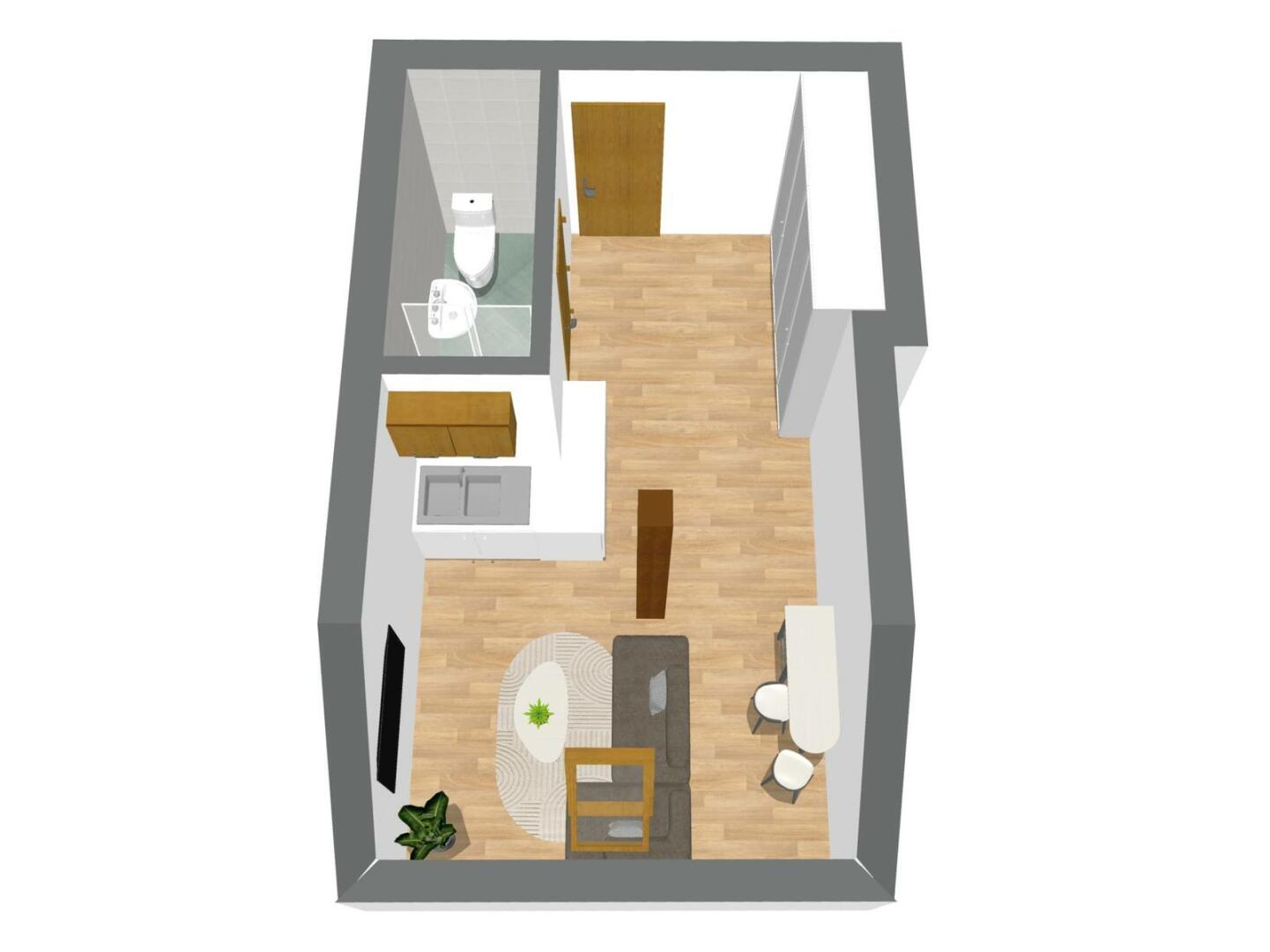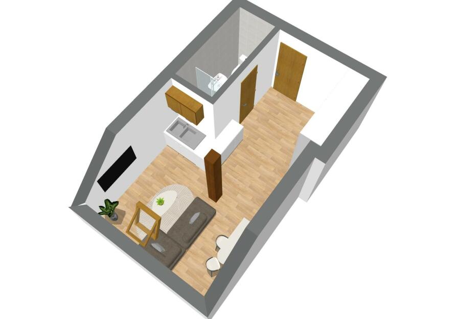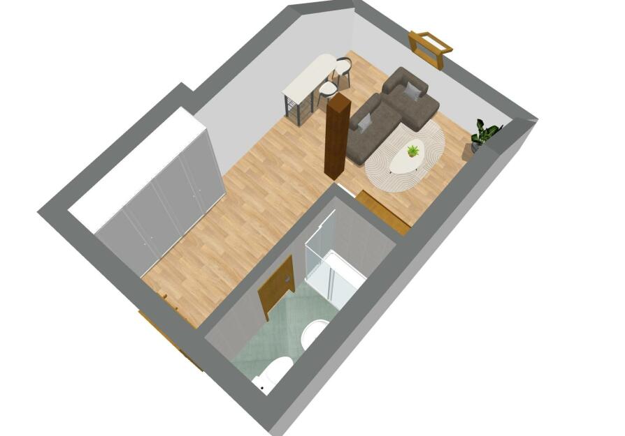 Byt je dispozičně řešen jako jeden otevřený prostor s kuchyňským koutem a obývací částí. Součástí je koupelna se sprchovým koutem, umyvadlem a toaletou. Díky střešnímu oknu působí byt světlým a útulným dojmem, dřevěný trám navíc dodává interiéru charakter podkrovního bydlení.