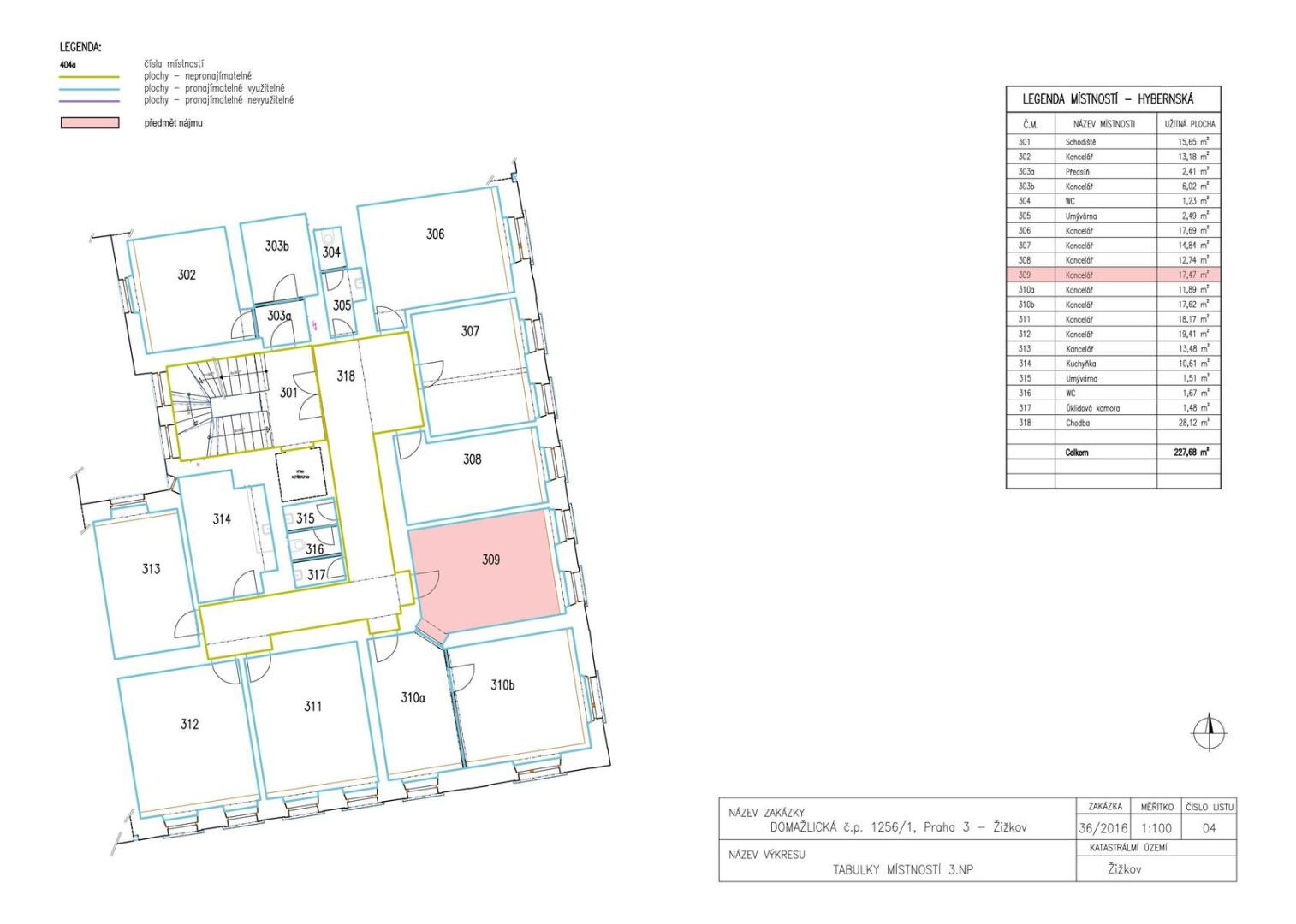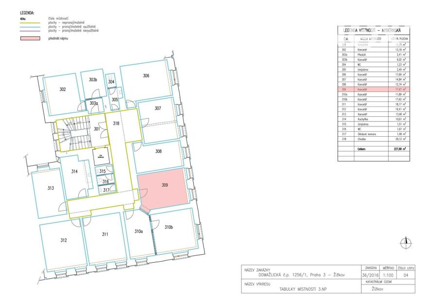 K pronájmu nabízíme kancelář v administrativní budově na Praze 3 – Žižkov, ve 2. patře, označenou na plánku jako místnost č. 309. Budova je po kompletní rekonstrukci a modernizaci, vybavena vlastní telefonní ústřednou a rozvody datových i telefonních sítí v celém objektu. Lokalita nabízí výbornou dopravní dostupnost – v pěší vzdálenosti se nachází autobusová i tramvajová zastávka, stanice metra „B“ a „C“ Florenc je dosažitelná během 4 minut jízdy autobusem. V případě zájmu či pro více informací mě prosím kontaktujte. Pro komunikaci uvádějte evidenční číslo zakázky N114349.