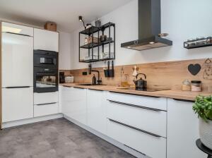 Obývací část – prostorný obývací pokoj s krbem na pelety, propojený s otevřenou kuchyní a jídelnou. Posuvné dveře vedou přímo do zimní zahrady a zároveň na terasu a zahradu.