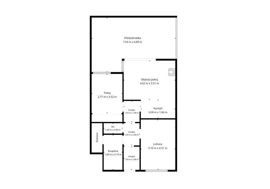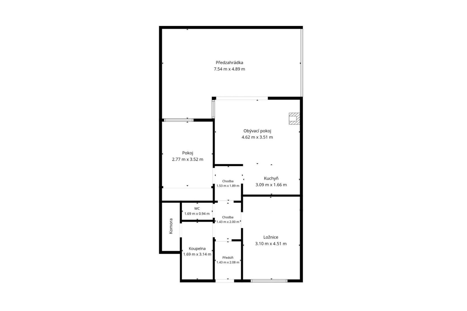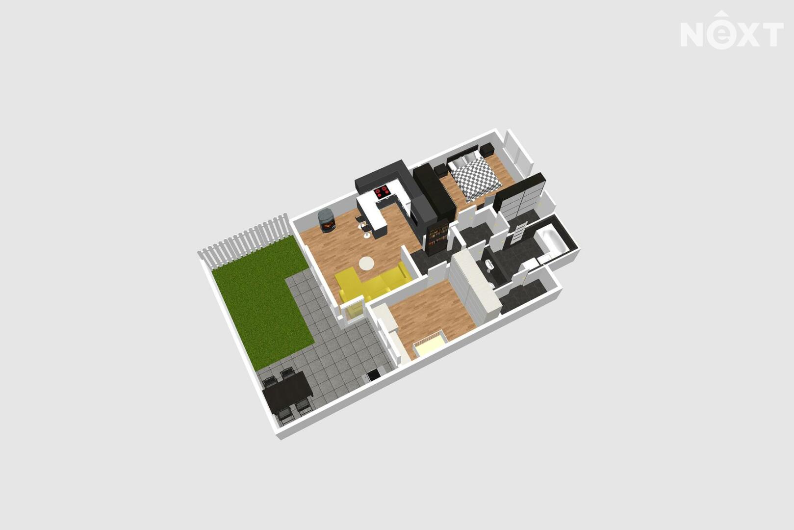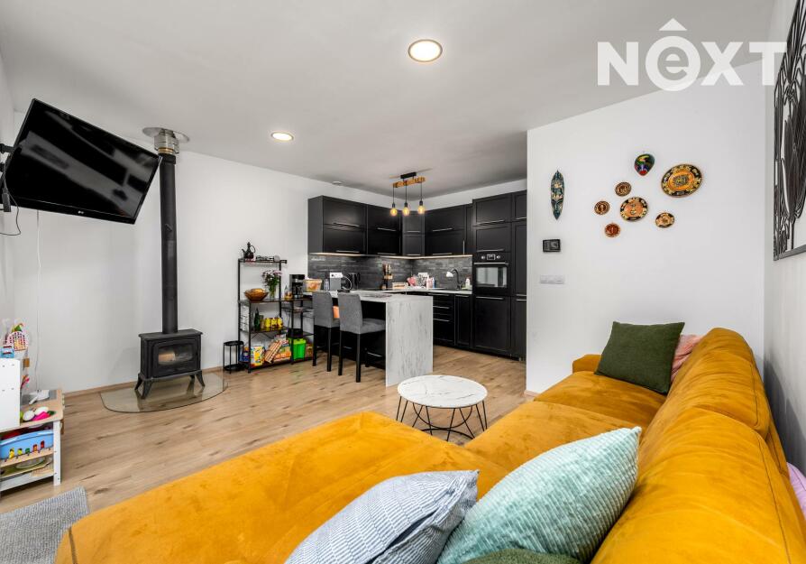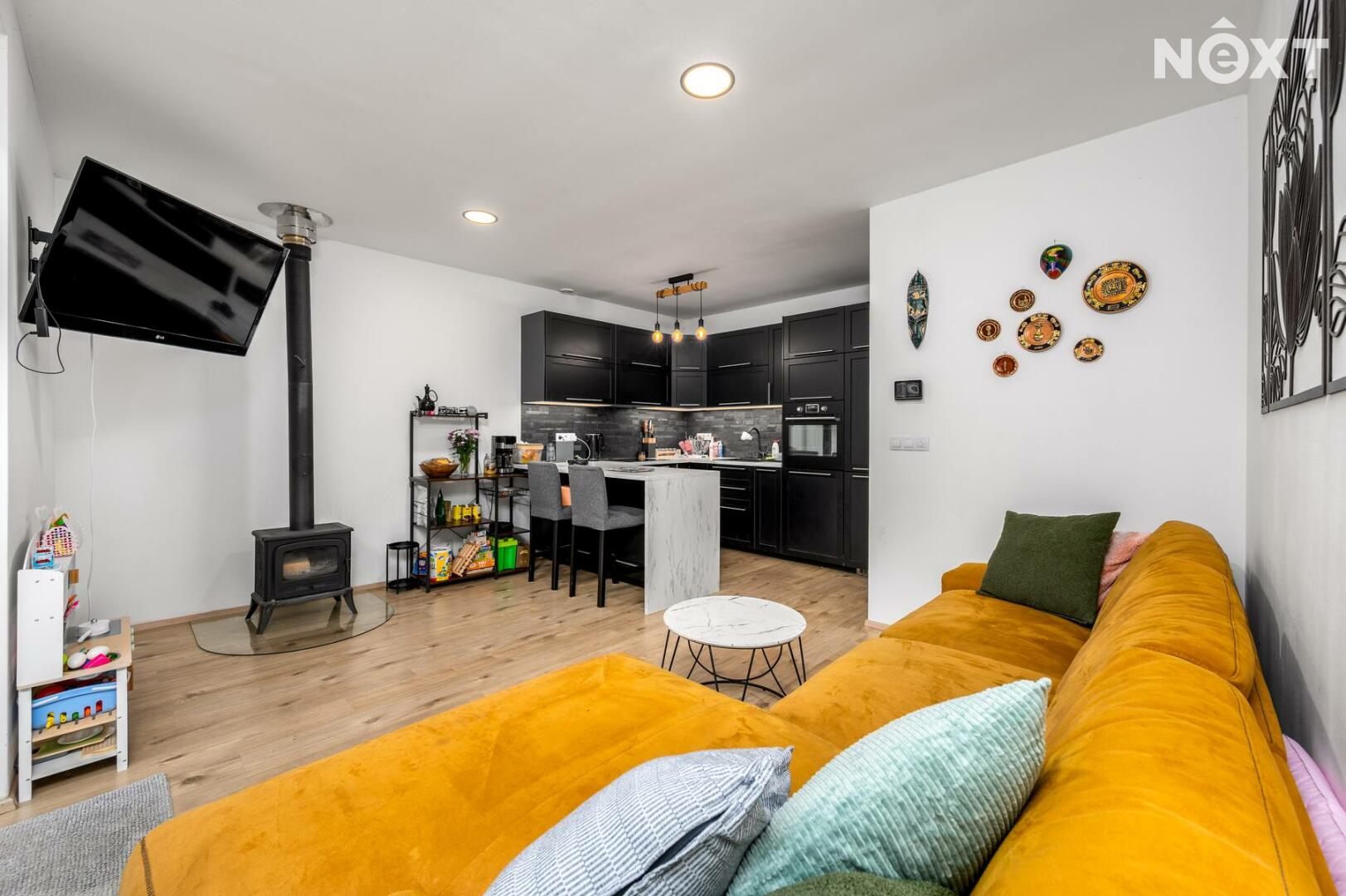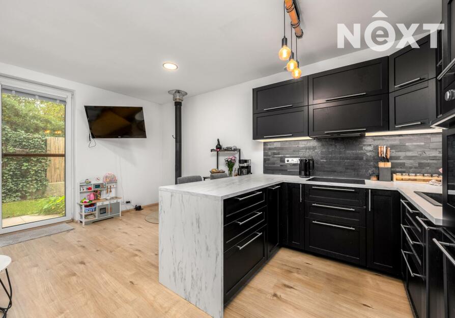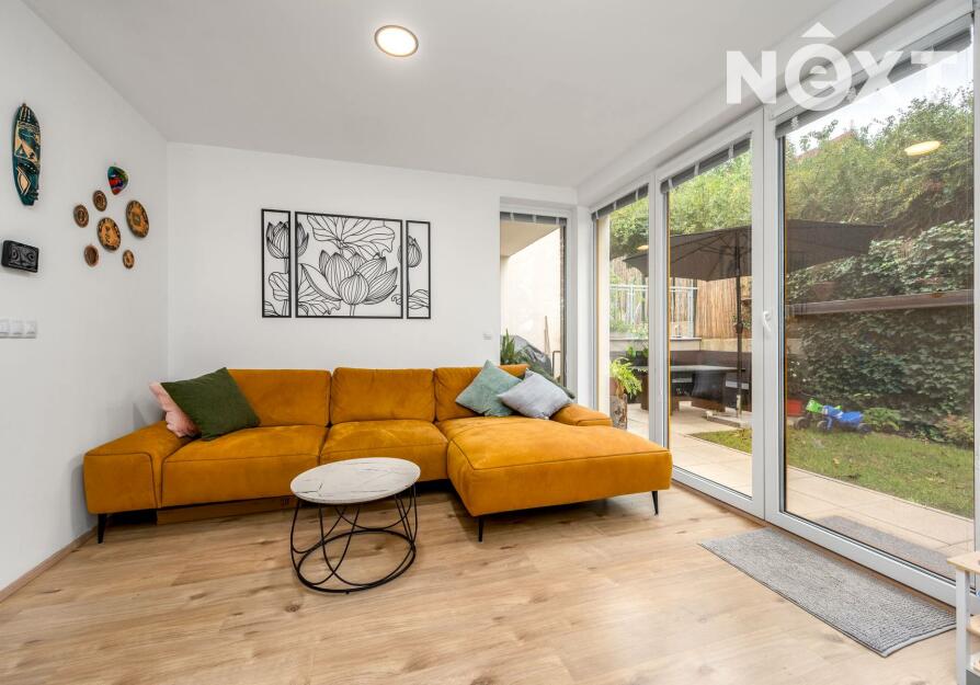 Srdcem bytu je prostorný obývací pokoj (22 m²) s dominantní moderní kuchyní a romantickým krbem, který dotváří útulnou atmosféru. Z obývací části je přímý vstup na soukromou zahradu o velikosti 36 m², ideální pro ranní kávu, odpočinek na slunci nebo večerní posezení s přáteli.