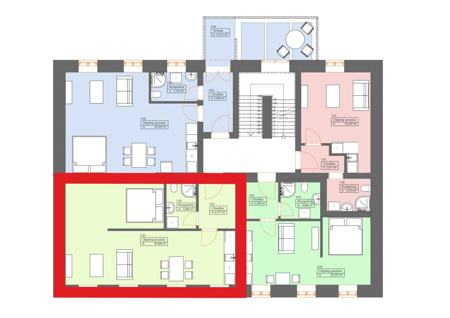 Byt tvoří vstupní chodba o výměře 4,78 m², koupelna s plochou 3,90 m² a prostorný obytný prostor s kuchyňským koutem o velikosti 39,60 m².