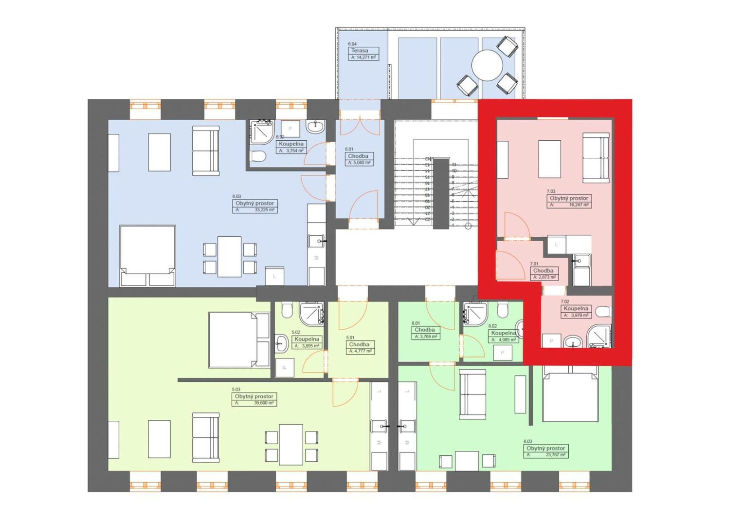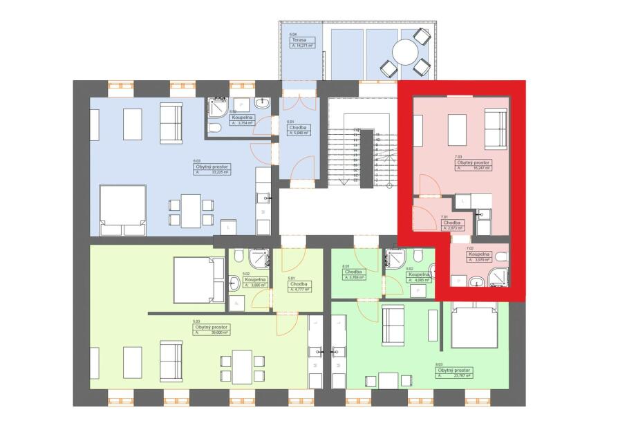 Byt tvoří vstupní chodba o výměře 2,87 m², koupelna o velikosti 3,98 m² a obytný prostor s kuchyňským koutem o ploše 16,25 m². Prošel kompletní rekonstrukcí, během které byly provedeny nové rozvody elektřiny, položeny nové podlahy, zrekonstruována koupelna i kuchyňský kout a obnoveny všechny povrchy.
