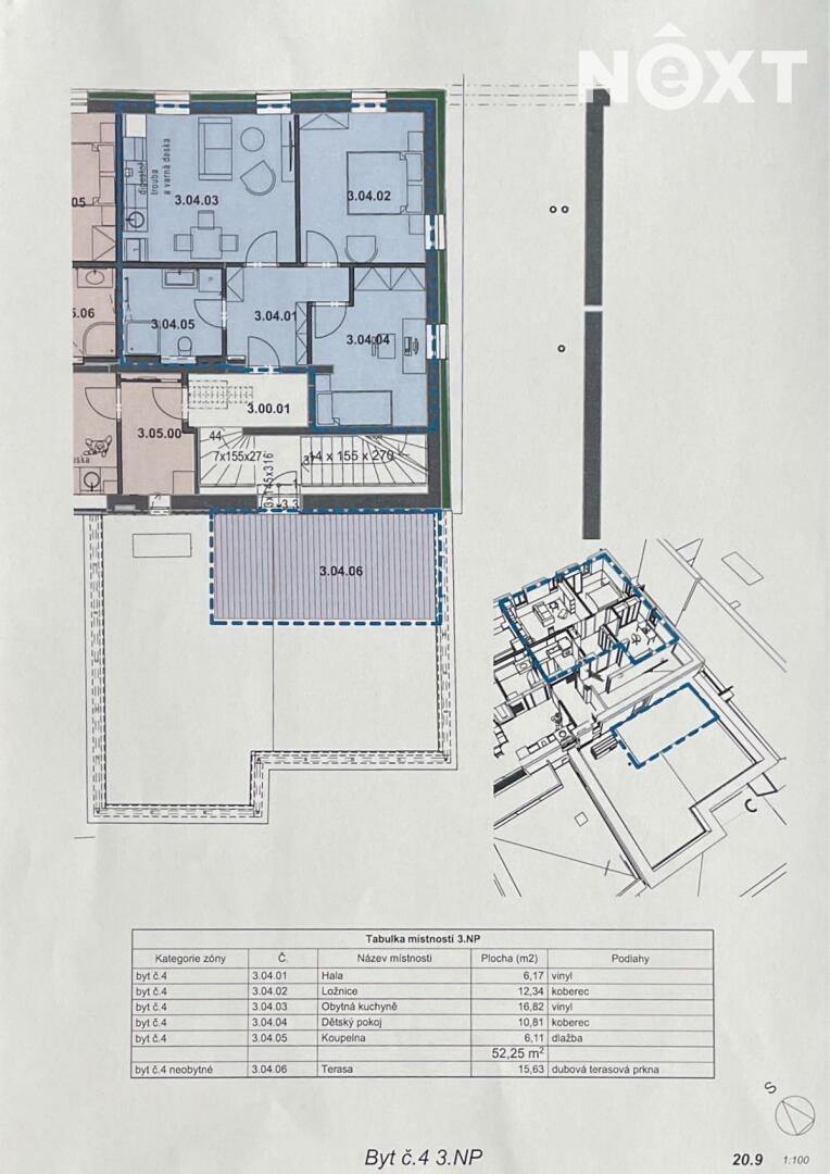 Bytová jednotka o celkové užitné ploše 71,24 m² s výhledem na jih, se nachází ve 3.NP a sestává se ze vstupní haly (6,17 m²), koupelny po levé straně (6,11 m²), kuchyně a obývacího pokoje (16,82 m²) a dvou pokojů po pravé straně (12,34 m² a 10,81 m²). K bytu náleží prostorná terasa (15,63 m²), která je umístěna ve 3.NP přes chodbu u hlavního schodiště a také skladovací kóje v přízemí (3,36 m²).