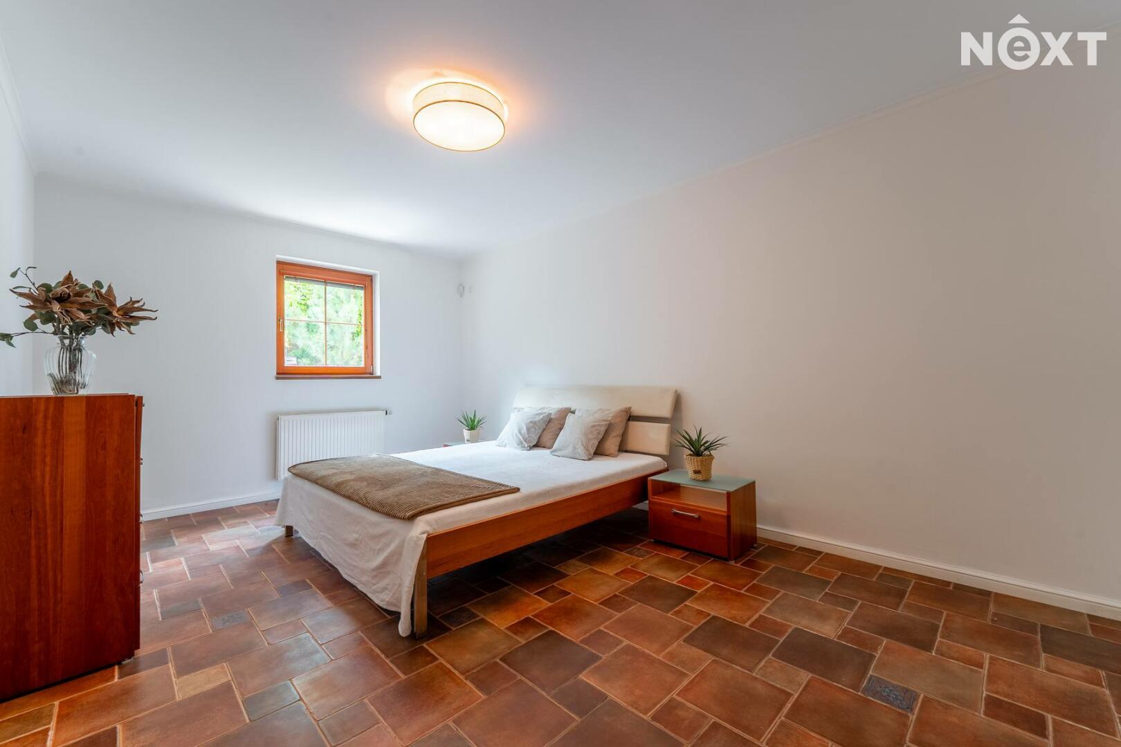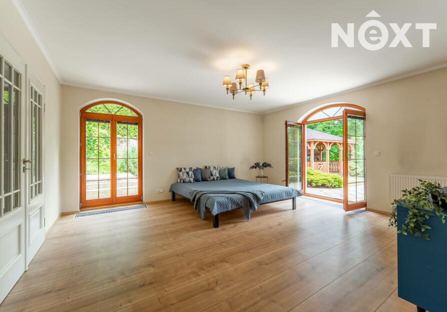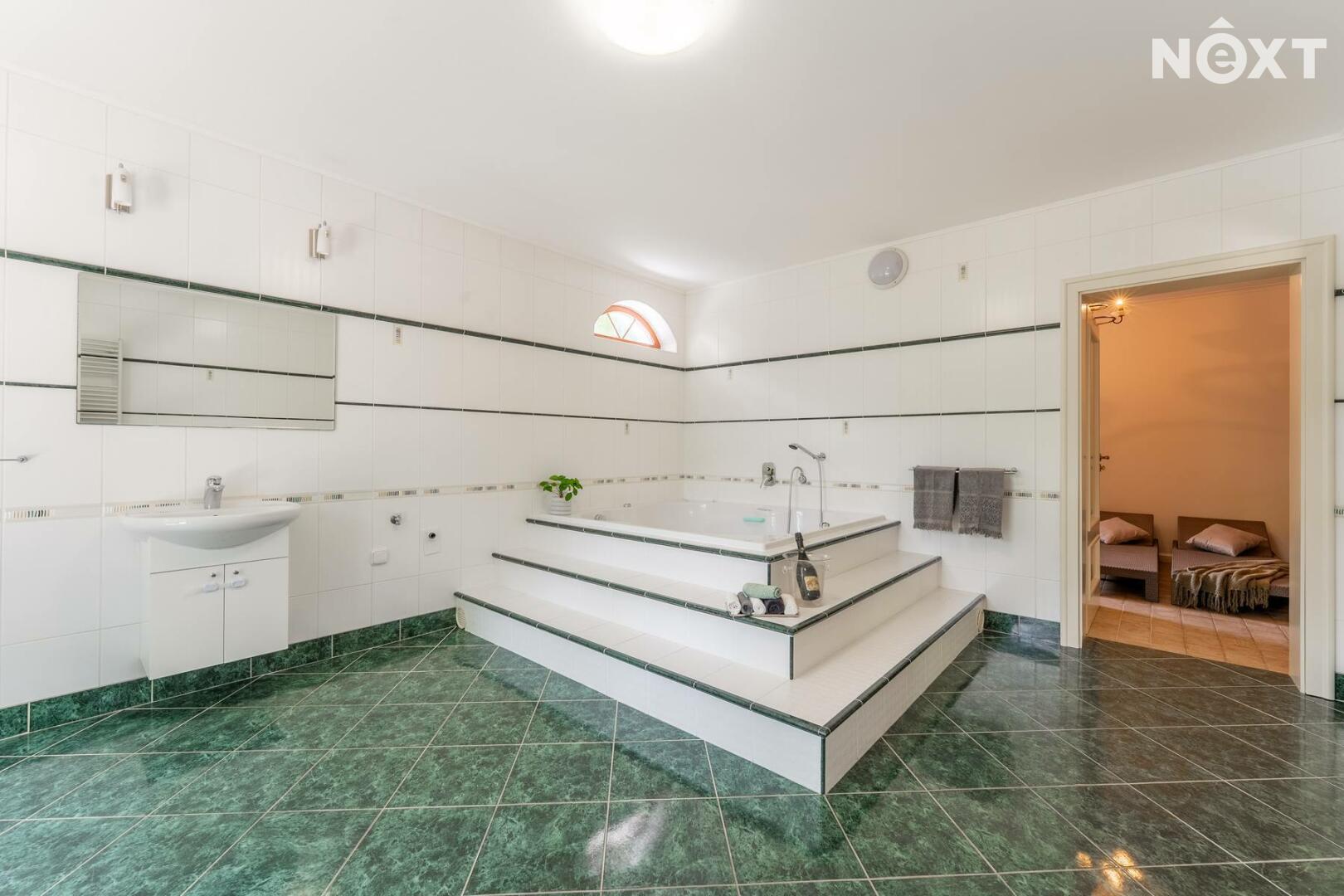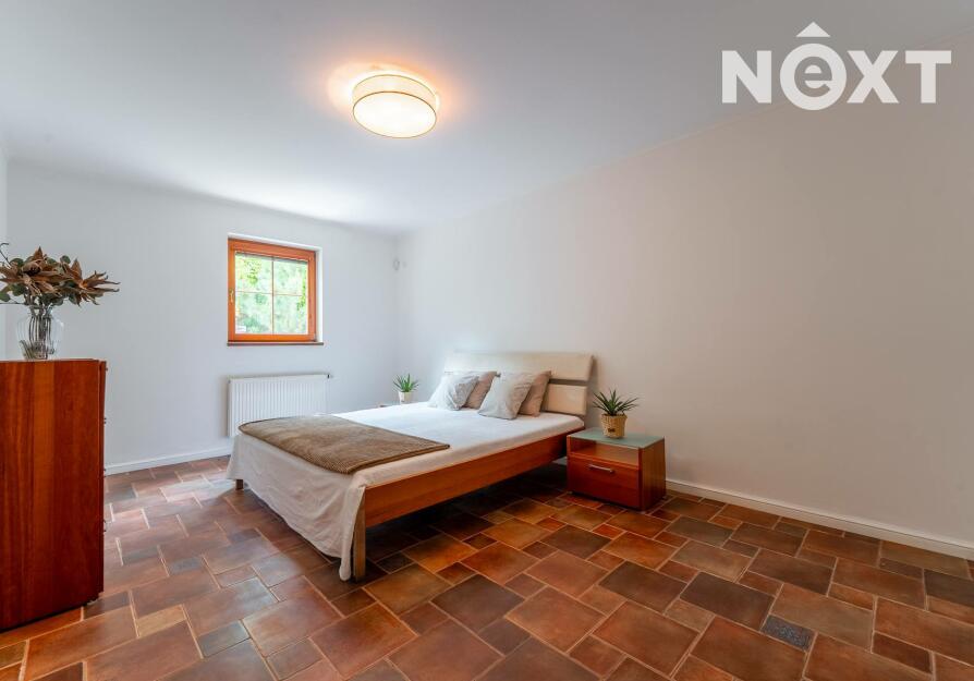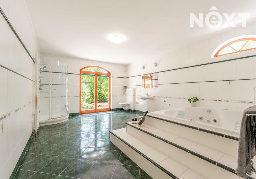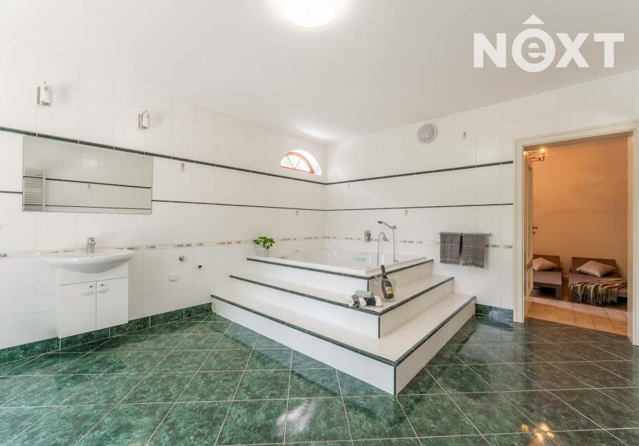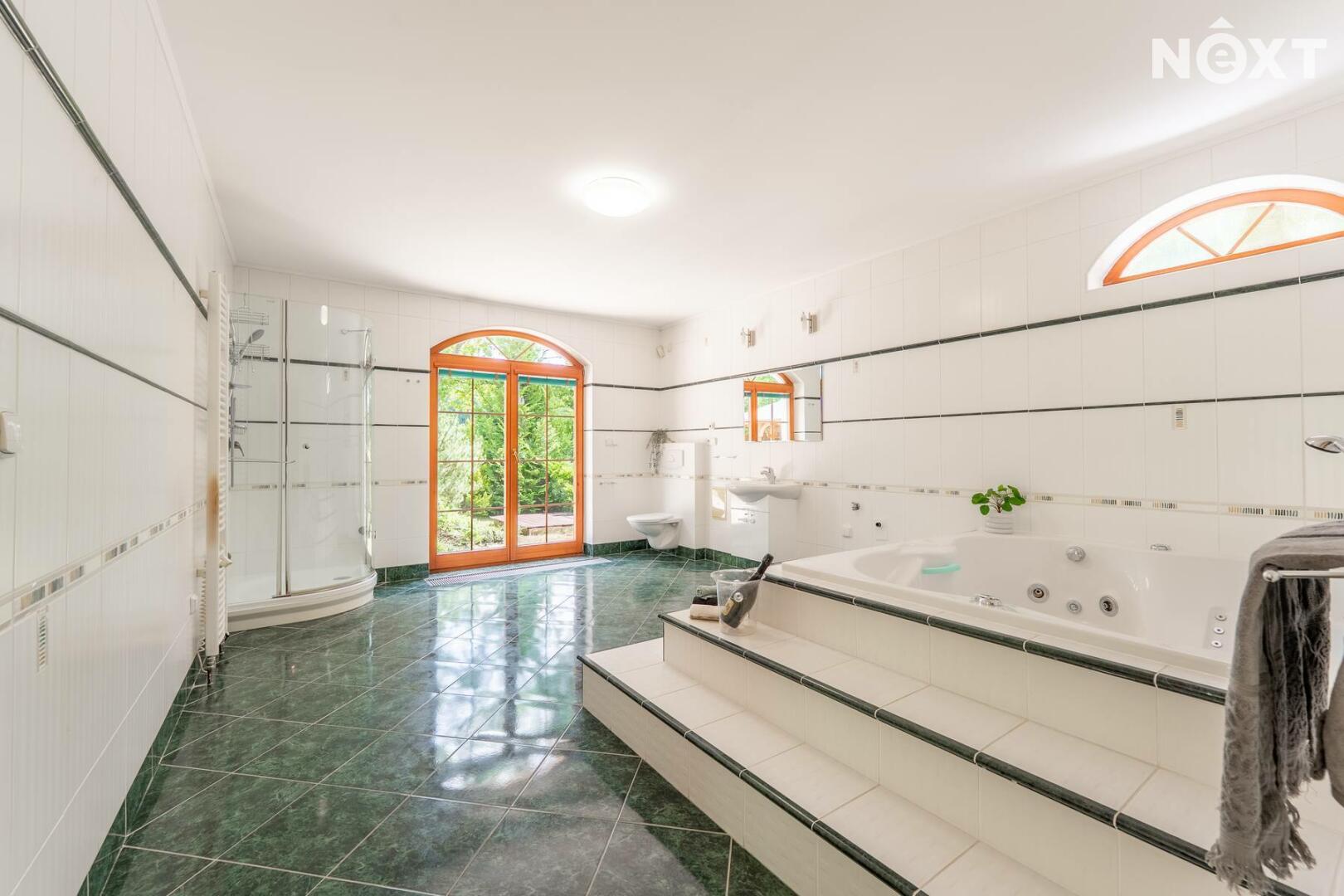 V dolním podlaží najdete hlavní ložnici, další dva pokoje a nadstandardní koupelnu s velkou masážní vanou. Technické zázemí zajišťuje soběstačnost: vlastní vrtaná studna, čistička, elektrokotel s podlahovým vytápěním, bojler, vodárna a kamerový systém.