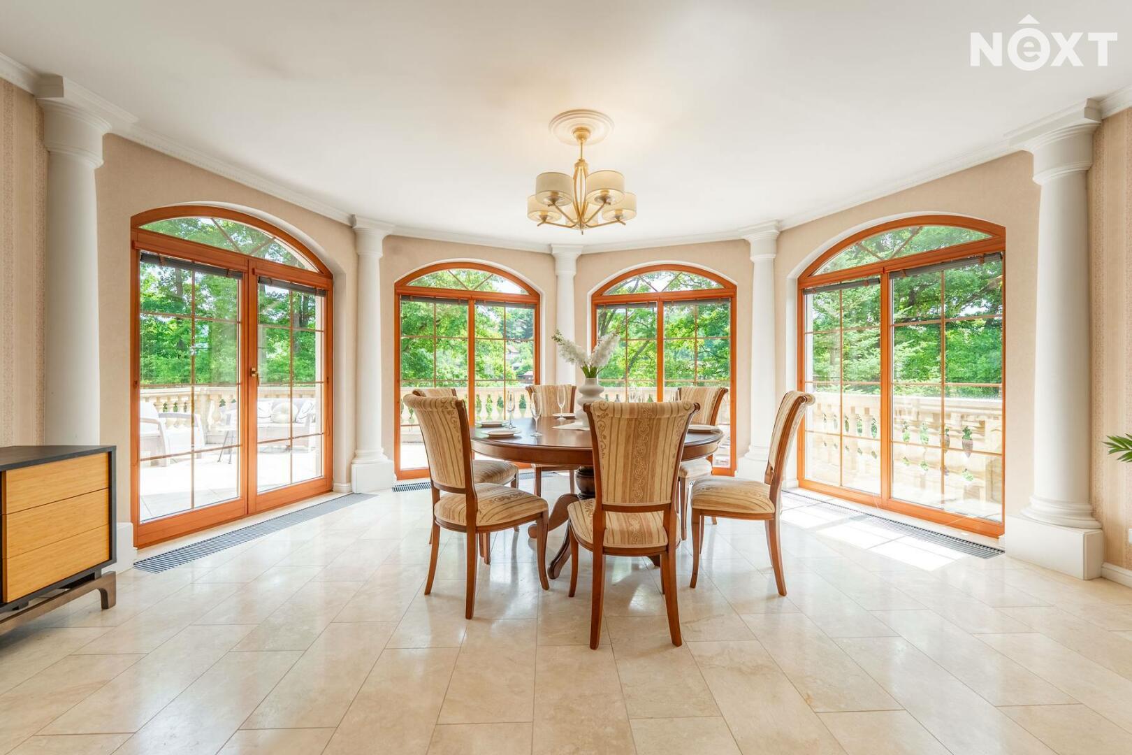 На першому поверсі розташовані: вхідна зала, кабінет, представницький простір для гостей, простора вітальня з каміном, поєднана зі столовою та кухнею. Завдяки великоформатним вікнам інтер’єр світлий і відкритий у сад із терасою. Екстер’єр з альтанкою та пірсом пропонує ідеальне місце для відпочинку.