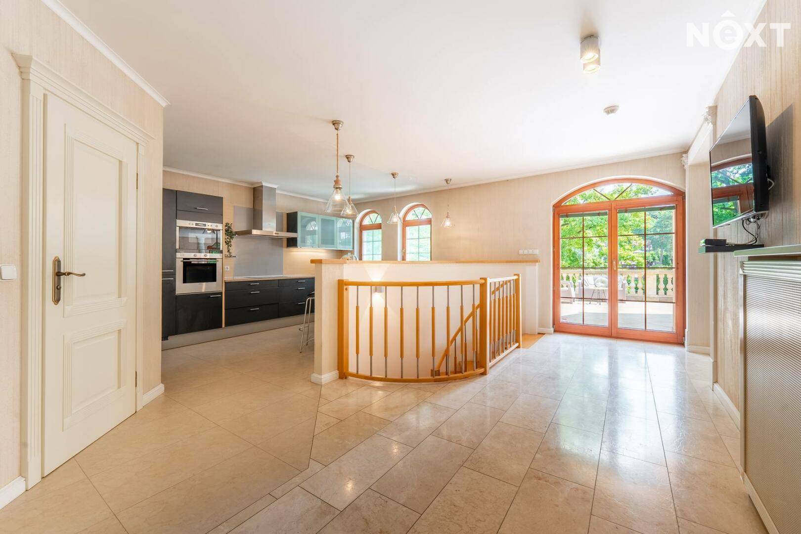 Dům o užitné ploše 236 m² disponuje dvěma podlažími. V přízemí se nachází vstupní hala, pracovna, reprezentativní společenský prostor, prostorný obývací pokoj s krbem propojený s jídelnou a kuchyní. Díky velkoformátovým oknům je interiér světlý a otevřený do zahrady s terasou. Exteriér s altánem a molem nabízí ideální místo k relaxaci.