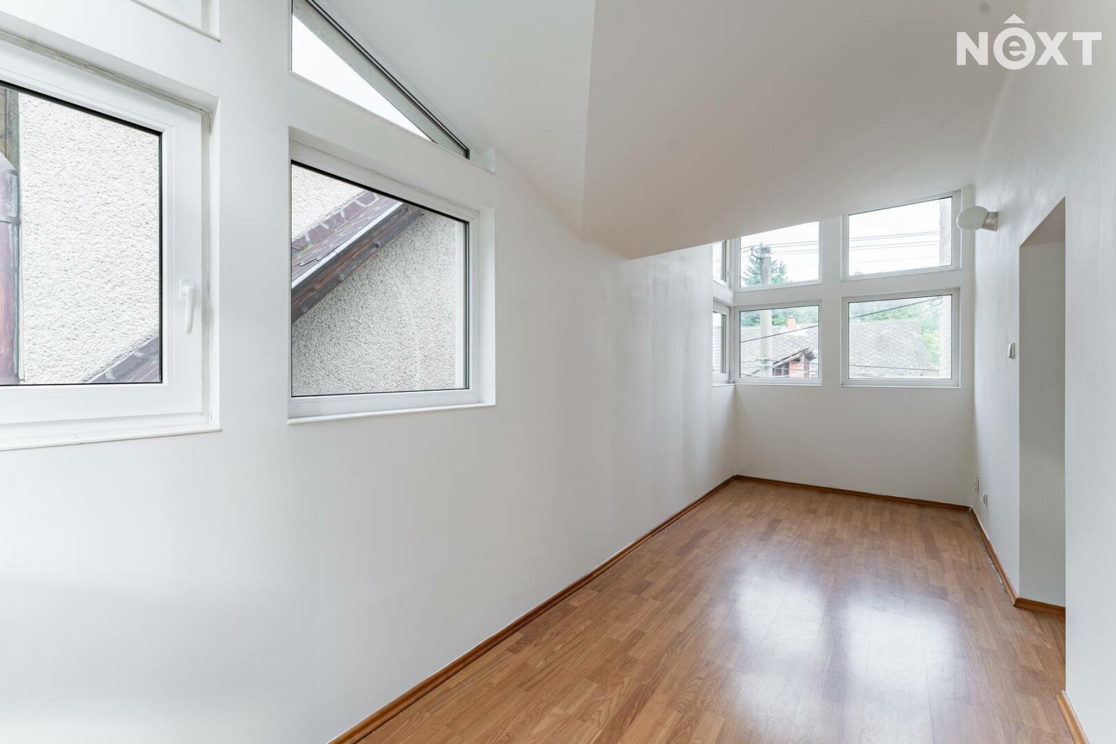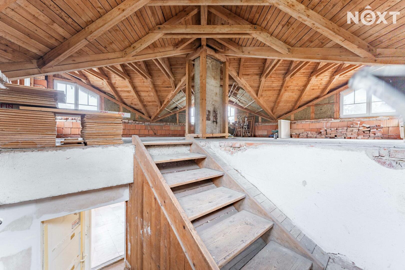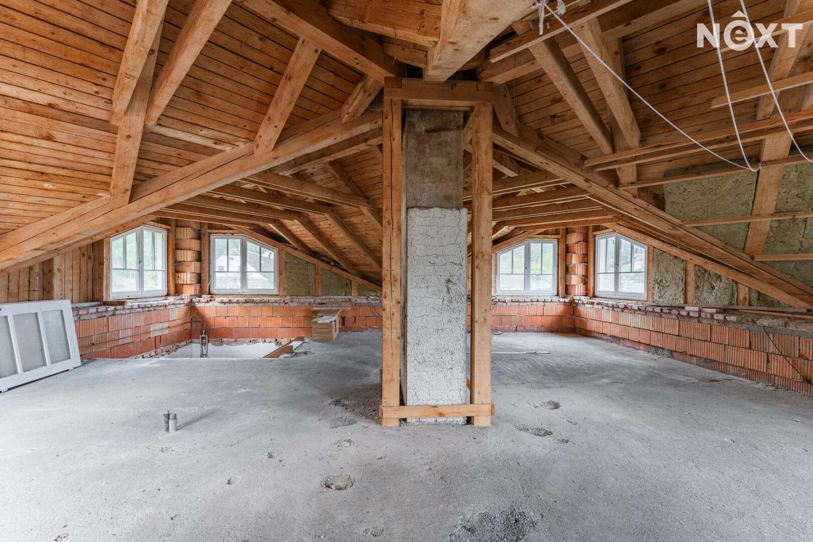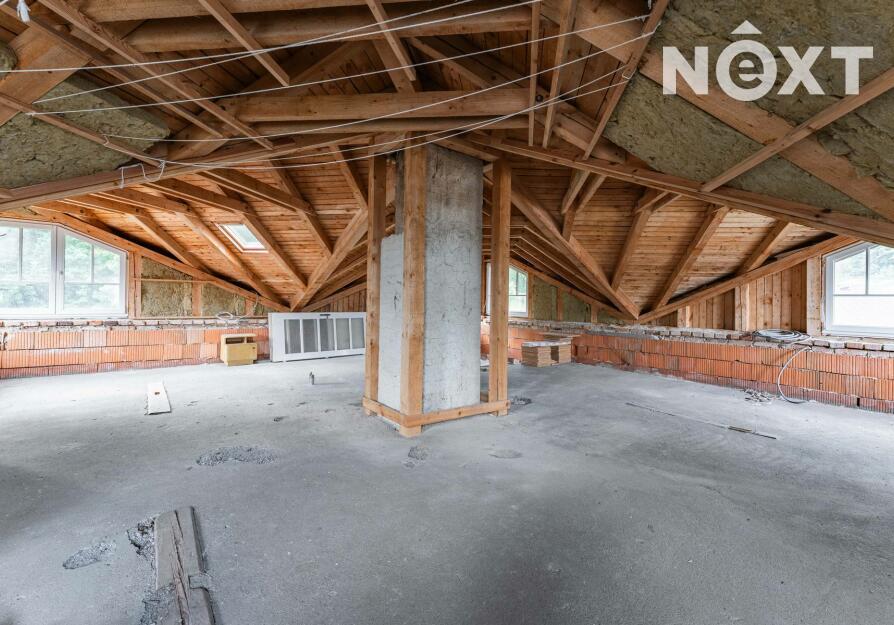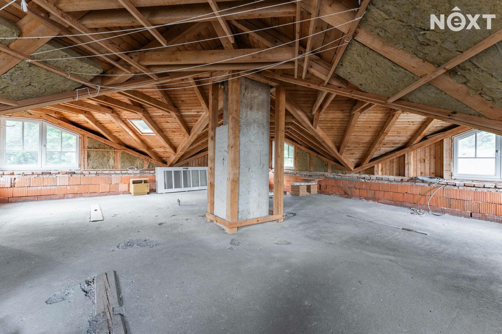 Podkroví domu díky atypické střešní konstrukci nabízí další prostor, který lze využít například pro pracovnu, hernu, nebo další obytné místnosti.
