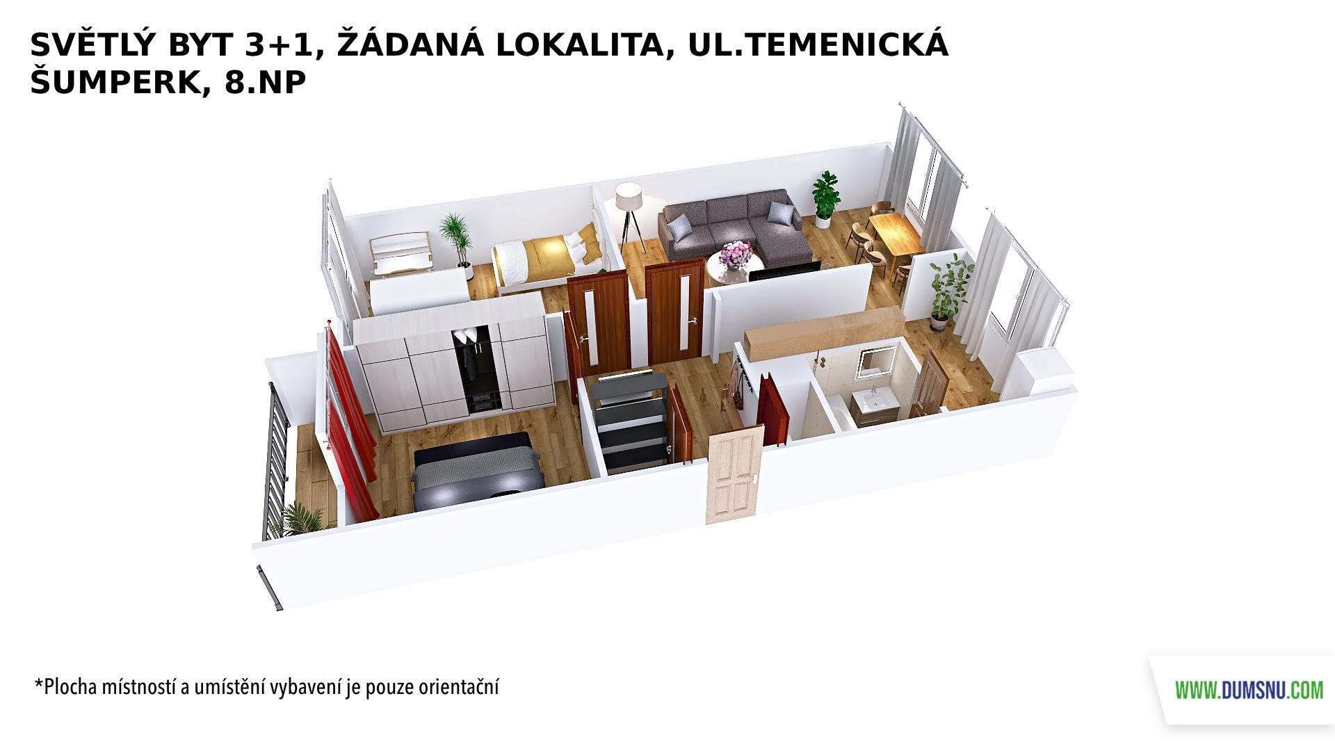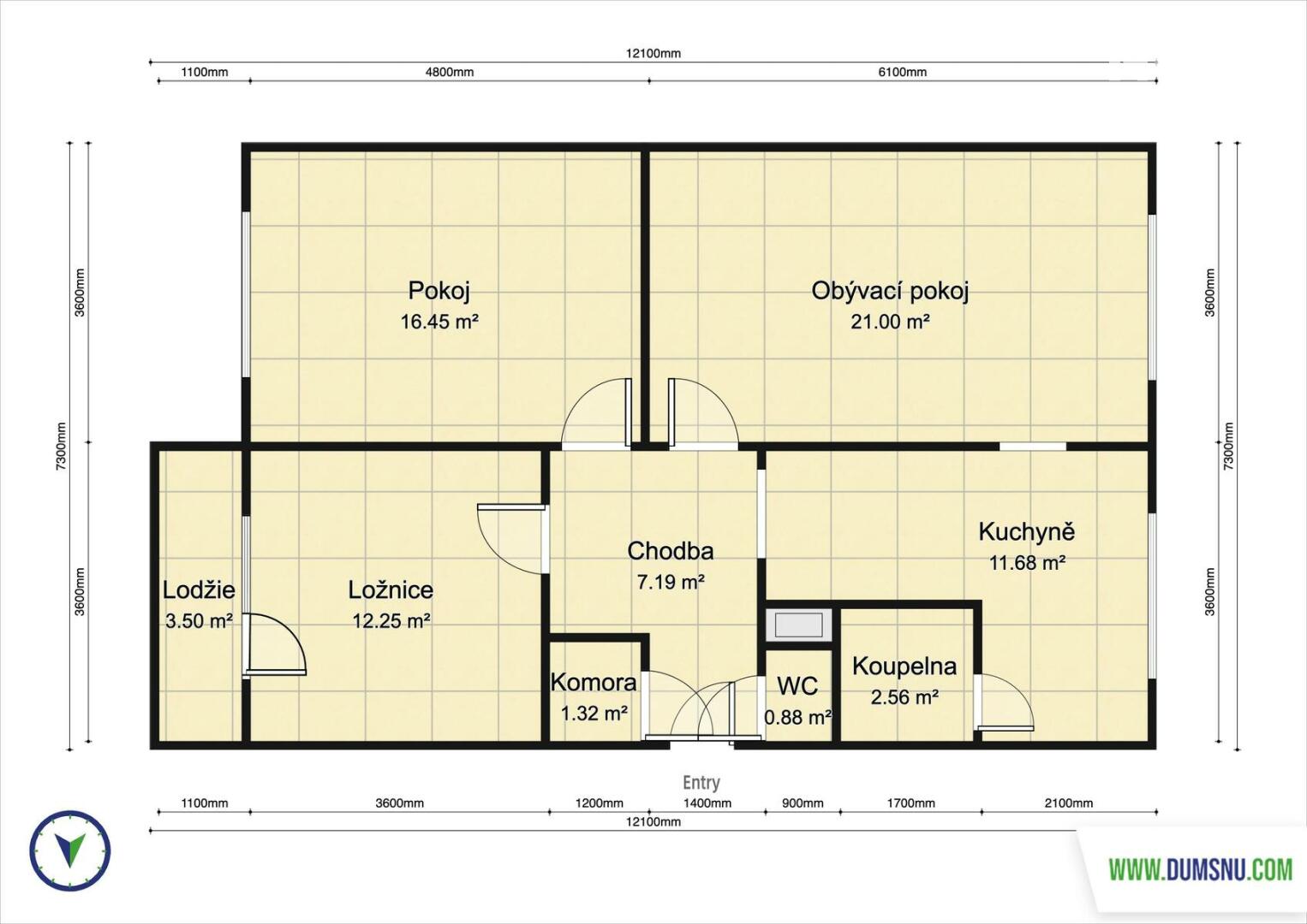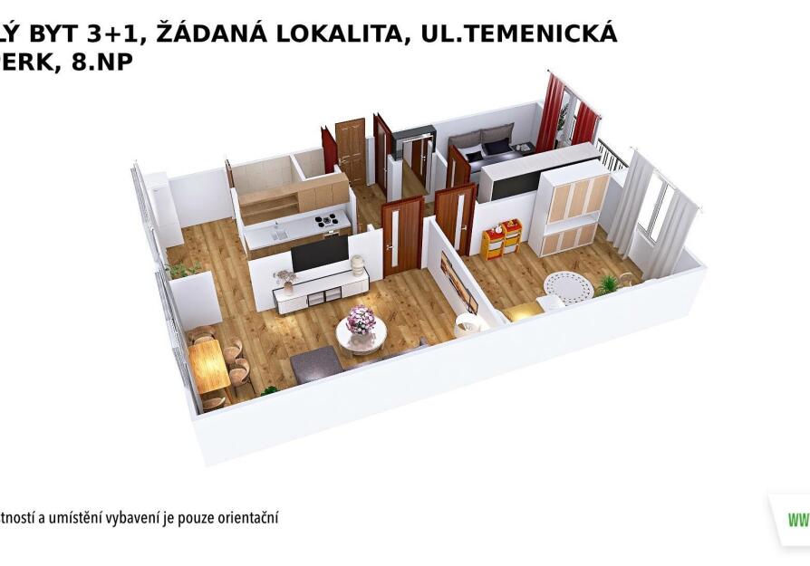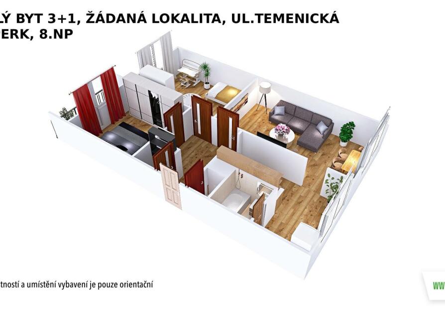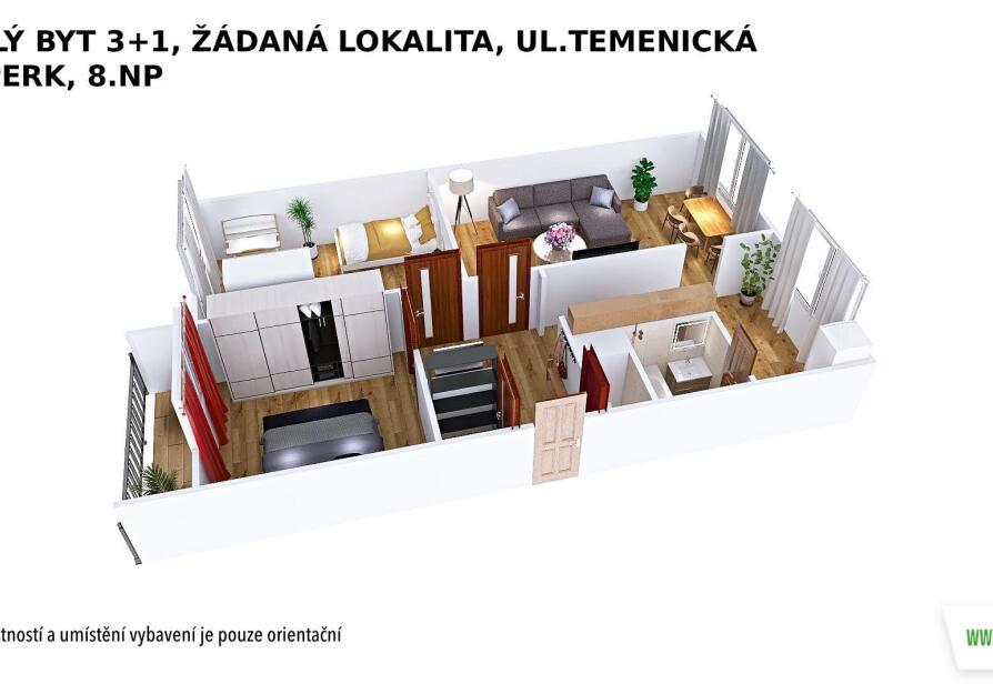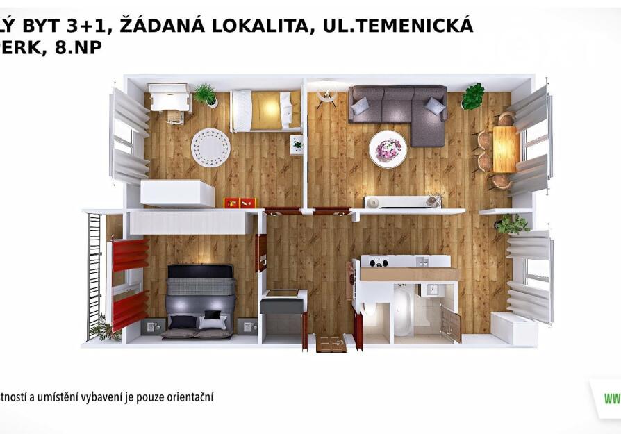 Po vstupu do bytu vás přivítá chodba s komorou a samostatnou toaletou. Z chodby se dostanete do ložnice s přímým vstupem na lodžii, dále do prostorného pokoje, který se hodí jako dětský pokoj nebo pracovna, a také do velkého obývacího pokoje s jídelním koutem. Na obývák navazuje samostatná kuchyně, hned za ní je umístěná koupelna.
