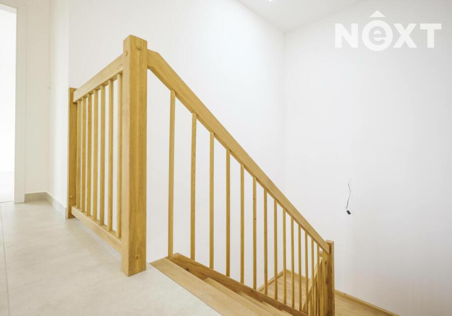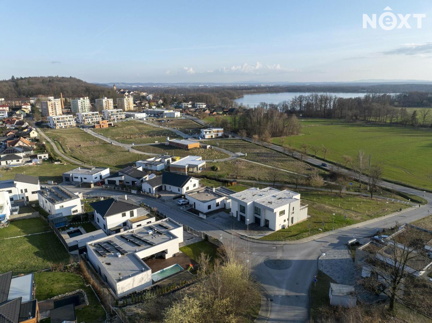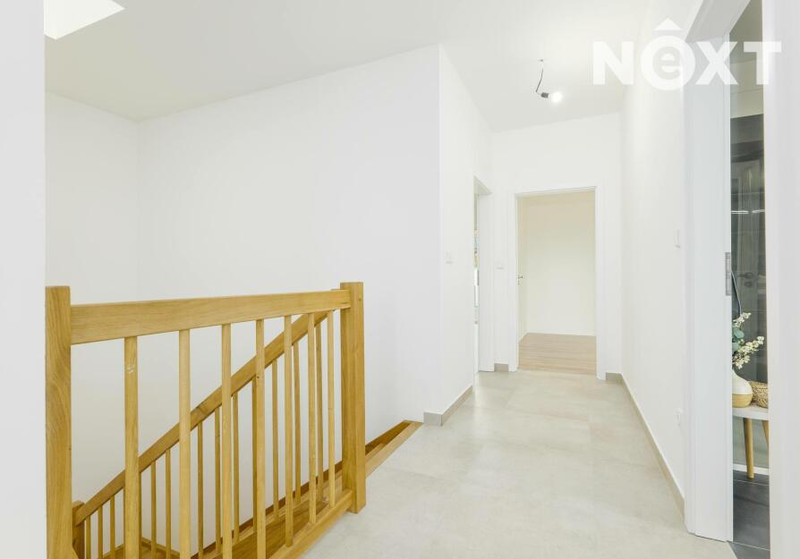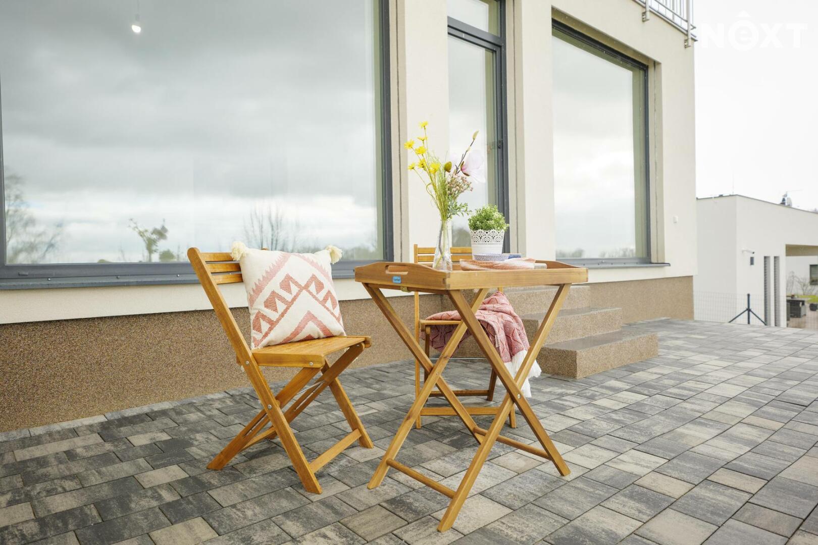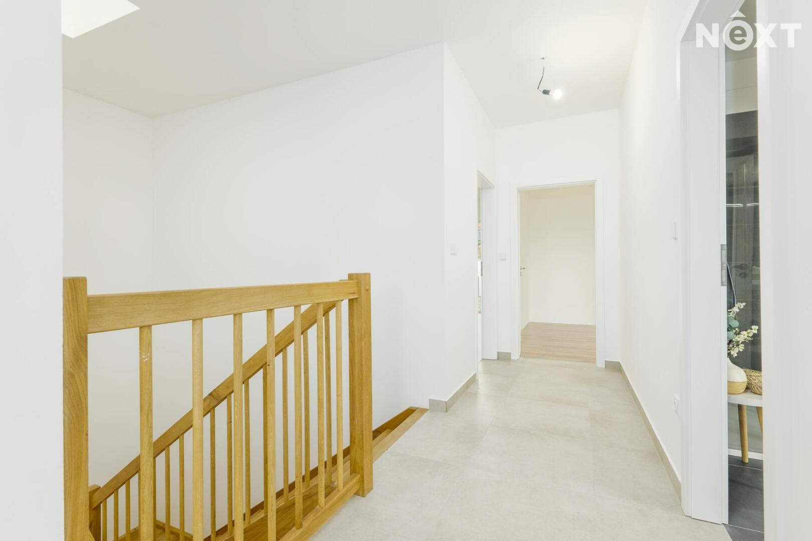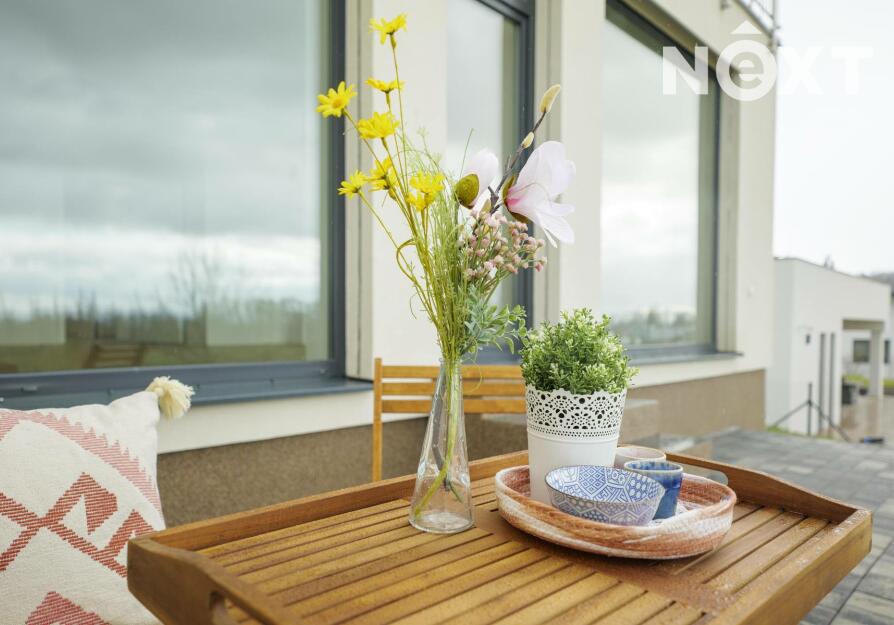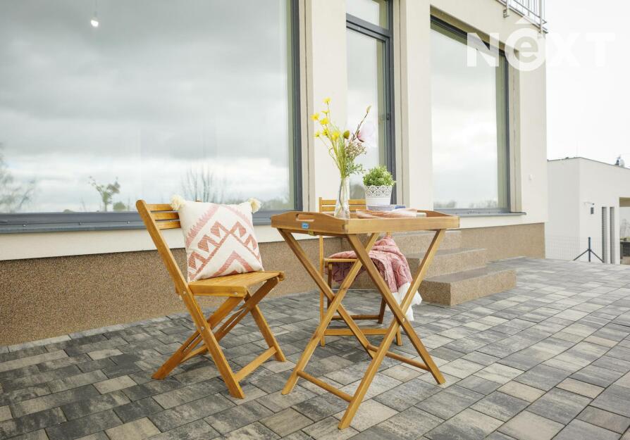 Dominantou bytové jednotky je velkorysý obytný prostor s kuchyní o celkové rozloze 56 m². Díky velkoformátovým proskleným plochám a přímému vstupu na venkovní terasu o výměře 21 m² vzniká přirozené propojení interiéru s exteriérem. Jihozápadní orientace přináší dostatek slunečního světla, klid a otevřené výhledy do okolní přírody. Horní podlaží je koncipováno jako soukromá klidová zóna. Hlavní ložnice o rozloze 24,7 m² disponuje vlastní šatnou (7,1 m²) a vstupem na terasu s výhledem do okolní krajiny. Dva další pokoje o velikostech 21,9 m² a 17,4 m² poskytují dostatek prostoru pro rodinu, děti či pracovnu. Samostatná šatna o rozloze 7,6 m² zajišťuje nadstandardní úložné možnosti a luxusní koupelna s vanou, sprchovým koutem a toaletou (9,8 m²) splňuje vysoké nároky na komfort bydlení. Jednotlivé místnosti propojuje hala o velikosti 24,8 m², jejímž architektonickým prvkem je masivní dubové schodiště, které podtrhuje nadčasový charakter interiéru.