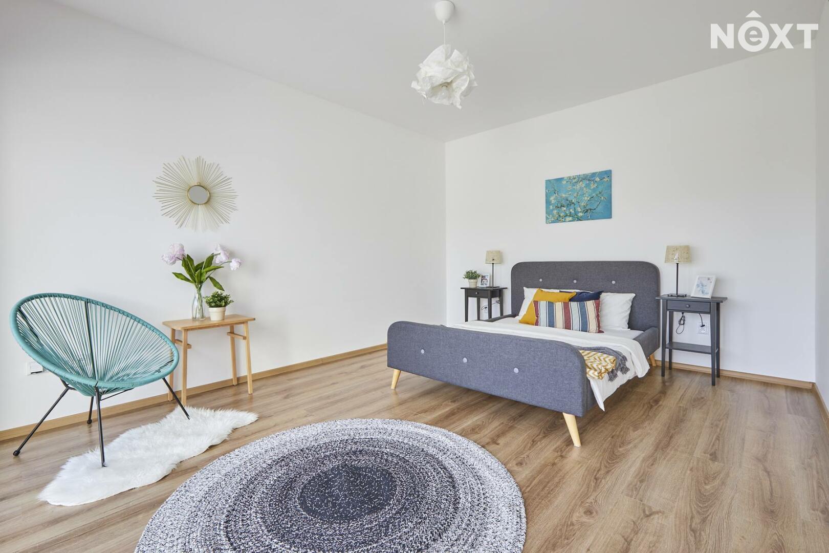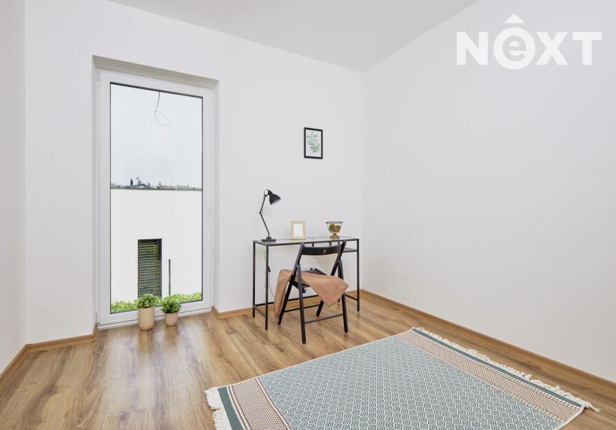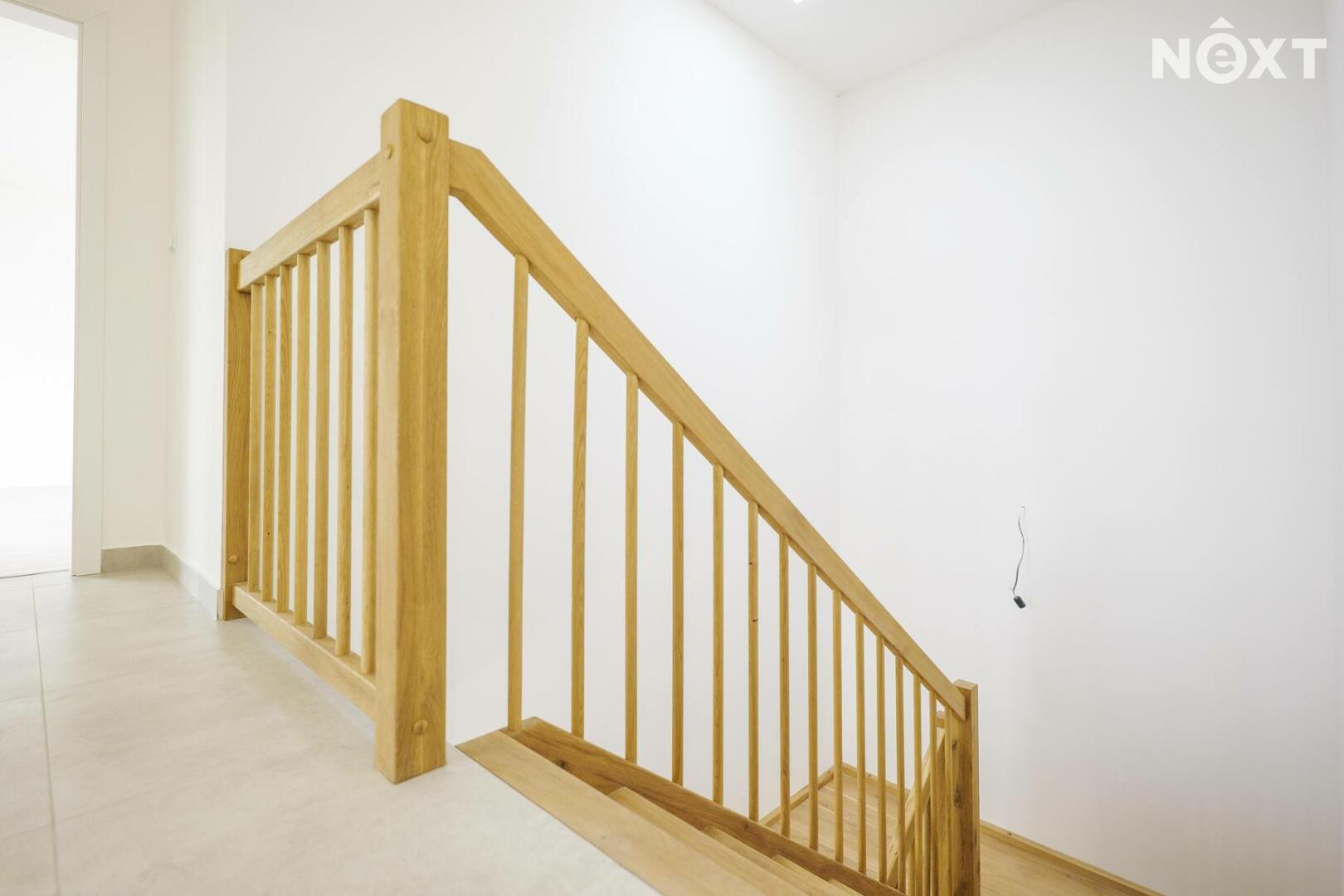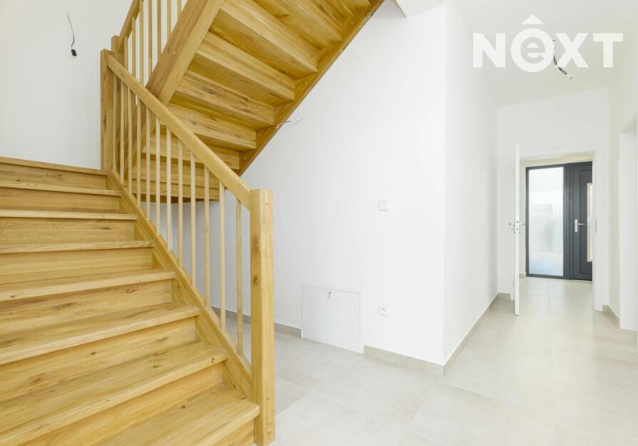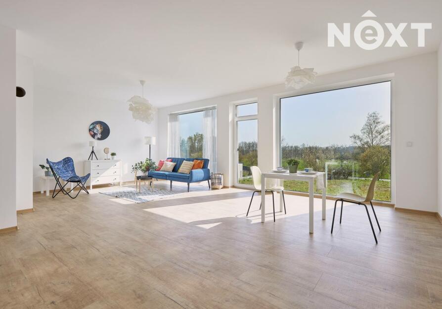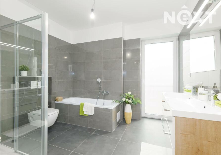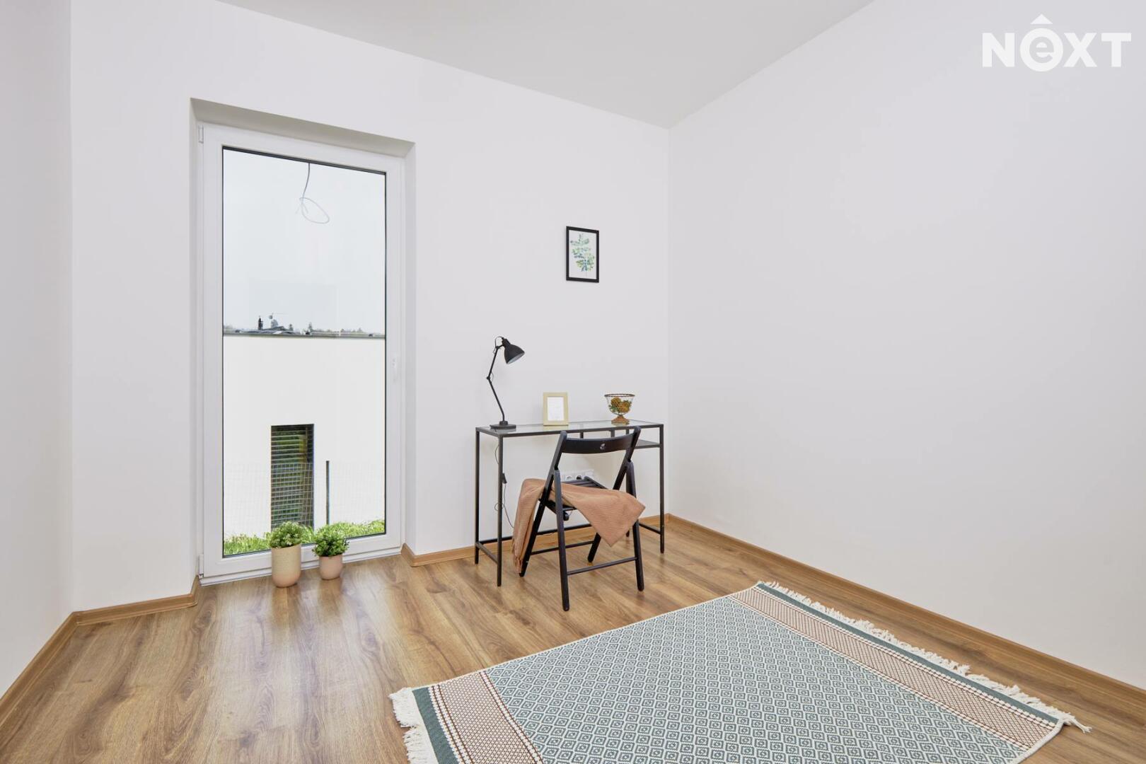 Dominantou bytové jednotky je velkorysý obytný prostor s kuchyní o celkové rozloze 56 m². Díky velkoformátovým proskleným plochám a přímému vstupu na venkovní terasu o výměře 21 m² vzniká přirozené propojení interiéru s exteriérem. Jihozápadní orientace přináší dostatek slunečního světla, klid a otevřené výhledy do okolní přírody. Horní podlaží je koncipováno jako soukromá klidová zóna. Hlavní ložnice o rozloze 24,7 m² disponuje vlastní šatnou (7,1 m²) a vstupem na terasu s výhledem do okolní krajiny. Dva další pokoje o velikostech 21,9 m² a 17,4 m² poskytují dostatek prostoru pro rodinu, děti či pracovnu. Samostatná šatna o rozloze 7,6 m² zajišťuje nadstandardní úložné možnosti a luxusní koupelna s vanou, sprchovým koutem a toaletou (9,8 m²) splňuje vysoké nároky na komfort bydlení. Jednotlivé místnosti propojuje hala o velikosti 24,8 m², jejímž architektonickým prvkem je masivní dubové schodiště, které podtrhuje nadčasový charakter interiéru.
